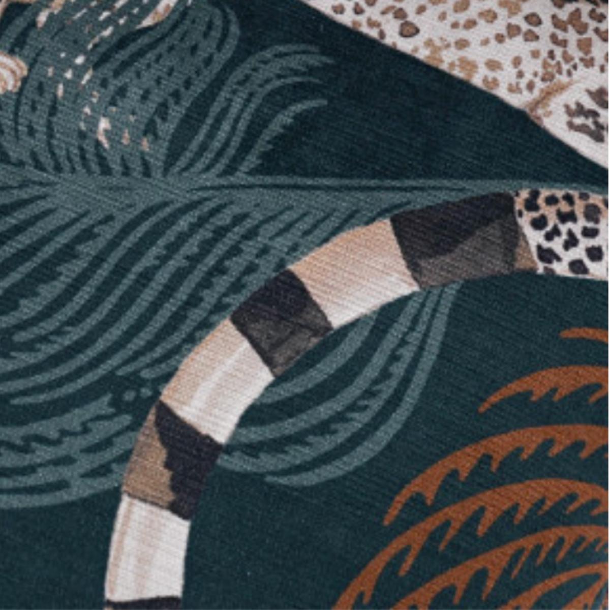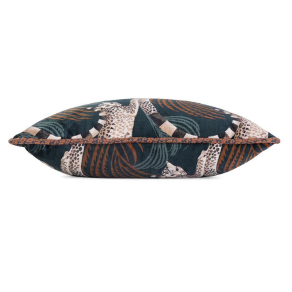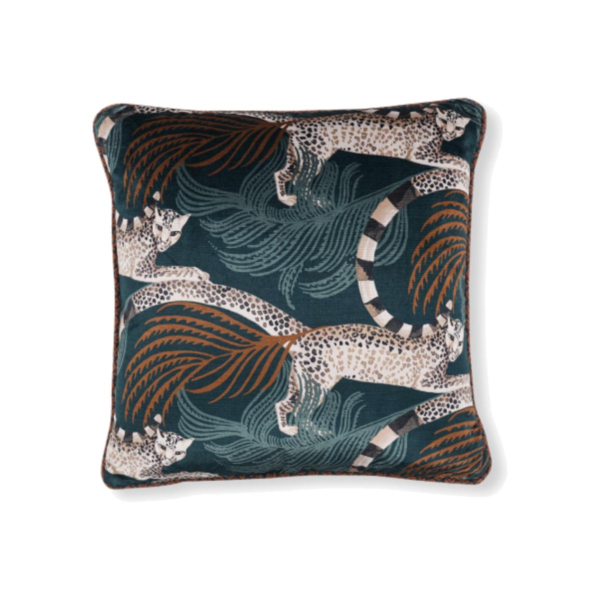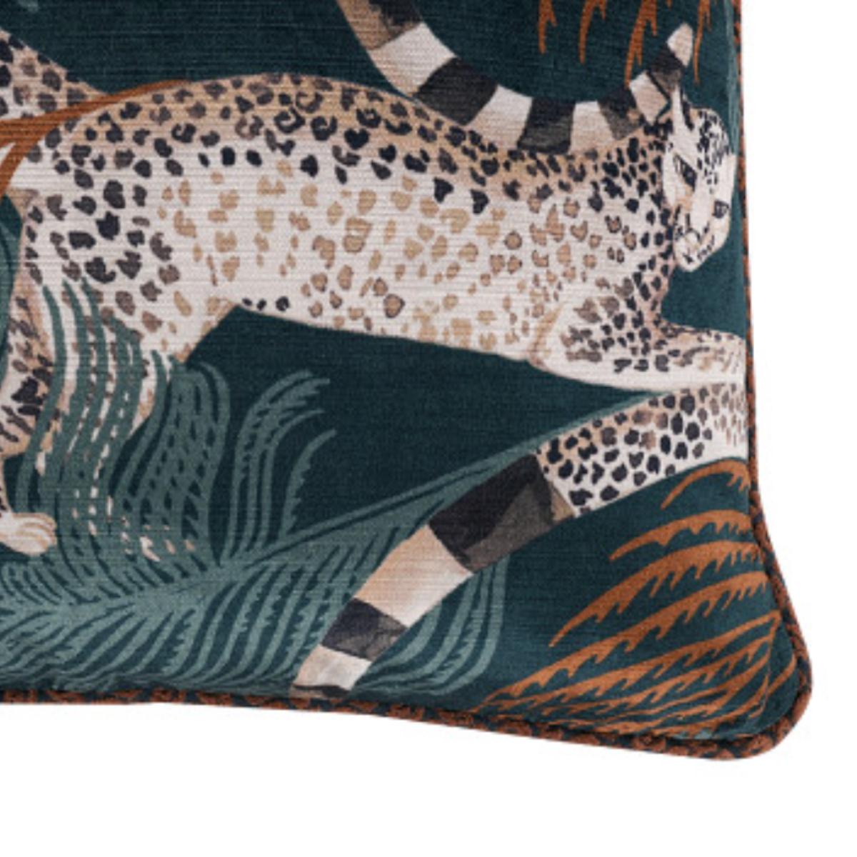 Mystical leopards with lemur tails leap across an indulgent velvet cushion, leaving a stream of feathery plumes in their wake, complemented by a leopard braid piping for the final decorative touch.