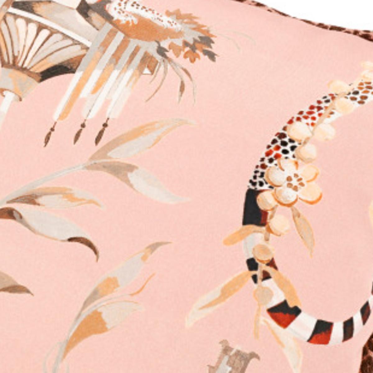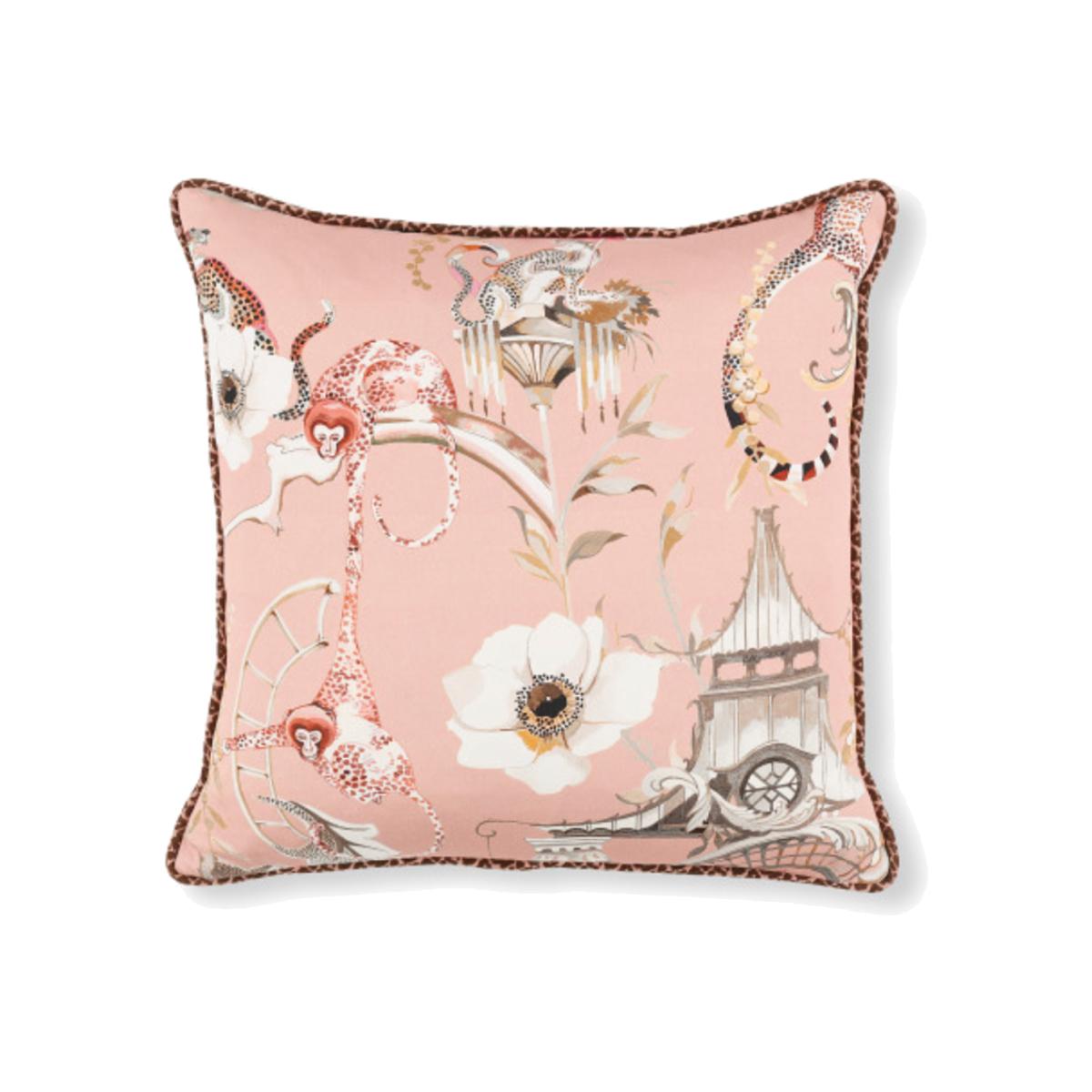 A heady cotton satin cushion with a decorative leopard braid piping that tells a story of parasol wielding leopards and mischievous, swinging monkeys in a world of chinoiserie inspired scenes.