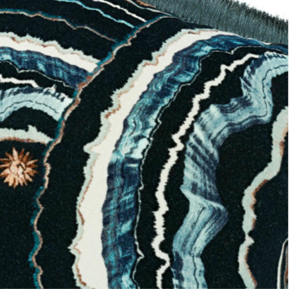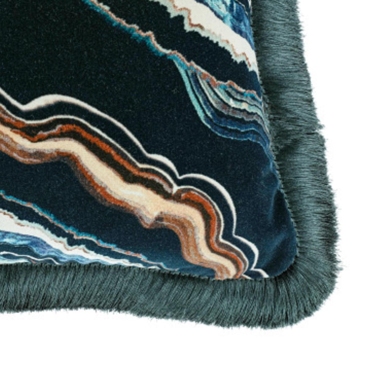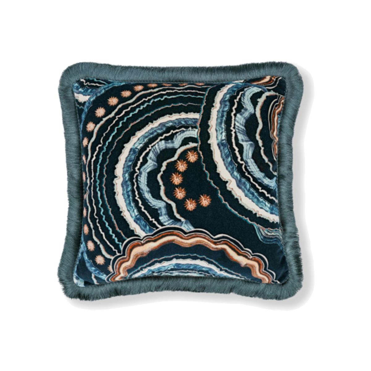 A sumptuous, deep pile velvet cushion featuring a hypnotic display of agate inspired swirls that exude a psychedelic sophistication. Bold and beautiful, a cut ruche fringe adds the final finishing flourish.