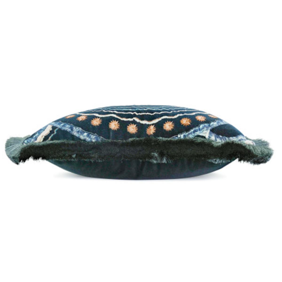 This cushion is a standout piece thanks to its bold, abstract pattern and rich colour palette, making it ideal for adding visual interest to both contemporary and eclectic interiors. I love how it combines luxurious texture with striking design, which can elevate a sofa or bed effortlessly. It works particularly well in neutral schemes where it can serve as a focal point, or in a layered boho or maximalist setting for a pop of colour and pattern. Practical styling tips include pairing it with softer textured cushions or mixing it with other patterns for a curated look. Its size is perfect for adding comfort and style without overwhelming the space.