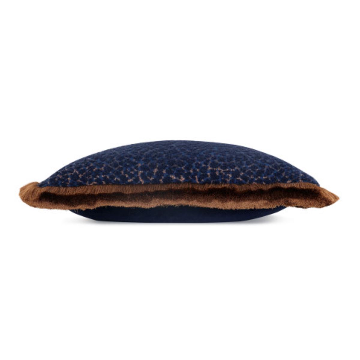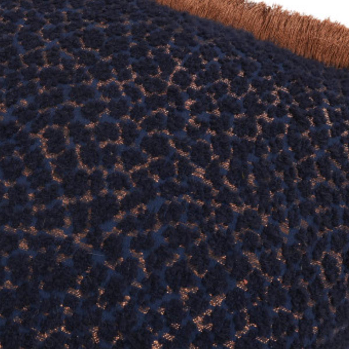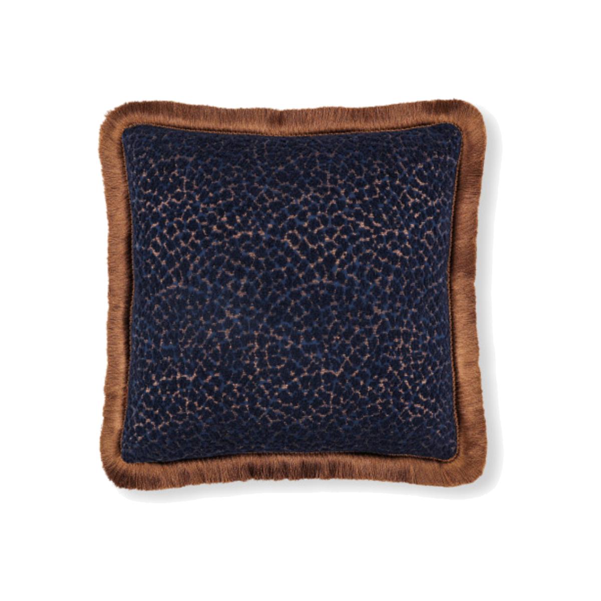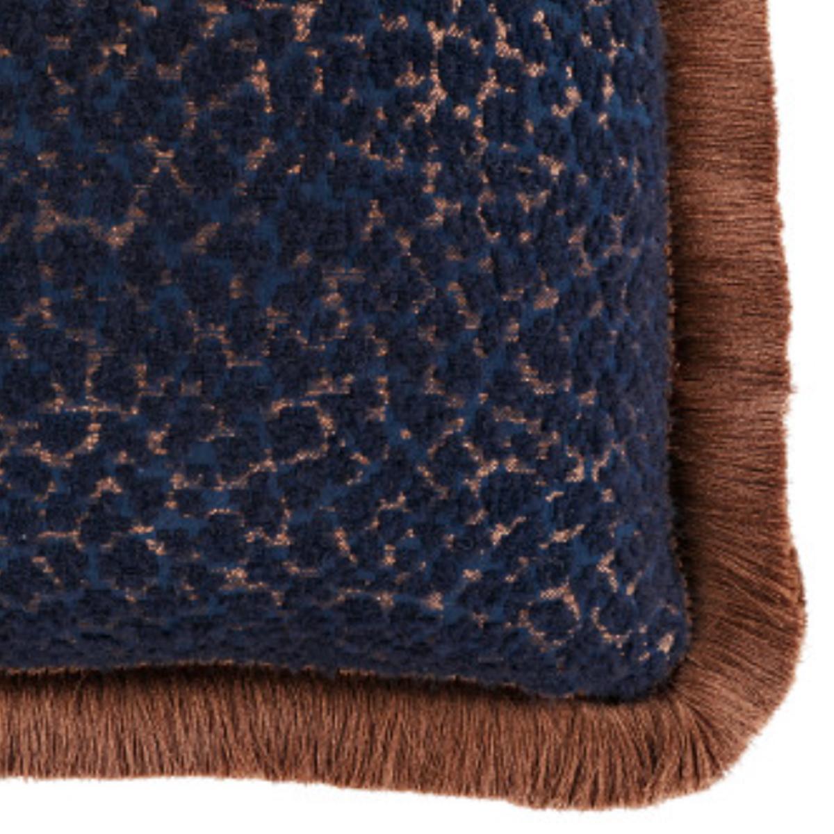 An incredibly soft, textural wool bouclé cushion with a dash of leopard vivacity and a hint of sparkly metallic, embellished by a beautiful, sumptuous cut ruche fringe.