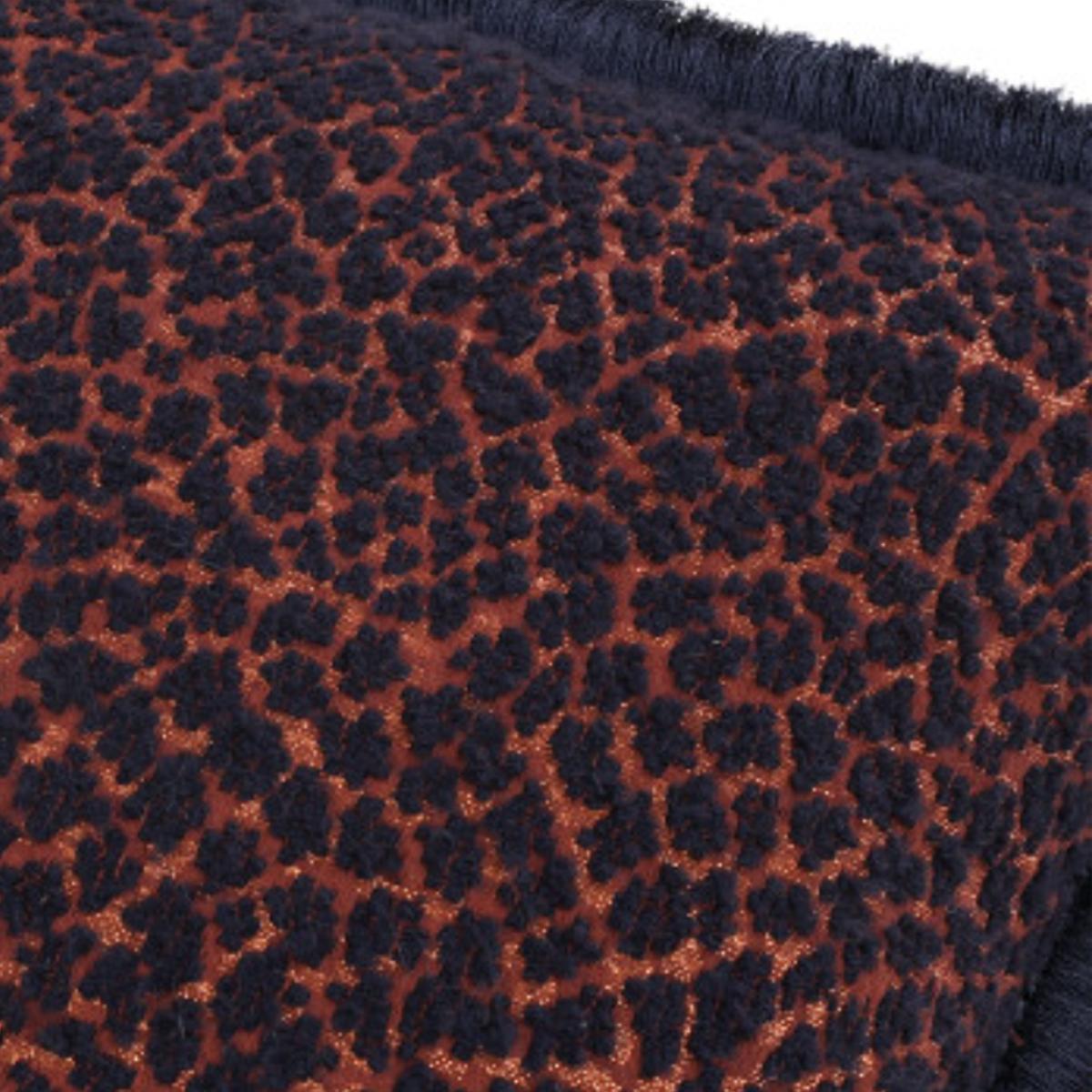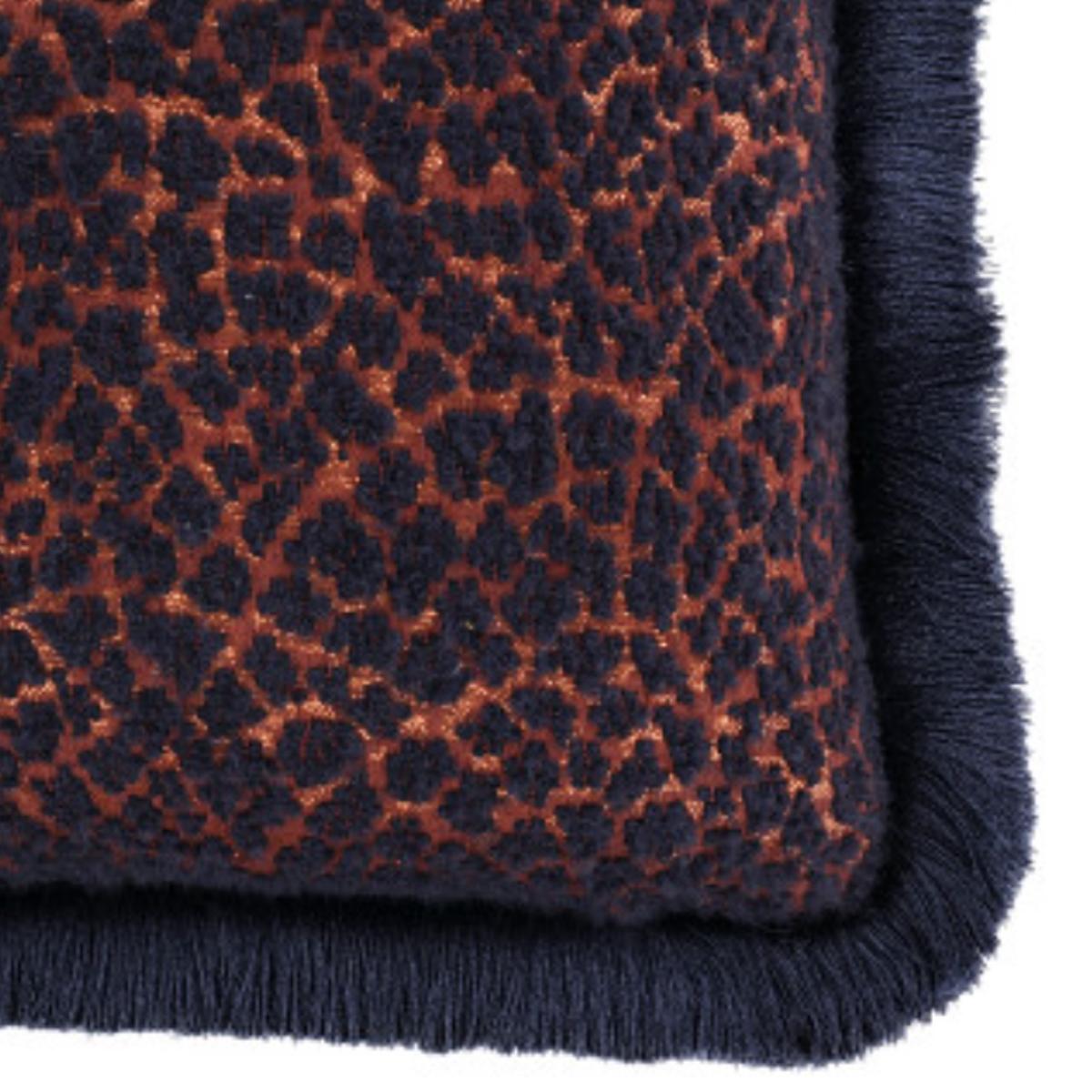 An incredibly soft, textural wool bouclé cushion with a dash of leopard vivacity and a hint of sparkly metallic, embellished by a beautiful, sumptuous cut ruche fringe.