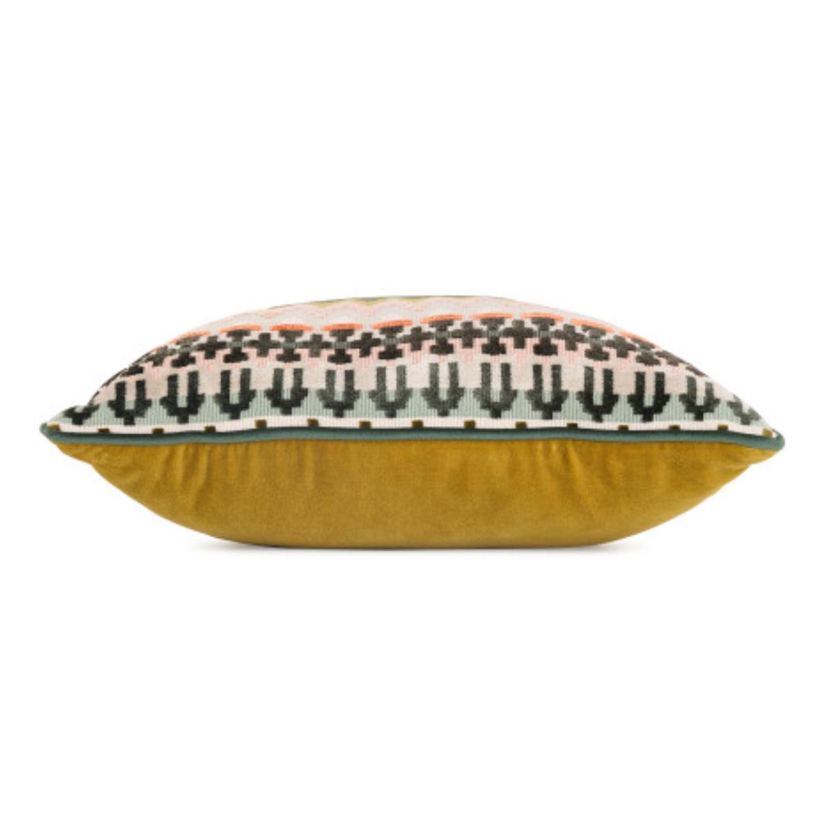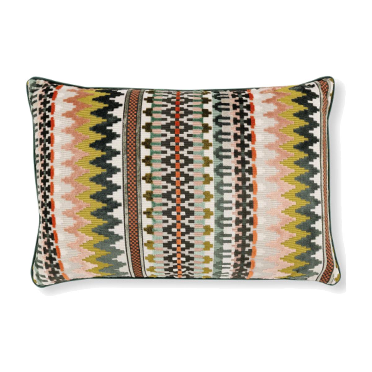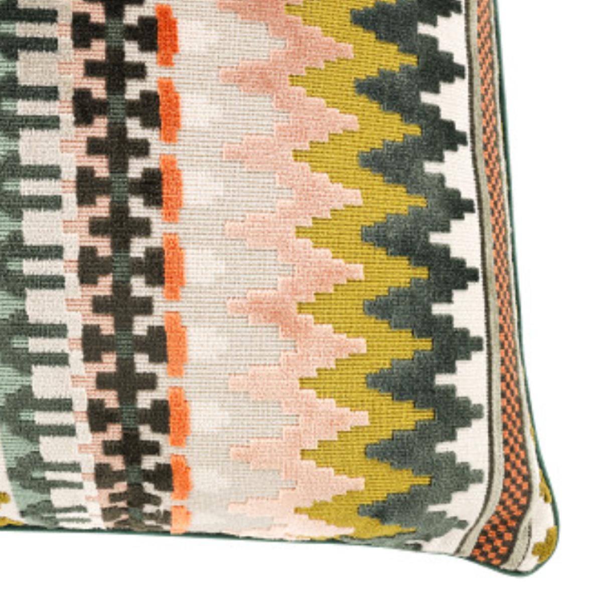 A pretty and playful épinglé velvet cushion that celebrates pattern and colour. Geometric chevrons and graphic shapes form a bountiful stripe design.