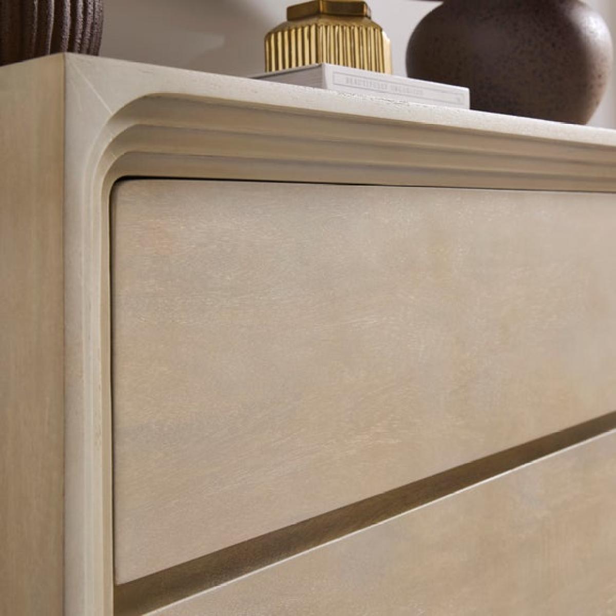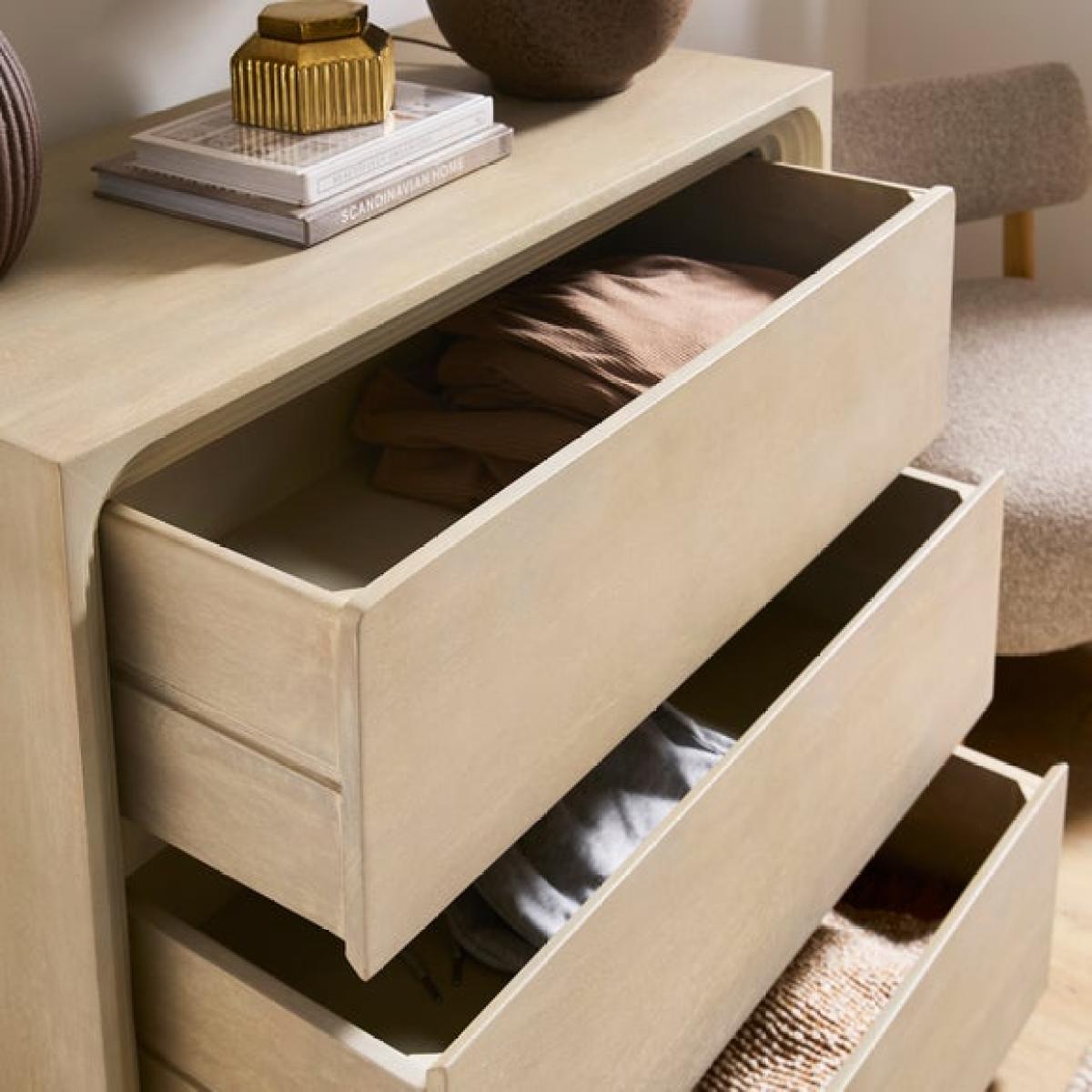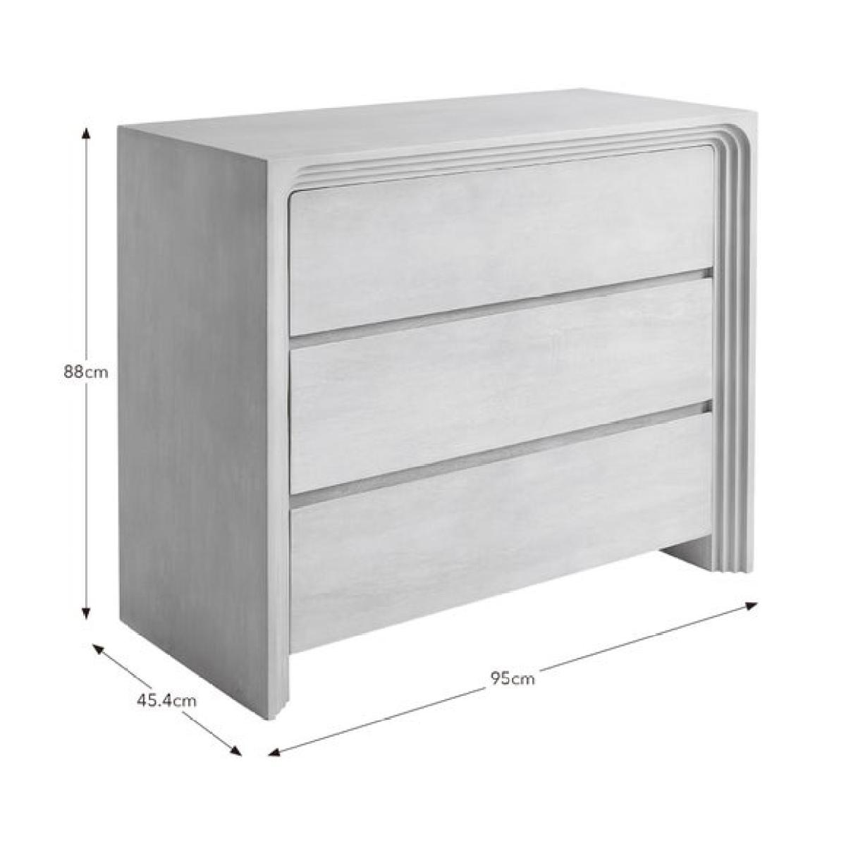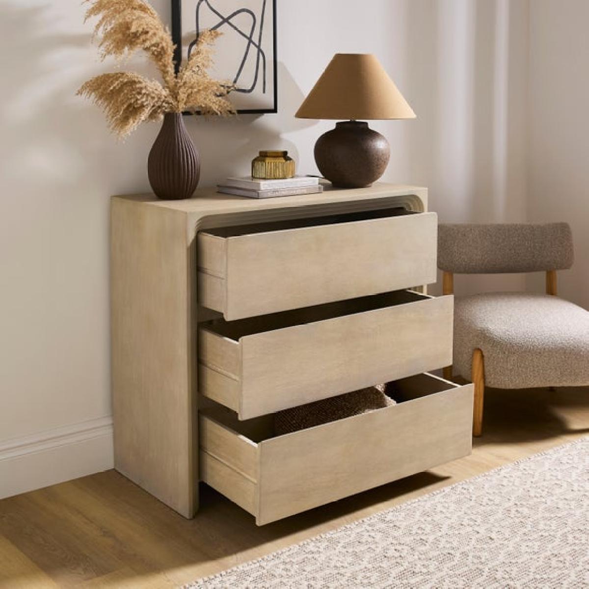 Three drawers for easy organisation Smooth curved edges for a contemporary finish. Neutral tone complements a wide range of interiors. Bring a fresh, modern look to your space with the Romy 3 Drawer Chest. Its soft neutral finish and smooth curved edges create a relaxed feel that works beautifully in any room. Three spacious drawers offer plenty of room for everyday essentials, helping you keep your home neat and organised. The clean design makes it easy to style, whether you prefer a minimal look or layered accessories. Perfect for bedrooms, living spaces, or anywhere you need extra storage without compromising on style.