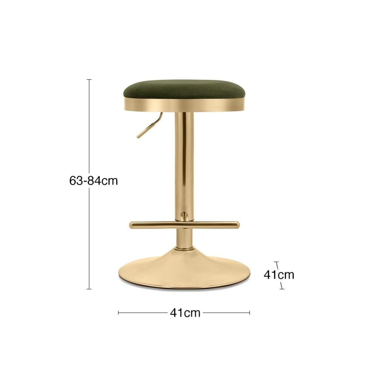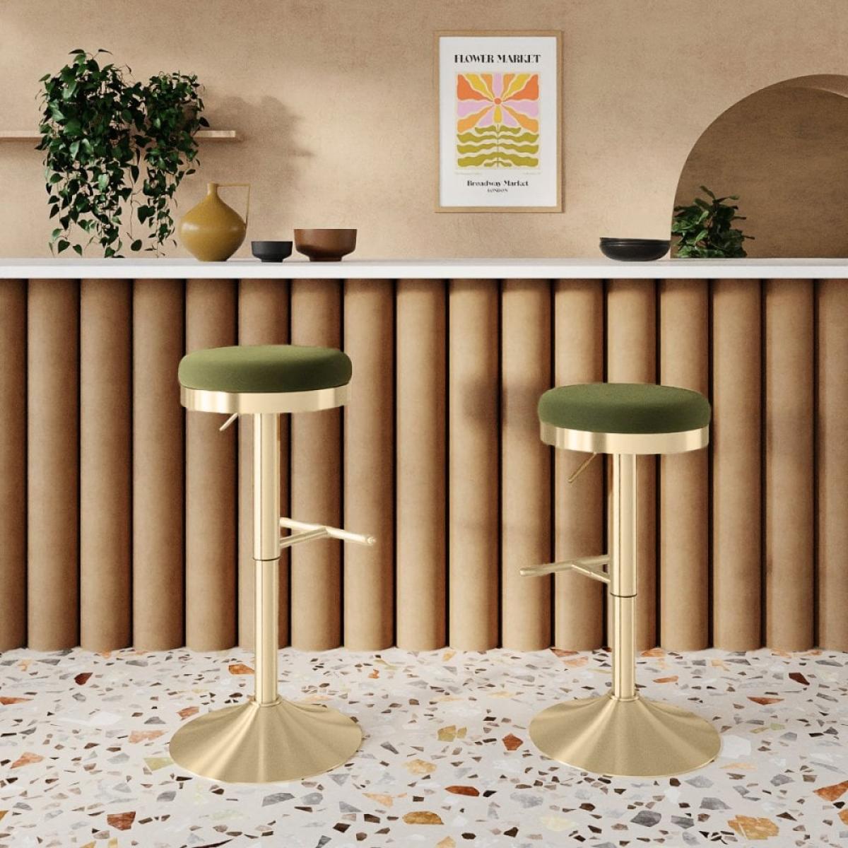 I love this stool for its chic blend of sustainability and style; the olive green velvet adds a touch of sophistication while the adjustable feature makes it very practical. It's perfect for contemporary or eclectic interiors, working well in a kitchen island, home bar, or even a stylish workspace. For styling tips, pair it with brass or matte black accents to enhance its modern look, and consider using it as a statement piece in a neutral-toned room for colour pop. Its adjustable height makes it versatile across different settings, and the green velvet offers a lush texture that can elevate softer fabrics like linen or cotton in the surrounding decor.