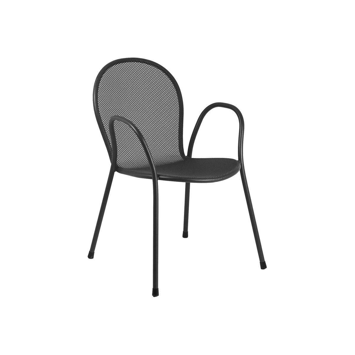 A stackable armchair with a curved form. It is characterized by the solidity of the design and structure. The perforated motif gives rise to exciting games of light filtered through the transparencies of the coloured sheet metal.