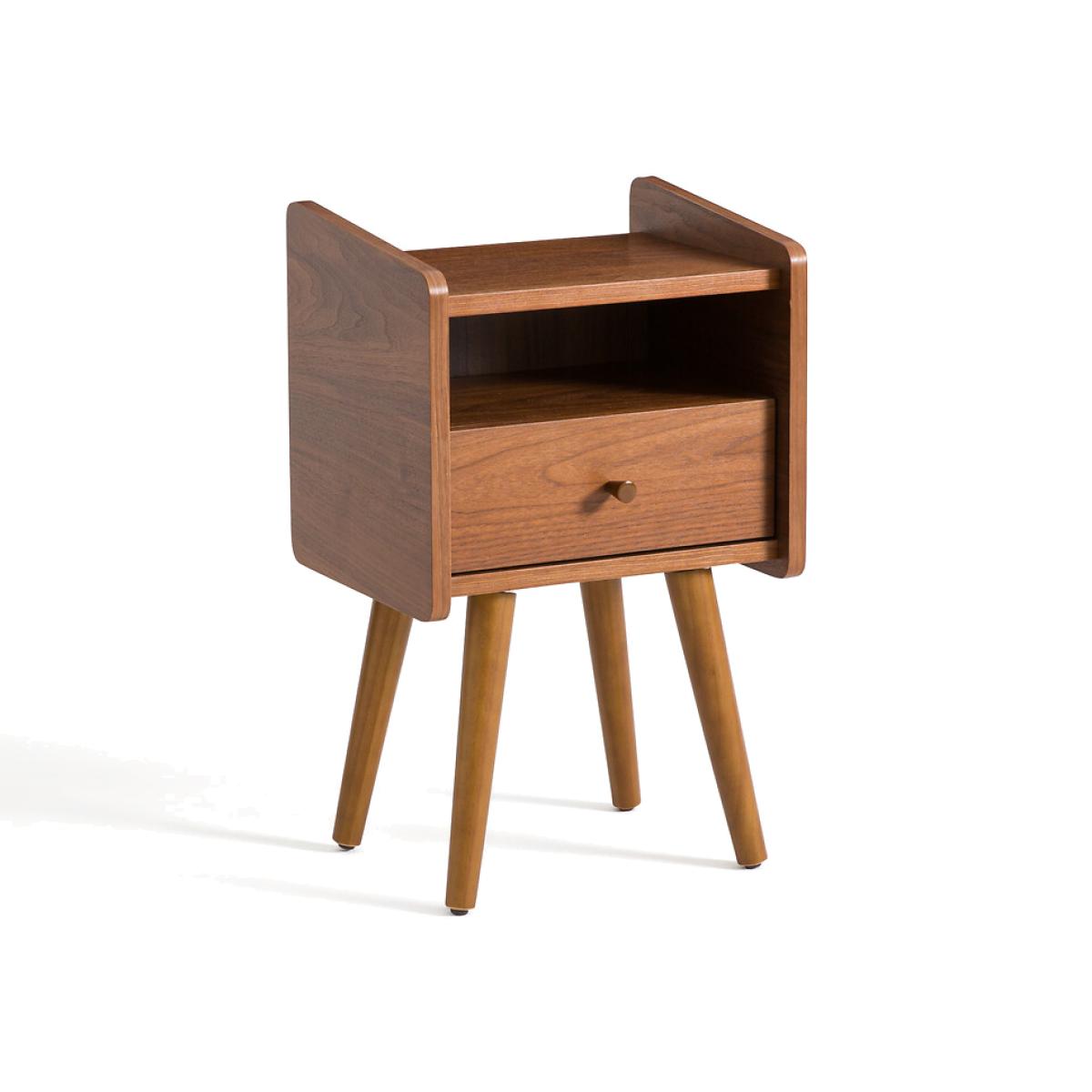 Brazilian-inspired, its revisited style has everything to appeal to lovers of vintage furniture!Product Details • 1 drawer & 1 compartment • 4 tapered legs • Walnut veneered MDF cabinet • Nitrocellulose varnish lacquered drawer front • Walnut stained solid pine legs • Nitrocellulose varnish finishDimensions. Total: • Width: 38.6cm • Depth: 31cm • Height: 63.5cm. Usable dimensions: • Compartment: L35 x D23.5 x H10.5 cm • Drawer:L32 x D19 x H7.5 cm • Shelf : L35 x D27 cm • WOOD FROM SUSTAINABLY MANAGED FORESTS. FSC® certified wood comes from forests that are environmentally, socially and economically well managed. Parcel Dimensions:1 parcel • • L54 X D36 X H15 cm • 9.7kg