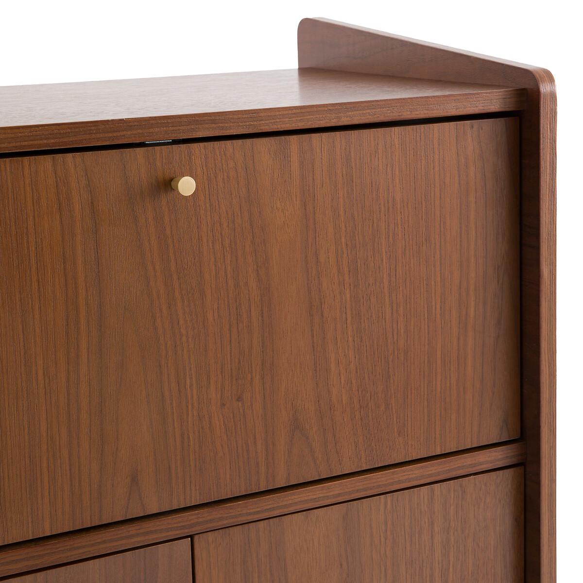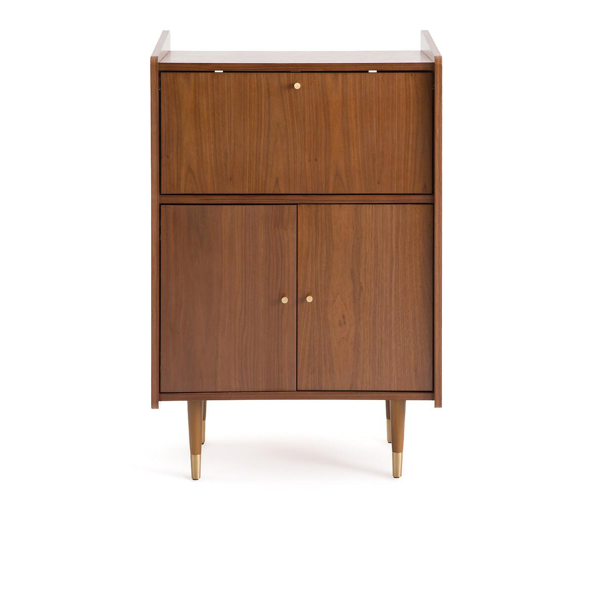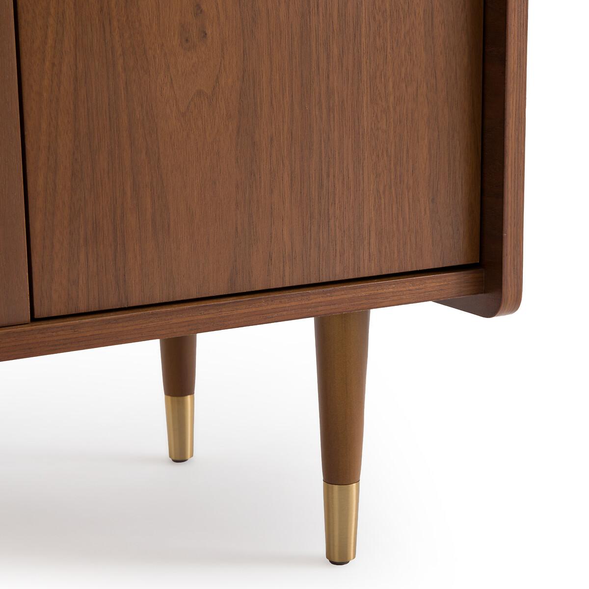 Walnut veneer, brass details... With its lines inspired by 60s furniture, the Ronda bar cabinet immediately creates a vintage atmosphere in the living room. Functional, it opens onto a beautiful storage space:at the top, behind its flap, for the glasses; at the bottom, behind its 2 doors, for the bottles. Designed by La Redoute Interiors. Product Details • 1 Flap door • 2 doors with soft-closing system • Cabinet in walnut veneered MDF with a nitrocellulose varnish finish • Conical legs in solid pine, nitrocellulose varnish finish • FSC® Mixed certified wood • Brass-finish button handles and foot tips • Polypropylene glides. Quality Info • Soft-closing : soft, silent door closing system, also preventing fingers from being trapped. Dimensions Overall • Width: 70cm • Height: 108cm • Depth: 44cm. Usable space • Drawer: L66.8 x H30 x D44cm • Compartments : L66.8 x H22.3 x D44cm • Base height: 20.7cmDelivery:. This product required assembly. Available for home delivery. • WOOD FROM MORE SUSTAINABLY MANAGED FORESTS AND CONTROLLED SOURCES. FSC® Mix wood contains at least 70% FSC® certified and/or recycled wood, the remainder being FSC® controlled wood. Dimensions and weight of parcel1 parcel • L104 x H20 x D53cm. 35kg