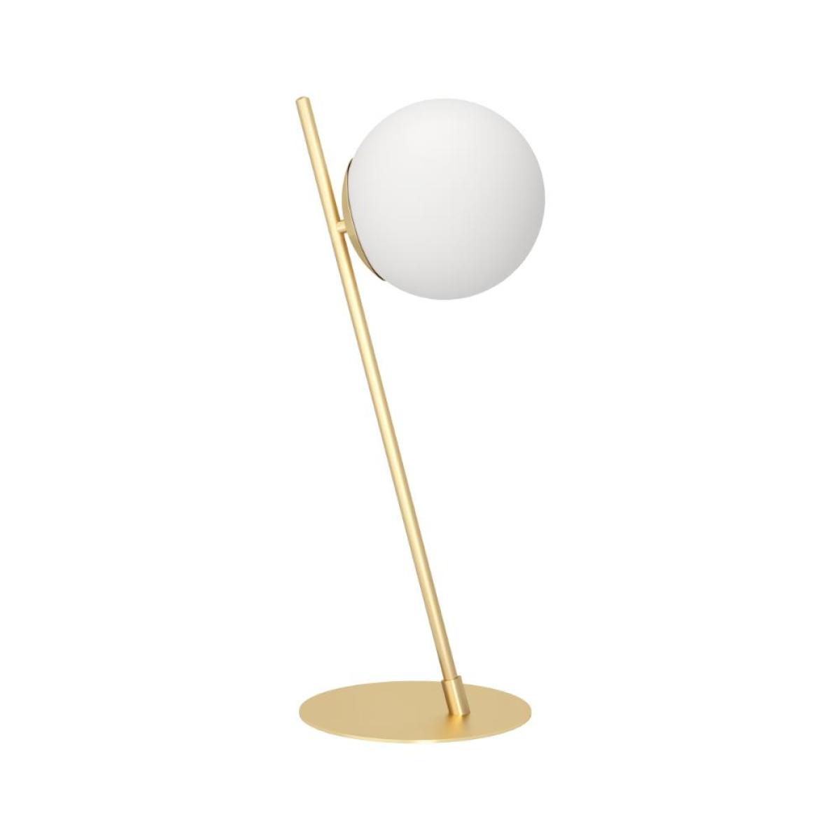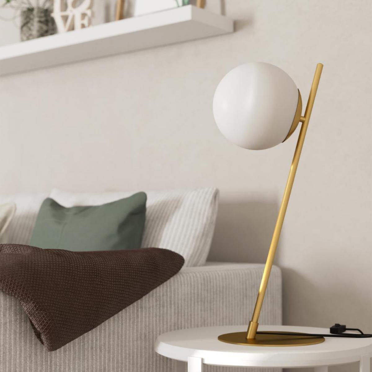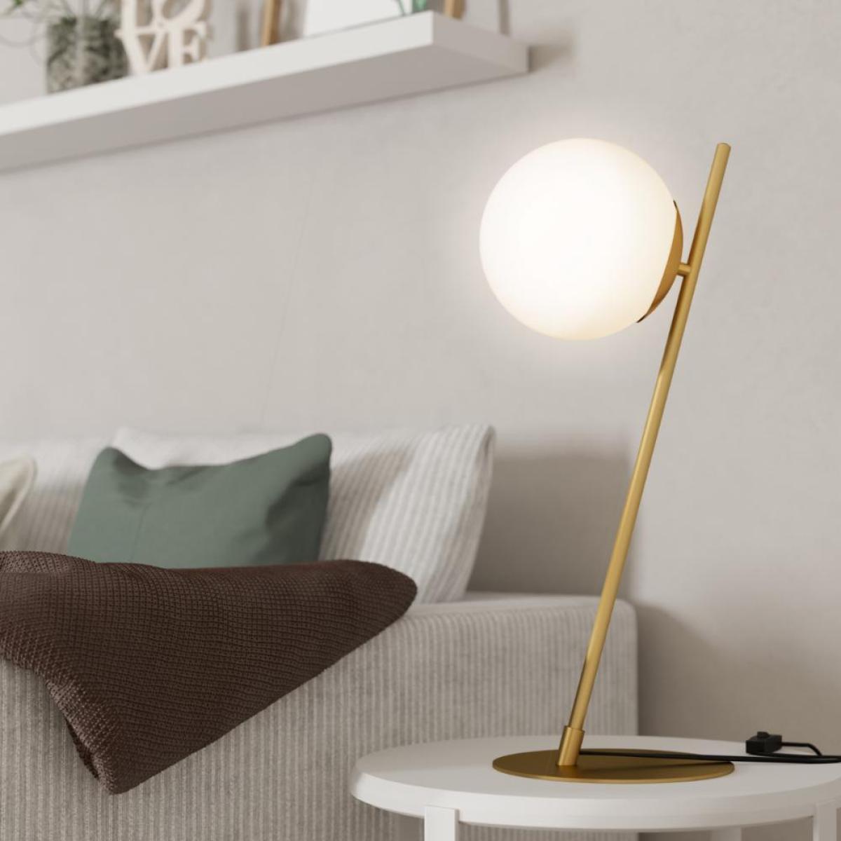 The consists of a round flat metal base in brushed brass with a rod attached at a dynamic angle and an opal matt glass ball. The retro table lamp fits elegantly into various interior styles and can be conveniently switched on and off on the cable via a switch. It offers stylish lighting for any room, whether in the bedroom on the bedside table, living room, dining room or hallway.