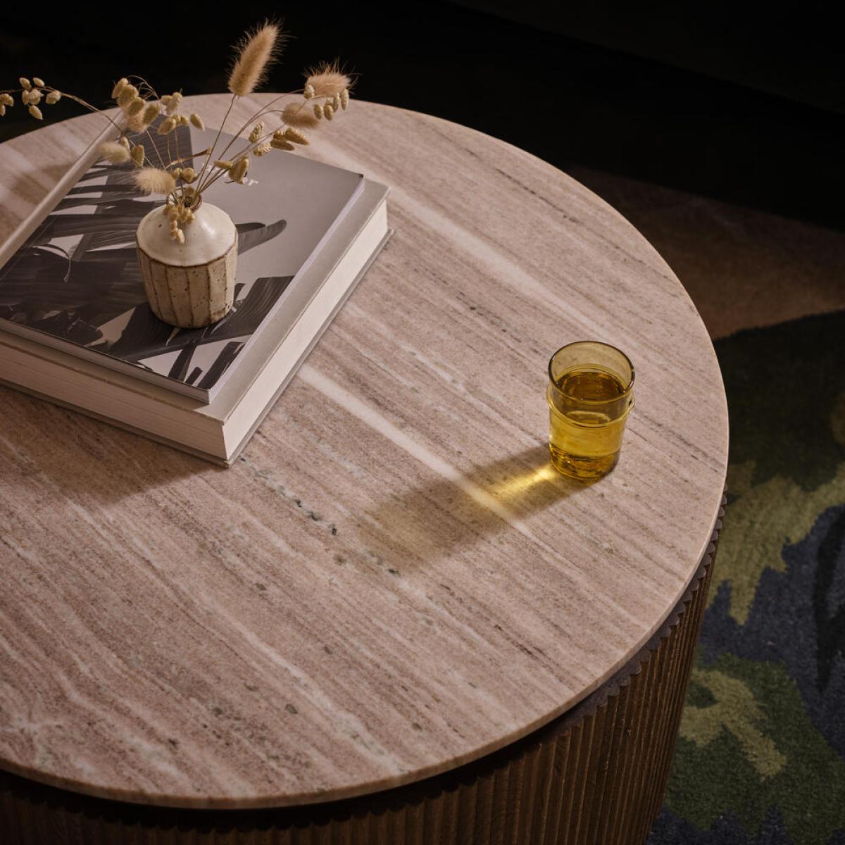 Understated yet with a statement look and luxury feel, our Rondo Marble Coffee Table combines a sturdy round textured base made from sustainable mango wood with a warm-toned marble top and discreet antique brass detail running around its perimeter. The warm mocha marble top has neutral brown details running through it that gives it a retro contemporary look and has a real depth of character with each piece of marble being unique. Its low-level design makes it perfect for laid-back living rooms and open-plan spaces while its natural materials bring warmth and character into any interior. Also available as a matching side table.