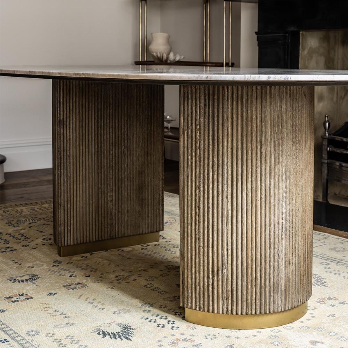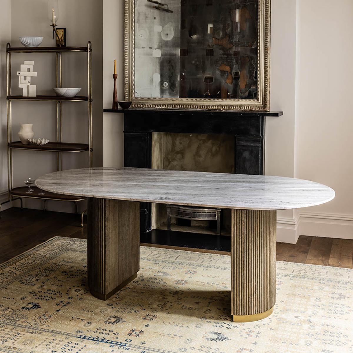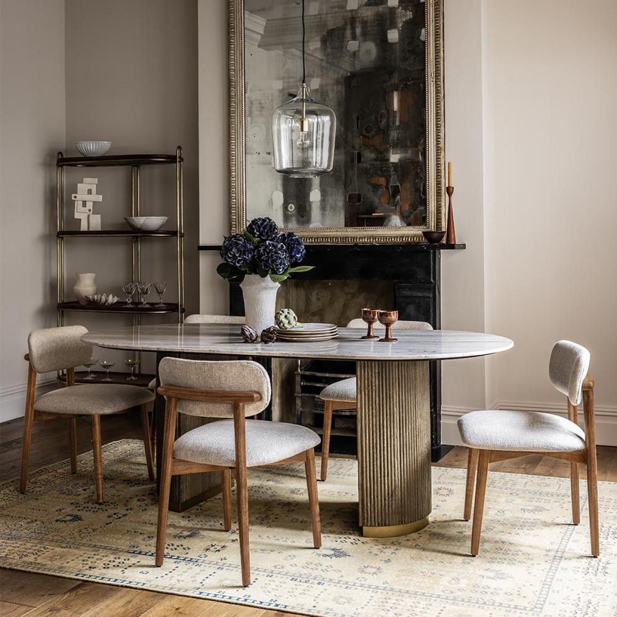 Nothing days ‘quiet luxury’ quite like Rondo. Understated in design while still demanding attention, this large oval marble dining table features a sturdy textured base made from sustainable mango wood topped with a luxurious marble top. Because it’s a natural material, the mottled veining and colours featured are unique to each, meaning no two are ever exactly the same. The antique brass detail adds the finishing touch. But this modern marble dining table isn’t just about sophisticated good looks: the capsule shape means it can accommodate up to six of your nearest and dearest – sure to make for glamorous gatherings. Complement with the Rondo desk as a nearby serving station, or team up with the coffee and side tables for a cohesive scheme.