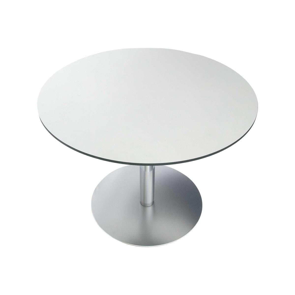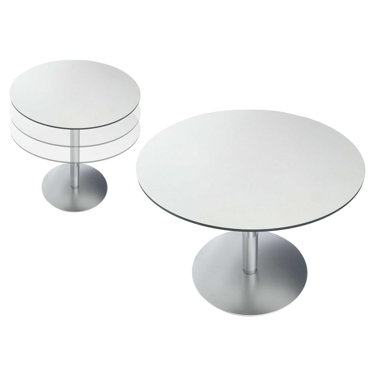 Table with plywood top, blanched oak veneered, oak stained dark walnut or white laminate with bevelled edge. Metal base covered in stainless steel, leg in mat chromed metal.