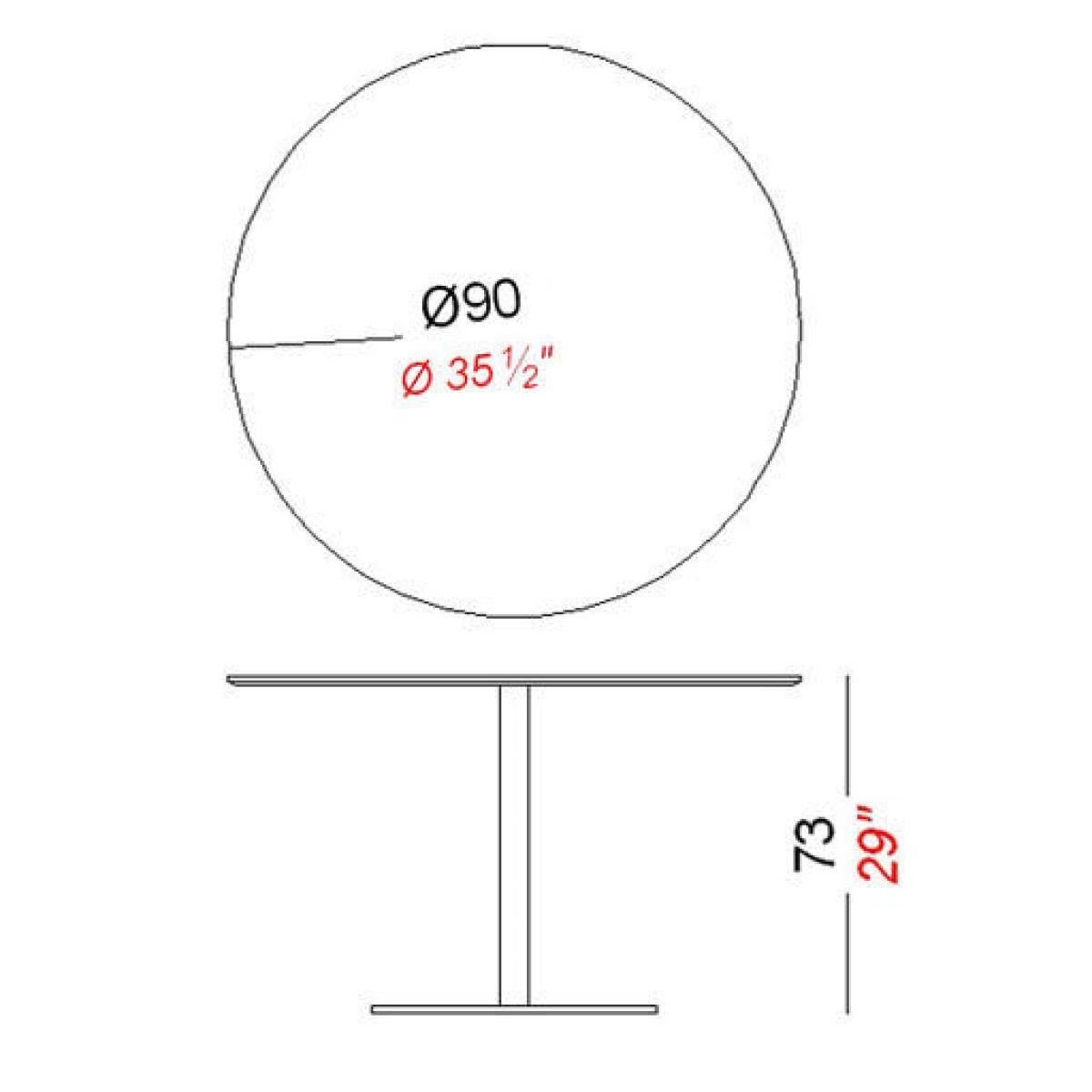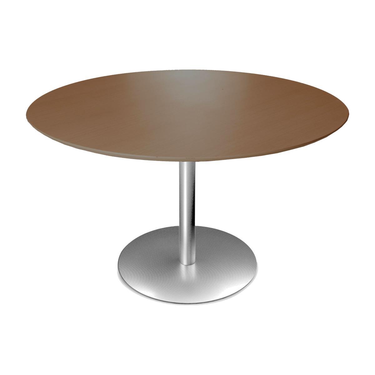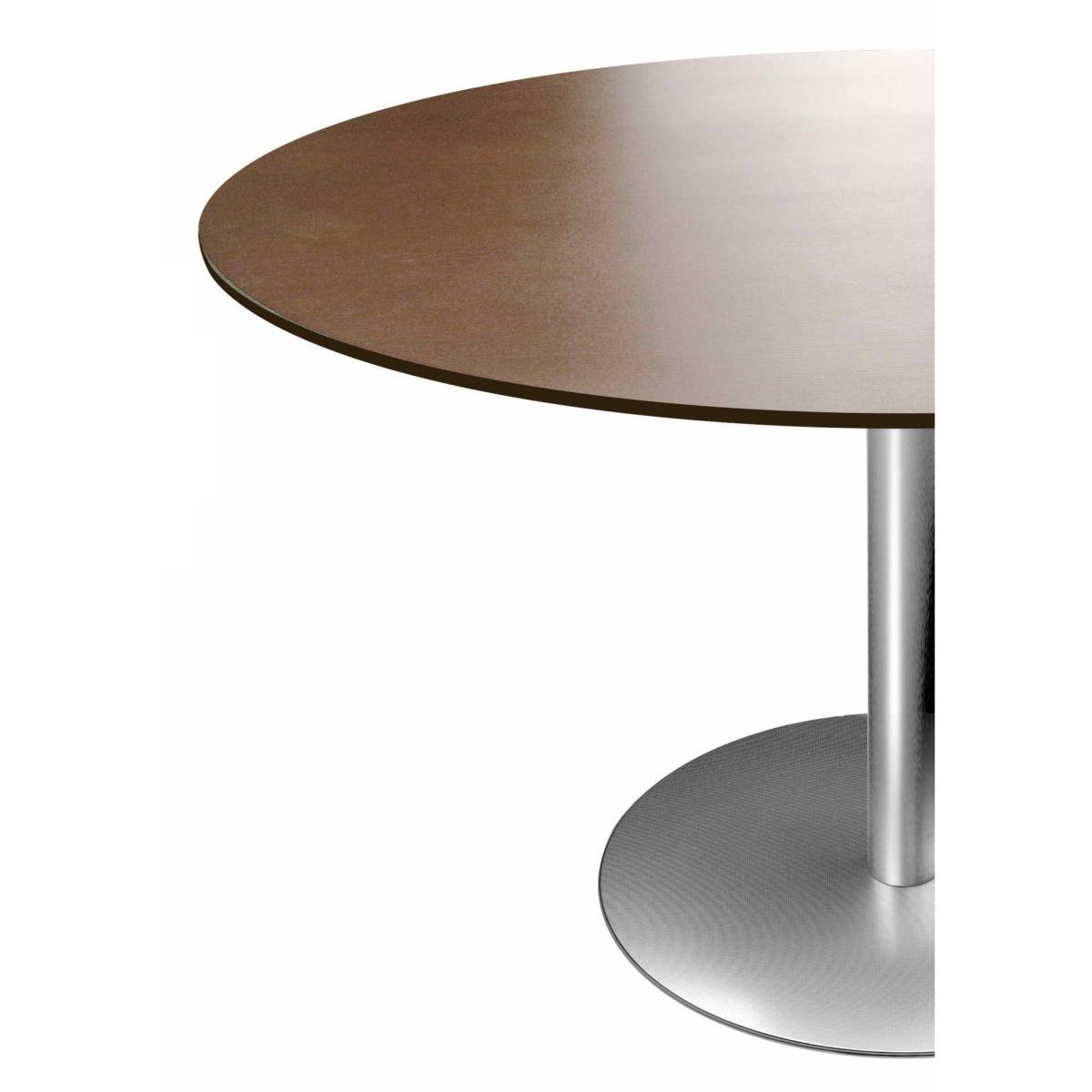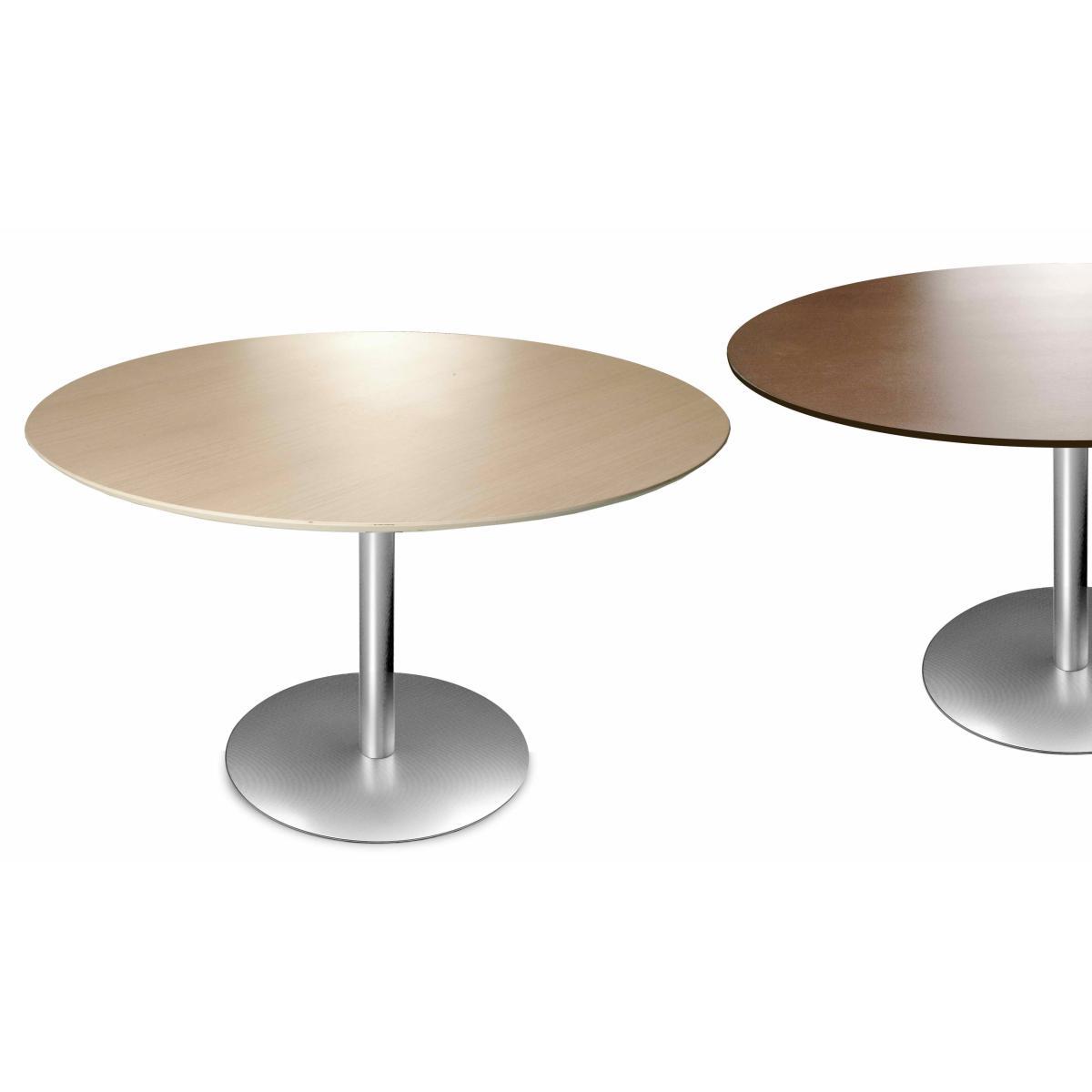 Table with plywood top, blanched oak veneered, oak stained dark walnut or white laminate with bevelled edge. Metal base covered in stainless steel, leg in mat chromed metal.