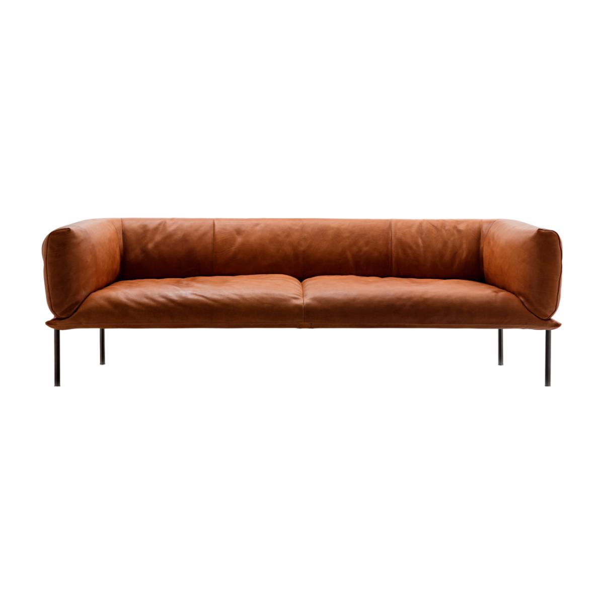 Part of a collaboration between renowned British designer Lucy Kurrein and Trentino-based design house Molinari Living, the Rondo sofa celebrates the art of leather working and is exclusively available at The Conran Shop. Inspired by boxers' punching bags, the Rondo sofa is upholstered with premium quality Nobilis Tegola leather in a rich tan hue. Resembling the form and premium thickness of a punching bag, the leather Rondo sofa transforms the aesthetic of the sporting accessory into a contemporary masterpiece; its soft cushioning is emphasised by the black metal frame, which presses into the leather on either side, inviting you to relax into it. An homage to leather's indulgent, subtle strength and versatility, the Rondo sofa is an elegant design that will develop a rich patina over time, only getting better with age. Also available in an armchair edition.