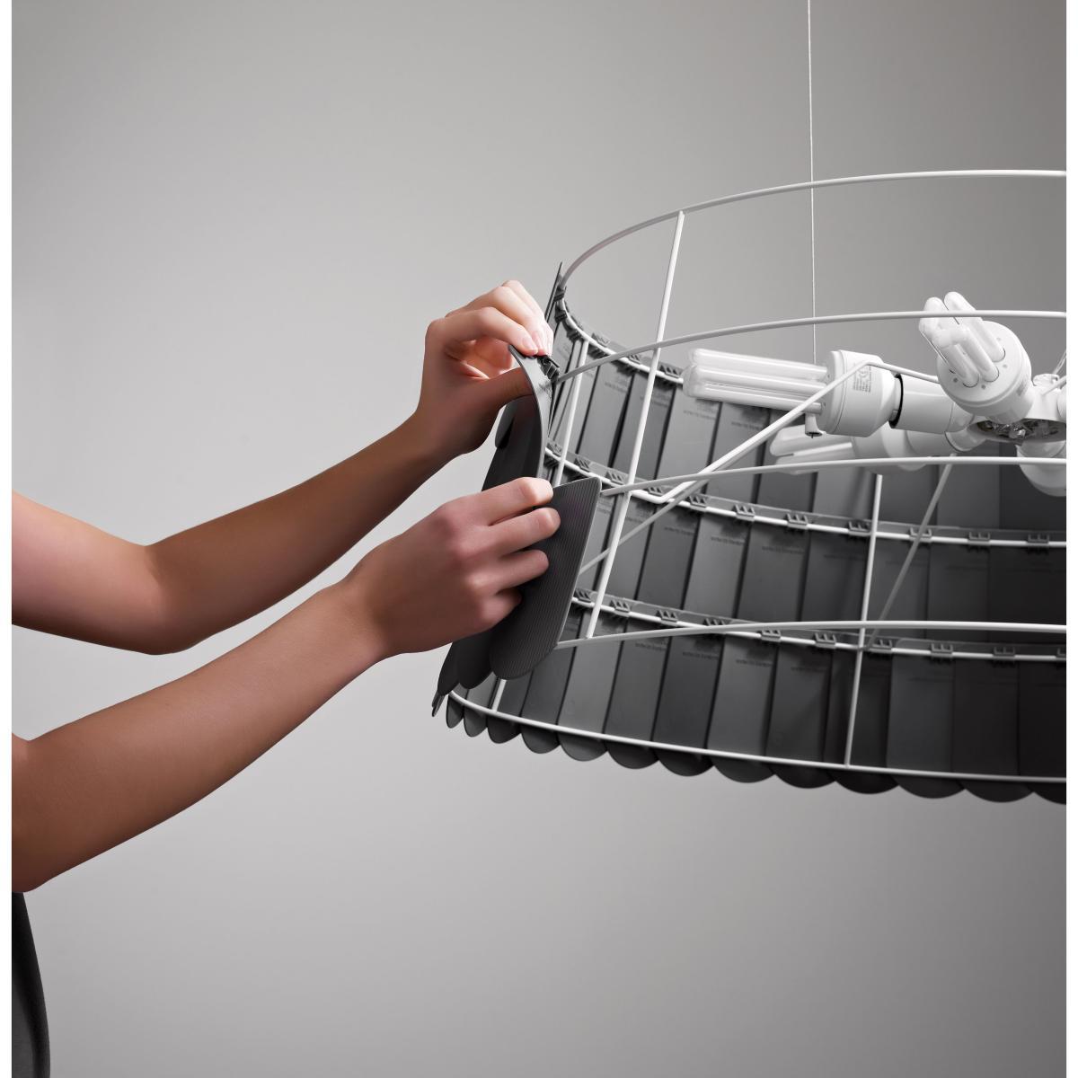 Italian lighting brand Fabbian presents a collection of pendant lamps covered in silicone tiles by London designer Benjamin Hubert. Called Roofer, the design comprises a series of wire frames over which users hang modular grooved components in graduated colours.