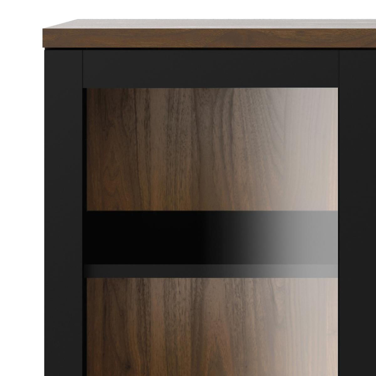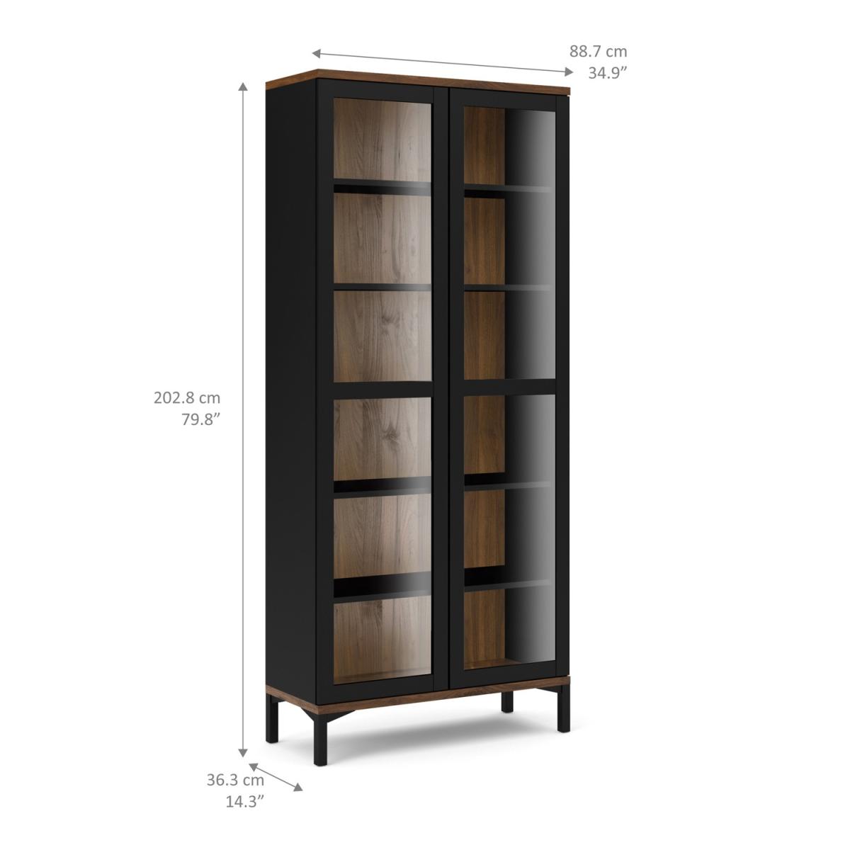 Dimensions H202.1 x W88.7 x D36.25 cm. The Roomers display cabinet features 6 shelves perfect for displaying books trinkets photo frames and personal items beautifully. Features. The Roomers display unit is the perfect place to show off your items. High quality fixings and hinges used throughout. Made from high quality laminated board which is resistant to damage and scratches moisture and high temperature. Tempered glass. Finished in black and walnut to ensure it will suit most interiors. Assembly required..