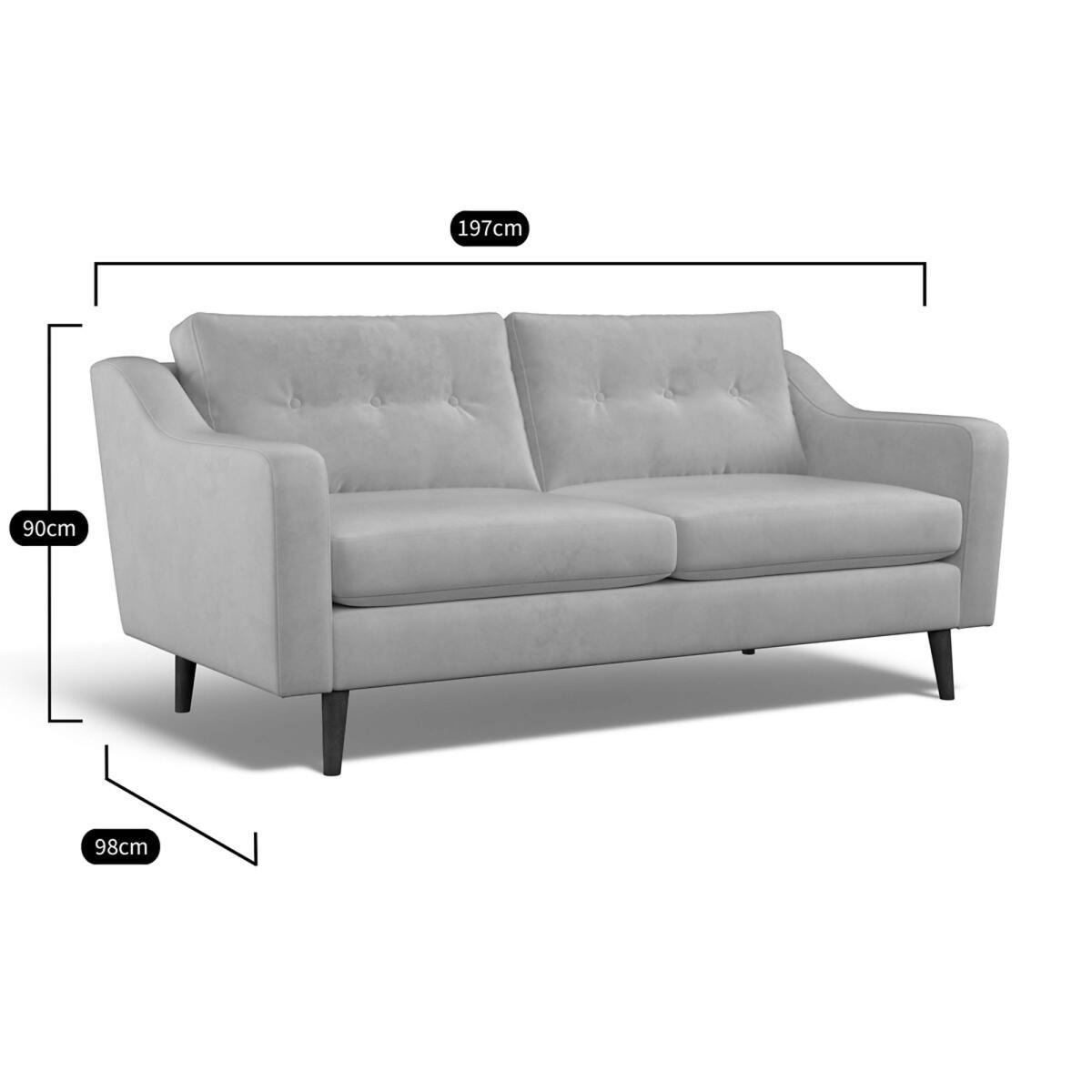 The Rosa Buttoned combines modern family comfort with a timeless button back design. The long sloped arms and tapered wooden legs give a retro look that’s perfect for a contemporary home. If buttons aren’t your thing, the Rosa is also available with a standard back. Choose from our soft brushed fabric for ultimate coziness, soft woven for a textured look or velvet for luxe living. All made to order sofas are carefully manufactured in the UK.Each hardwood frame is dowelled, glued, and screwed before being paired with the finest fabrics and fillings. And it doesn't stop there - for customer peace of mind and safety, all frames and fabrics are rigorously examined, inspected, and tested to the highest standards. Product Specifications:. Product Dimensions: H 90cm x W 197cm x D 98cm. Fabric: Velvet - 100% Polyester. Feet: Light Wood Packaged Dimensions: 198cmx99cmx73 - Please remember to measure your available space before ordering. The Rosa Range is also available in Velvet & Soft Brushed in a variety of colours. This product will be dispatched by one of our trusted suppliers. You’ll be contacted by their selected courier about your delivery. Your product will be delivered to your room of Choice. The feet for the product will be assembled once delivered.