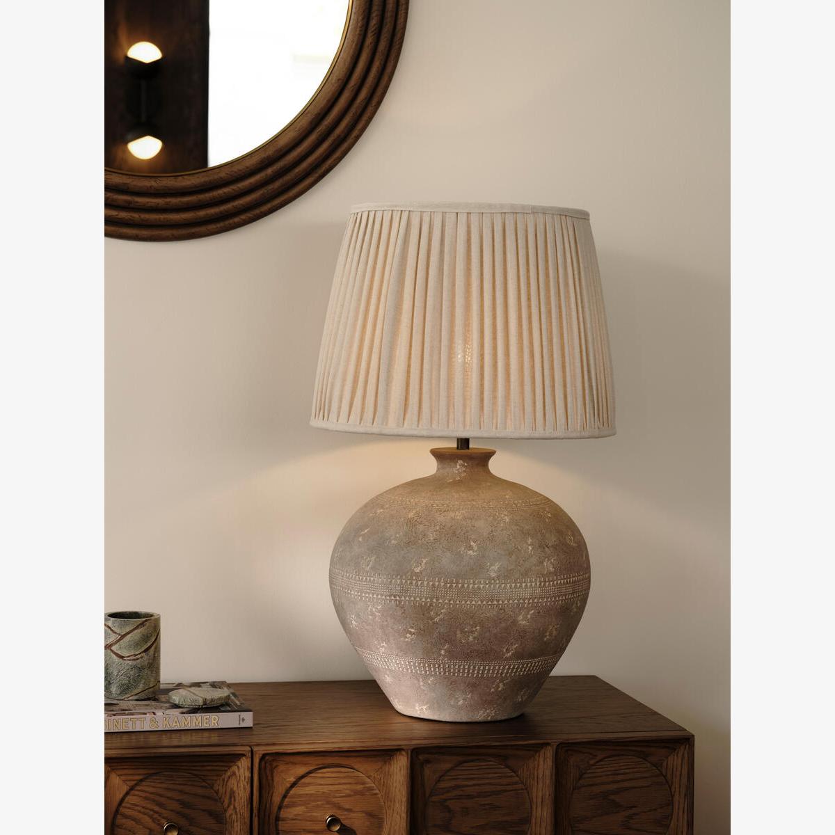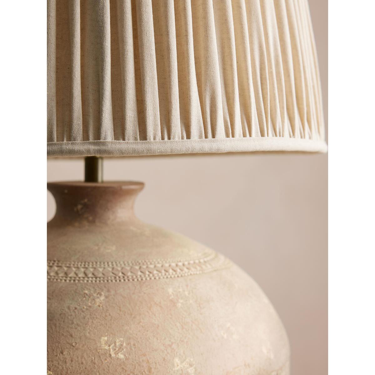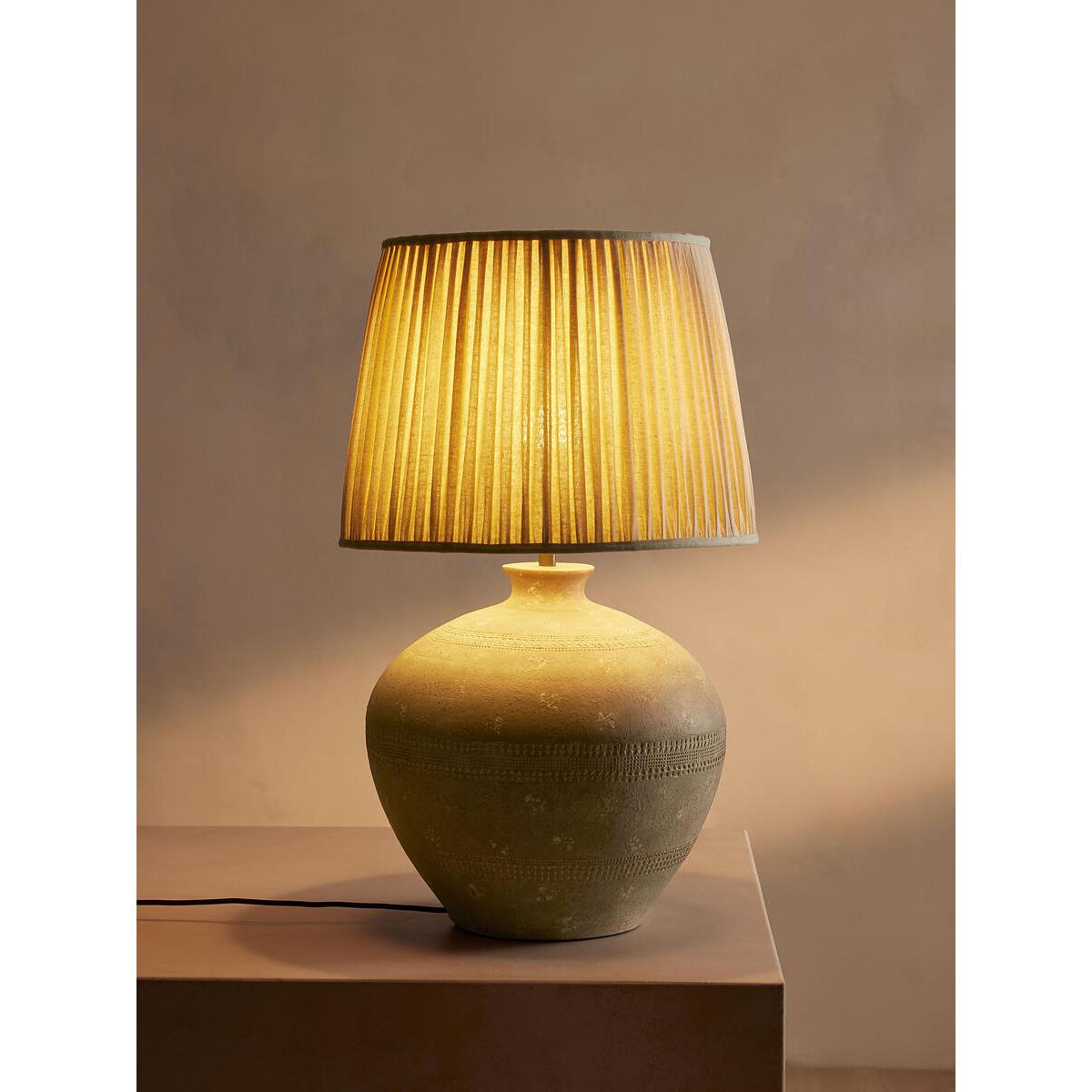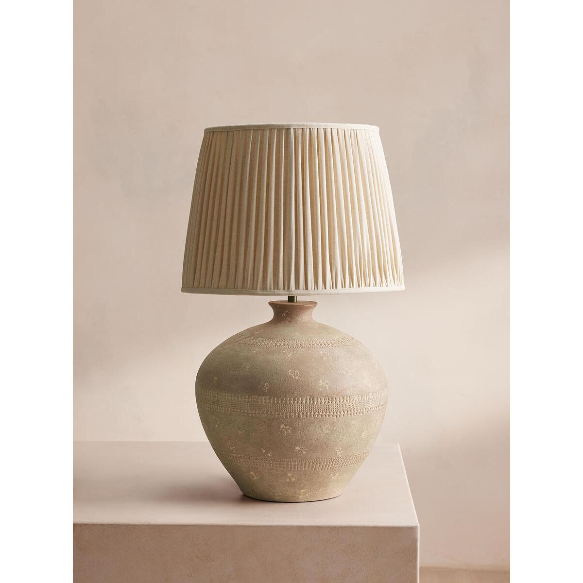 Referencing the natural tones at Soho Farmhouse, the Rosa table lamp features a hand-pleated linen shade, which has been hand-stitched over the metal frame. The handmade embossed pattern on the base is created by hand using a sponge, and washed with a matte textured glaze for an organic finish. Each piece will be truly unique due to handmade nature of the detailing. Hand-pleated and stitched linen shade Hand embossed pattern Organic texture Matte textured glaze Inspired by Soho Farmhouse