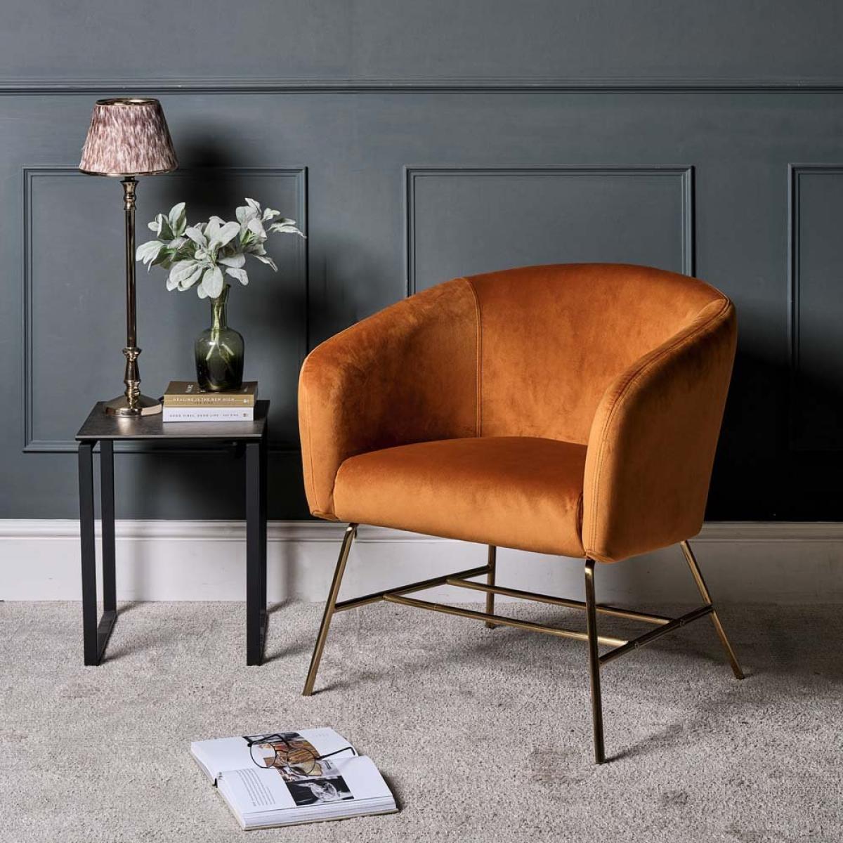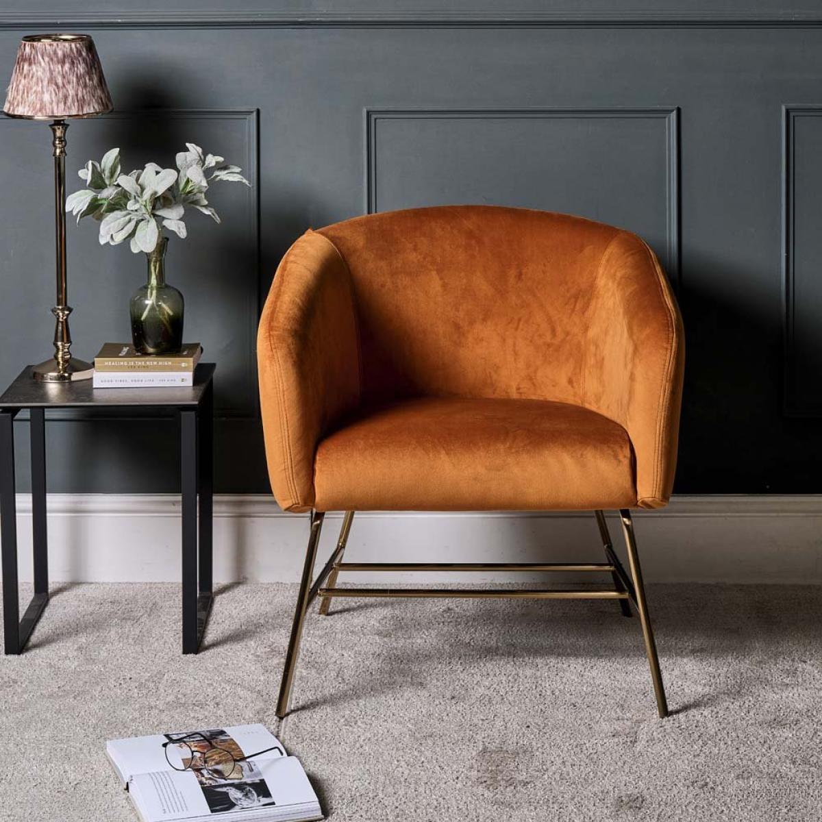Create the perfect feature corner with the Rosa accent chair. The curved back and wide seat gives you a comfortable place to relax with a drink and your favourite book. Finished in a soft velvet, this chair is the perfect combination of contemporary style with a chic touch such as the sleek brass legs. This chair is available in Blue, Mustard and Grey.