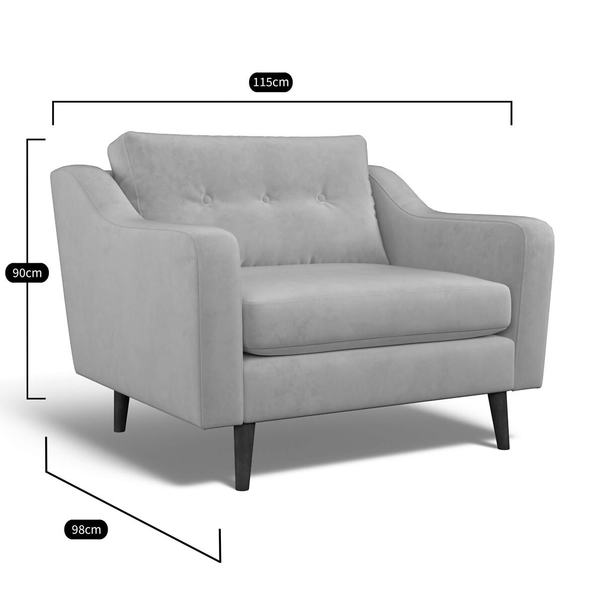 Deliciously spacious for one, or perfect for cuddling up. A timeless button back design, sloped arms and tapered wooden legs all make the Rosa a perfect example of Mid-century modern style. Reversible cushions with no plumping required, and a robust, tailored finish make this loveseat perfect for family life. Choose from our soft brushed fabric for ultimate cosiness, soft woven for a textured look or velvet for luxe living. The Rosa is available in multiple sizes, including an armchair, a snuggle chair, a 2 seater, a 3 seater and a corner chaise sofa. The Rosa is also available with a plain back. Product details• Soft Woven - a flat jaquard woven fabric made from a two colours of yarn creates a slightly speckled effect, whilst viscose adds softness. A textured criss-cross appearance helps to disguise any imperfections that might occur as a result of family life. Check it's right for you - order a FREE swatch above.• Created with medium density foam fillings for a sofa with a level of comfort suitable for most. • Foam filled seats provide great support without compromising on comfort, and require little maintenance to keep their shape, ensuring your sofa looks as good as it does the day you welcomed it into your living room.• Fibre backs provide extra softness and give you that "sink in" feeling.• Just flip to freshen up - both the seat cushions and back cushions are fully reversible so it's easy to keep your sofa looking its best.• Seat covers are removal (zip fastening). Back covers not removable due to button finishes. • FSC® solid beech hardwood frame - made of wood from responsibly managed forests that provide environmental, social and economic benefits.• Tapered feet crafted entirely from solid wood ensure durability and stability.• Removable feet.• Lovingly handmade in the UK.All our made to order sofas are carefully manufactured in the UK.Each hardwood frame is dowelled, glued, and screwed before being paired with the finest fabrics and fillings. And it doesn't stop there - for customer peace of mind and safety, all frames and fabrics are rigorously examined, inspected, and tested to the highest standards. All filling material(s) and covering fabric(s) meet the requirements for resistance to cigarette and match ignition in the 1988 safety regulations. This sofa comes with a 3 year manufacturer warranty from date of delivery (subject to terms and conditions)Product composition• Fabric - Soft Woven (80% polyester, 20% viscose)• Seat Fillings - Foam and fibre• Back Fillings - Fibre• Frame - Beech Hardwood (FSC), OSB (UK origin, FSC)• Feet - Solid Wood. Product Dimensions Overall width: 115 cm. Overall depth: 98 cm. Overall height: 90 cm. Seat height: 50 cm. Seat depth: 58 cm. Seat width between the arms: 94 cm. Back height (from base): 72 cm. Back height (from seat): 45 cm. Arm height (from floor): 66 cm. Arm height (from seat): 16 cm Clearance to floor (leg height): 18 cm. Please remember to measure your available space before ordering to be sure your sofa will fit. Don't forget to measure accessways and corners, and consider any obstacles. Package DimensionsL11. 6 cm x W91 cm x H73 cm, Weight 37.5 kg. This product will be dispatched by one of our trusted suppliers. You’ll be contacted by their selected courier about your delivery. Your product will be delivered to your room of choice. Feet may be assembled on arrival. BELFI01