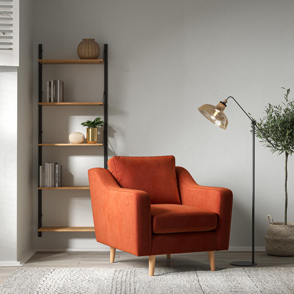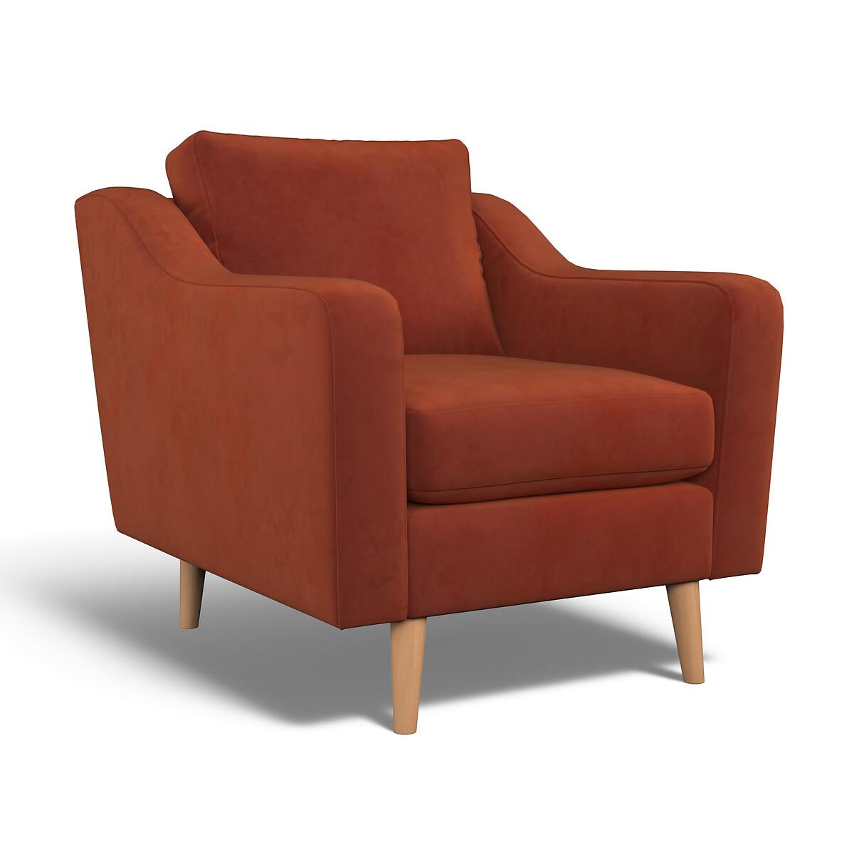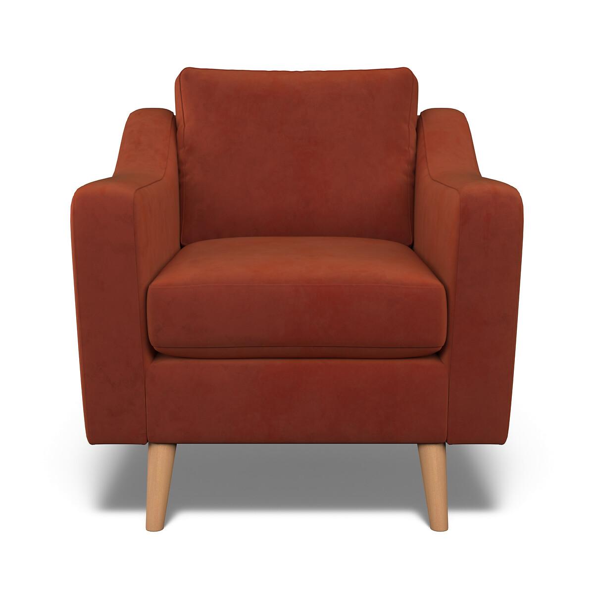 Sloped arms and tapered wooden legs all make the Rosa a perfect example of Mid-century modern style. Reversible cushions with no plumping required, and a robust, tailored finish make this armchair perfect for family life. Choose from our soft brushed fabric for ultimate cosiness, soft woven for a textured look or velvet for luxe living. The Rosa is available in multiple sizes, including an armchair, a snuggle chair, a 2 seater, a 3 seater and a corner chaise sofa. The Rosa is also available with a buttoned back. Product details• Velvet - An elegant velvet with a dense and matte finish, perfect for those wanting a rich and luxurious look. A flat finish pile makes it difficult for the material to snag – ideal if you live with pets and sure to prove durable for years to come. Check it's right for you - order a FREE swatch above.• Created with medium density foam fillings for a sofa with a level of comfort suitable for most. • Foam filled seats provide great support without compromising on comfort, and require little maintenance to keep their shape, ensuring your sofa looks as good as it does the day you welcomed it into your living room.• Fibre backs provide extra softness and give you that "sink in" feeling.• Just flip to freshen up - both the seat cushions and back cushions are fully reversible so it's easy to keep your sofa looking its best.• Both seat and back covers are removable (zip fastening)• FSC® solid beech hardwood frame - made of wood from responsibly managed forests that provide environmental, social and economic benefits.• Tapered feet crafted entirely from solid wood ensure durability and stability.• Removable feet.• Lovingly handmade in the UK.All our made to order sofas are carefully manufactured in the UK.Each hardwood frame is dowelled, glued, and screwed before being paired with the finest fabrics and fillings. And it doesn't stop there - for customer peace of mind and safety, all frames and fabrics are rigorously examined, inspected, and tested to the highest standards. All filling material(s) and covering fabric(s) meet the requirements for resistance to cigarette and match ignition in the 1988 safety regulations. This sofa comes with a 3 year manufacturer warranty from date of delivery (subject to terms and conditions)Product composition• Fabric - Velvet (100% polyester)• Seat Fillings - Foam and fibre• Back Fillings - Fibre• Frame - Beech Hardwood (FSC), OSB (UK origin, FSC)• Feet - Solid Wood. Product Dimensions Overall width: 89 cm. Overall depth: 98 cm. Overall height: 90 cm. Seat height: 50 cm. Seat depth: 58 cm. Seat width between the arms: 68 cm. Back height (from base): 72 cm. Back height (from seat): 45 cm. Arm height (from floor): 66 cm. Arm height (from seat): 16 cm Clearance to floor (leg height): 18 cm. Please remember to measure your available space before ordering to be sure your sofa will fit. Don't forget to measure accessways and corners, and consider any obstacles. Package DimensionsL9. 1 cm x W82 cm x H73 cm, Weight 37.5 kg. This product will be dispatched by one of our trusted suppliers. You’ll be contacted by their selected courier about your delivery. Your product will be delivered to your room of choice. Feet may be assembled on arrival. BELFI01