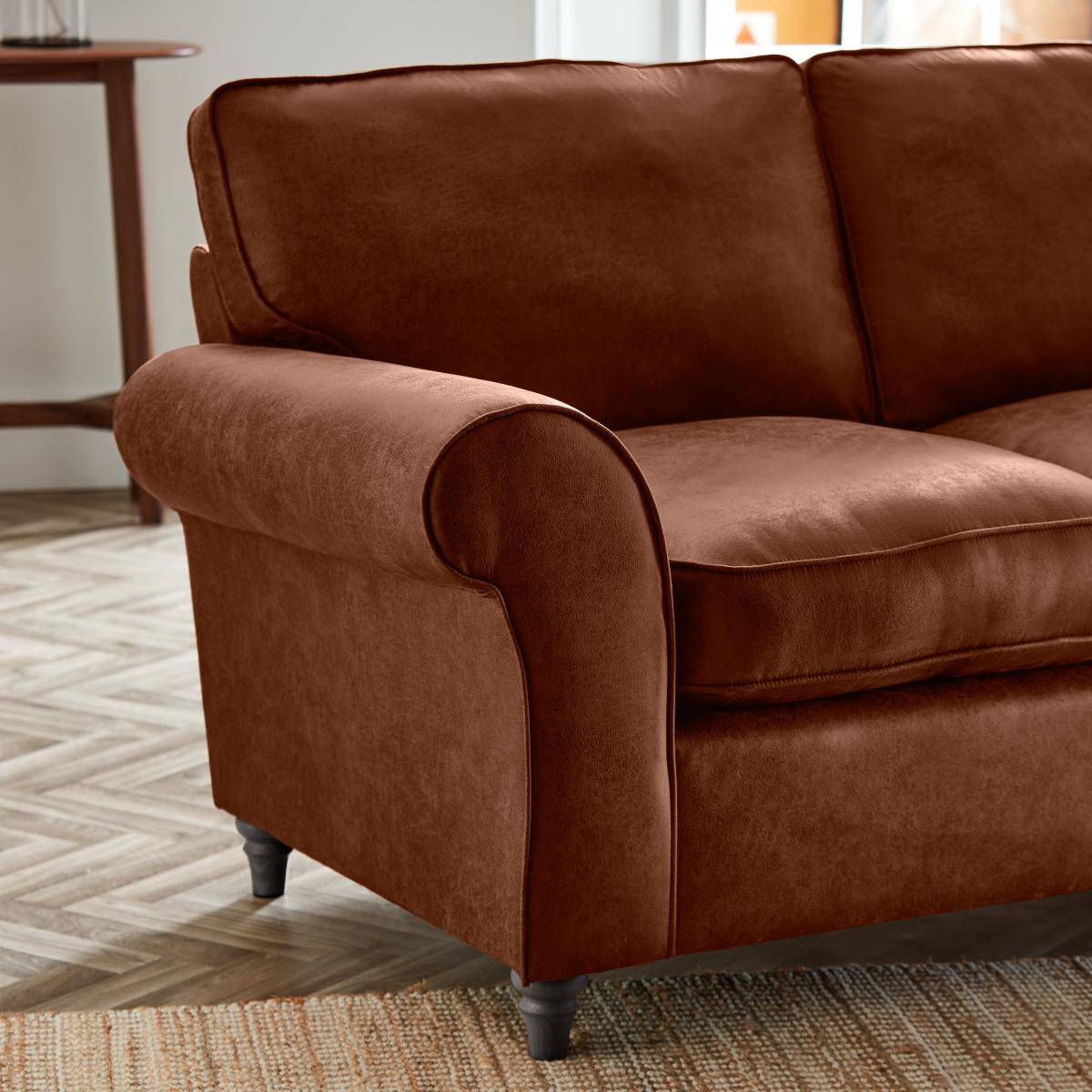 Featuring a scroll arm design and plush fibre cushions, this sofa invites you to experience unparalleled comfort. Whether you're entertaining guests or simply unwinding after a long day, this sofa provides the perfect retreat. Its inviting and luxurious faux leather upholstery adds a touch of opulence to your living space, making it an ideal addition for those who appreciate timeless beauty and enduring quality.