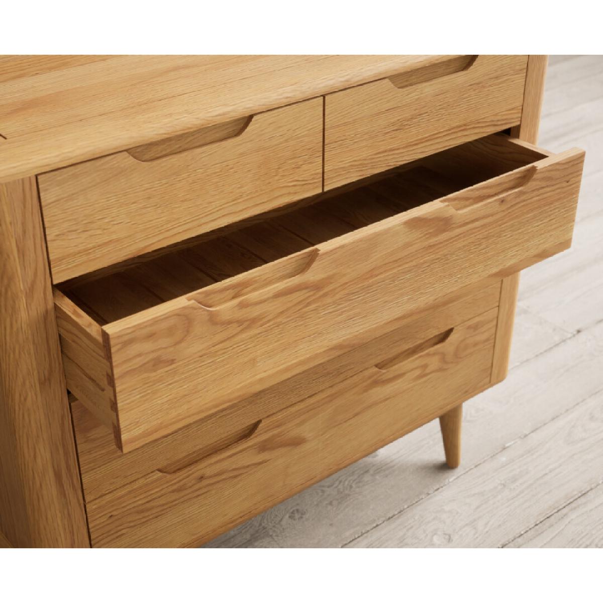 I’m a fan of this two-over-three oak chest for its clean, minimalist lines and the warmth of its natural grain. It works equally well in Scandi-inspired, mid-century or modern country interiors, slotting neatly into bedrooms, hallways or living rooms where you need smart storage without bulk. For styling, hang a round mirror or a simple framed print above to soften the shape, then group a low-profile lamp with a couple of ceramic vases in muted shades. Finish with a textured runner or a small plant on one side to introduce height contrast, and layer a woollen throw or sisal rug underneath to anchor the piece in the room.