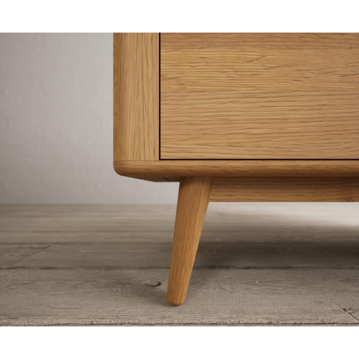 I’d call this the Rosa sideboard - its solid oak finish and simple, rounded legs make it a versatile piece for Scandi, modern farmhouse or minimalist schemes. The clean profile means it won’t dominate a room, while the three drawers and two cupboards offer discreet storage for dining or living spaces. For styling, keep the top flat and uncluttered: perhaps a low ceramic vase, a stack of design books and a small plant to introduce texture and height variation. Mount a mid-sized mirror or a pair of framed prints above to create a focal point without overwhelming the natural grain.
