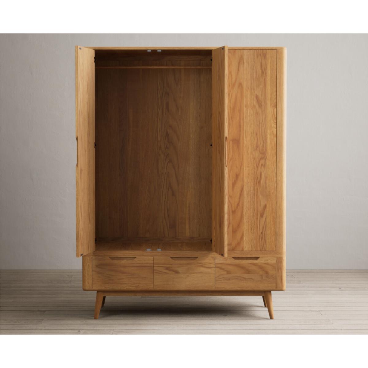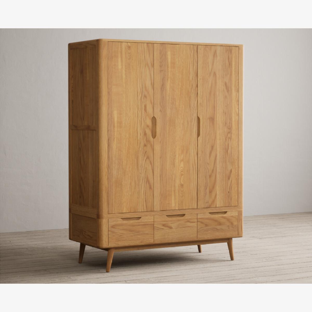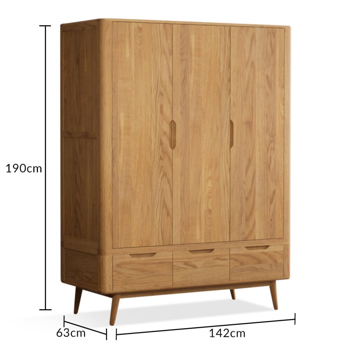 I love this oak triple wardrobe for its clean lines and natural warmth - it slots straight into Scandi, mid-century or modern farmhouse schemes without overwhelming the space. The combination of three full-height doors and lower drawers gives plenty of scope to organise clothing and accessories. For styling, keep internal fittings simple with slimline hangers and woven baskets to maximise storage. On top, limit décor to a low-profile plant or one framed print to maintain the piece’s uncluttered look, and echo the wood tone with a neutral rug or cushions elsewhere in the room.