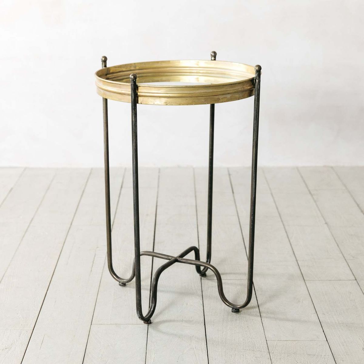 Embrace industrial elegance in your home with the addition of our Rosace round side table. Perfect for use in a sitting room, or as a contemporary alternative to a bedside;this table features sturdy black metal legs and a round top with a mirror glass base. A wonderful example of modern design, softened by sweeping curves and an intentionally distressed bronze finish.