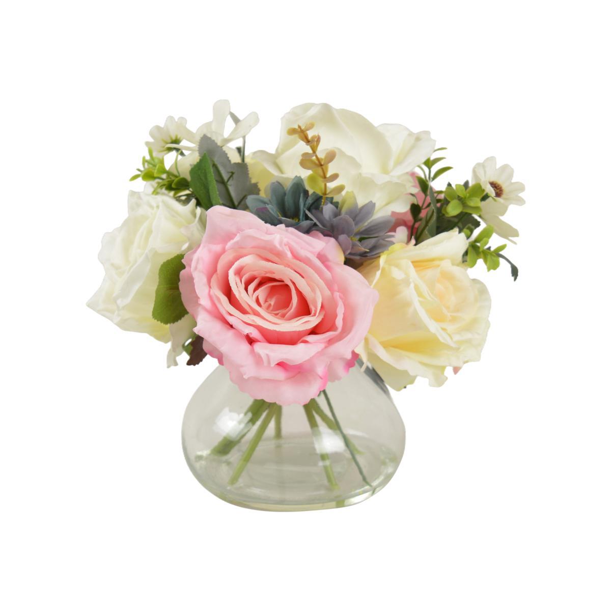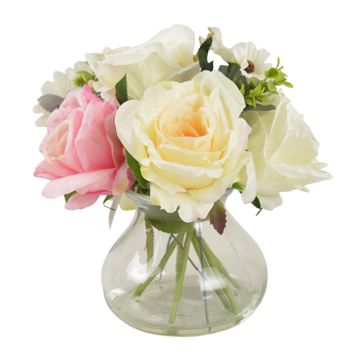 With their elegant, colourful design, this stunning flower arrangement offers a highly realistic design. Presented in a gorgeous glass vase, this arrangement features artificial roses and daisies, requiring no maintenance and can be displayed anywhere in the home.