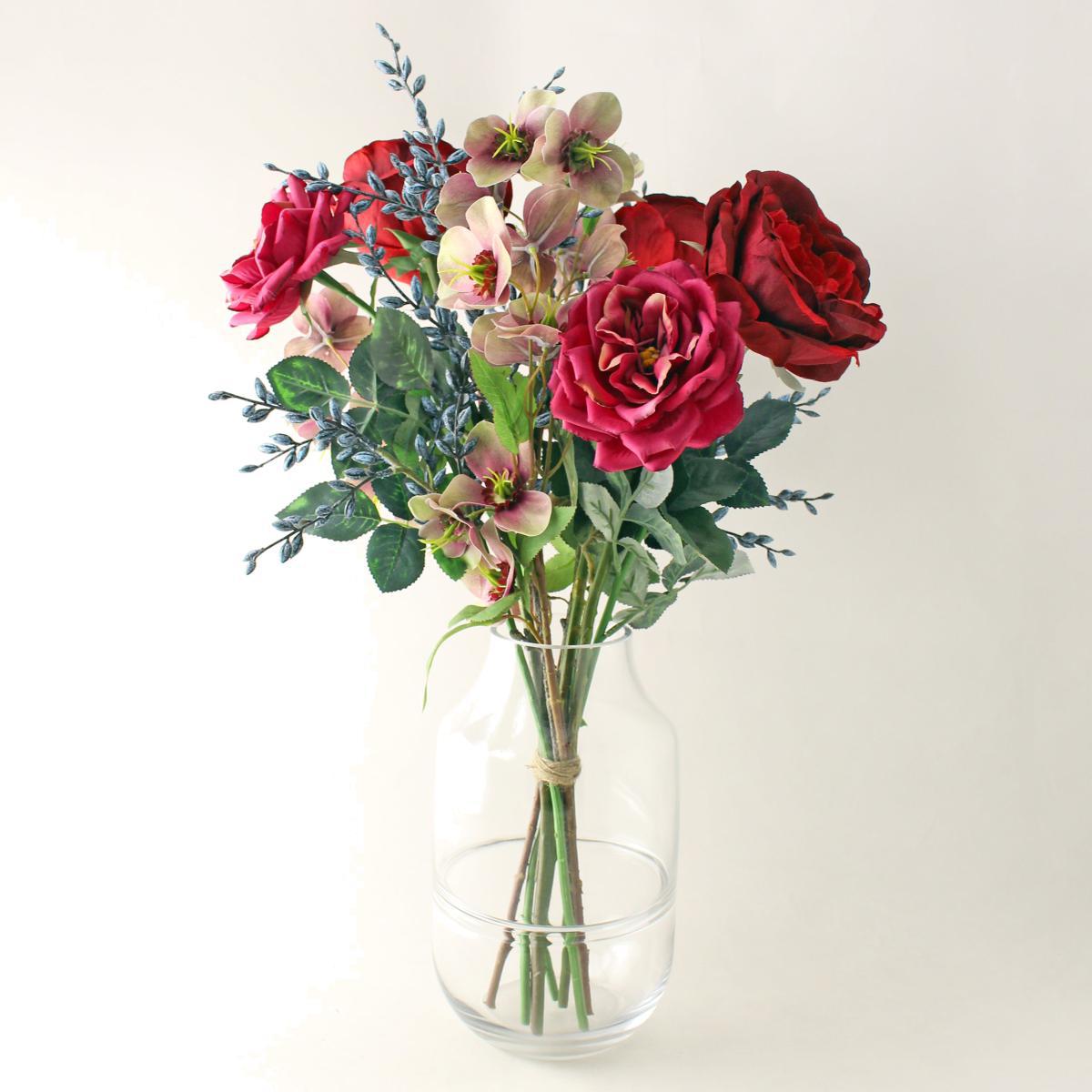 I love this artificial bouquet for its vibrant mixture of reds and greens, which add warmth and freshness without the maintenance. It works particularly well in on-trend, minimalist interiors where a splash of colour can brighten up neutrals, or in rustic and country-style spaces that benefit from natural, floral accents. To style it effectively, consider placing it in a clear glass vase on a dining table or sideboard to maximise the colour pop. For a more contemporary look, group it with other neutral decor items or utilise it as a centrepiece in a kitchen or bathroom. Its realistic appearance makes it versatile, and it remains a fuss-free way to bring colour and life to any room year-round.