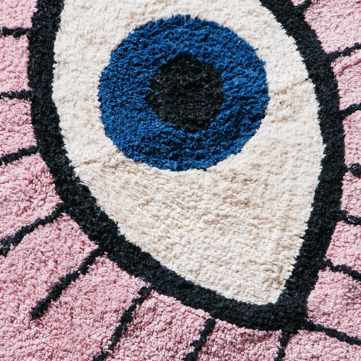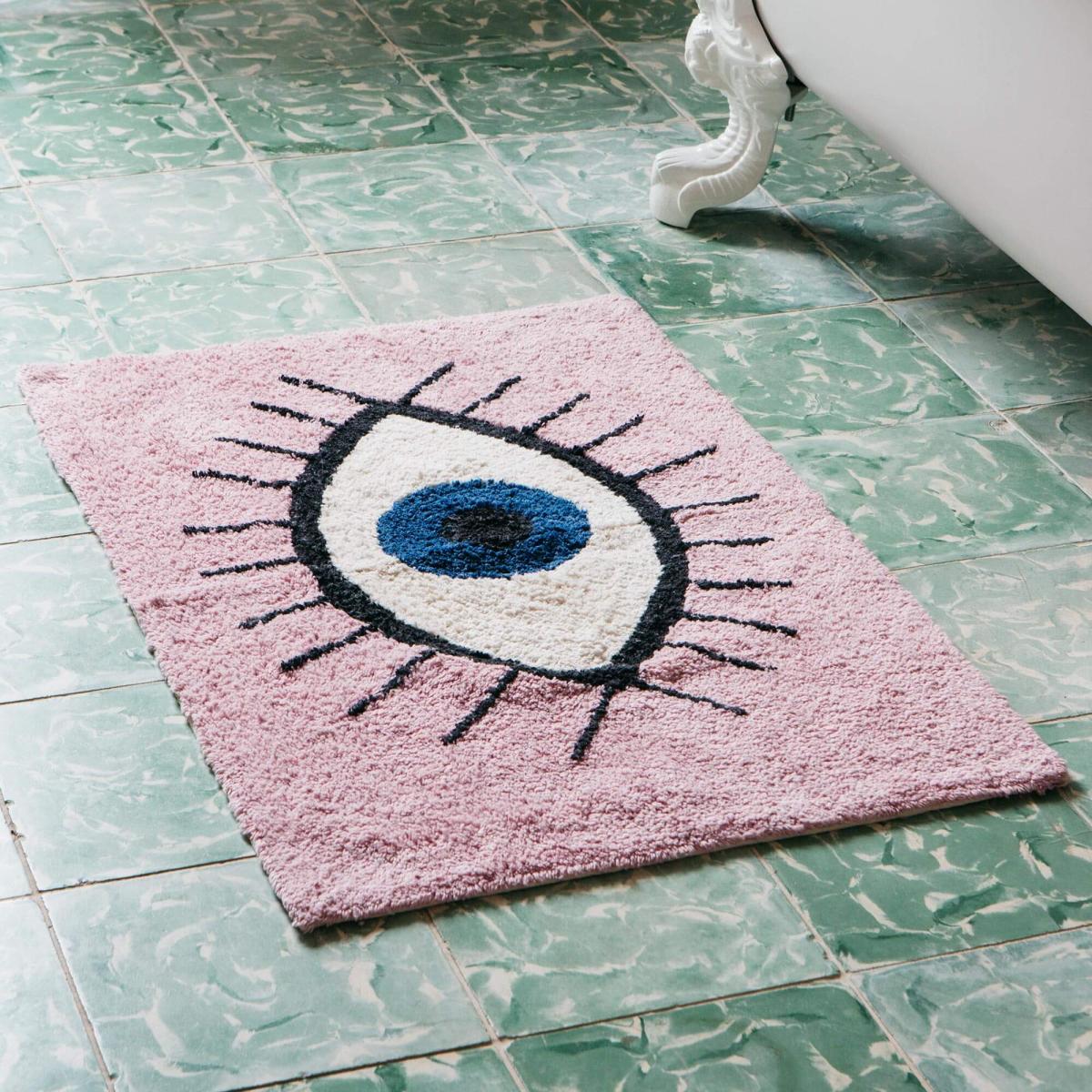 Brighten up your bathroom with this pretty rose pink bath mat printed with an eye design and woven from recycled cotton.