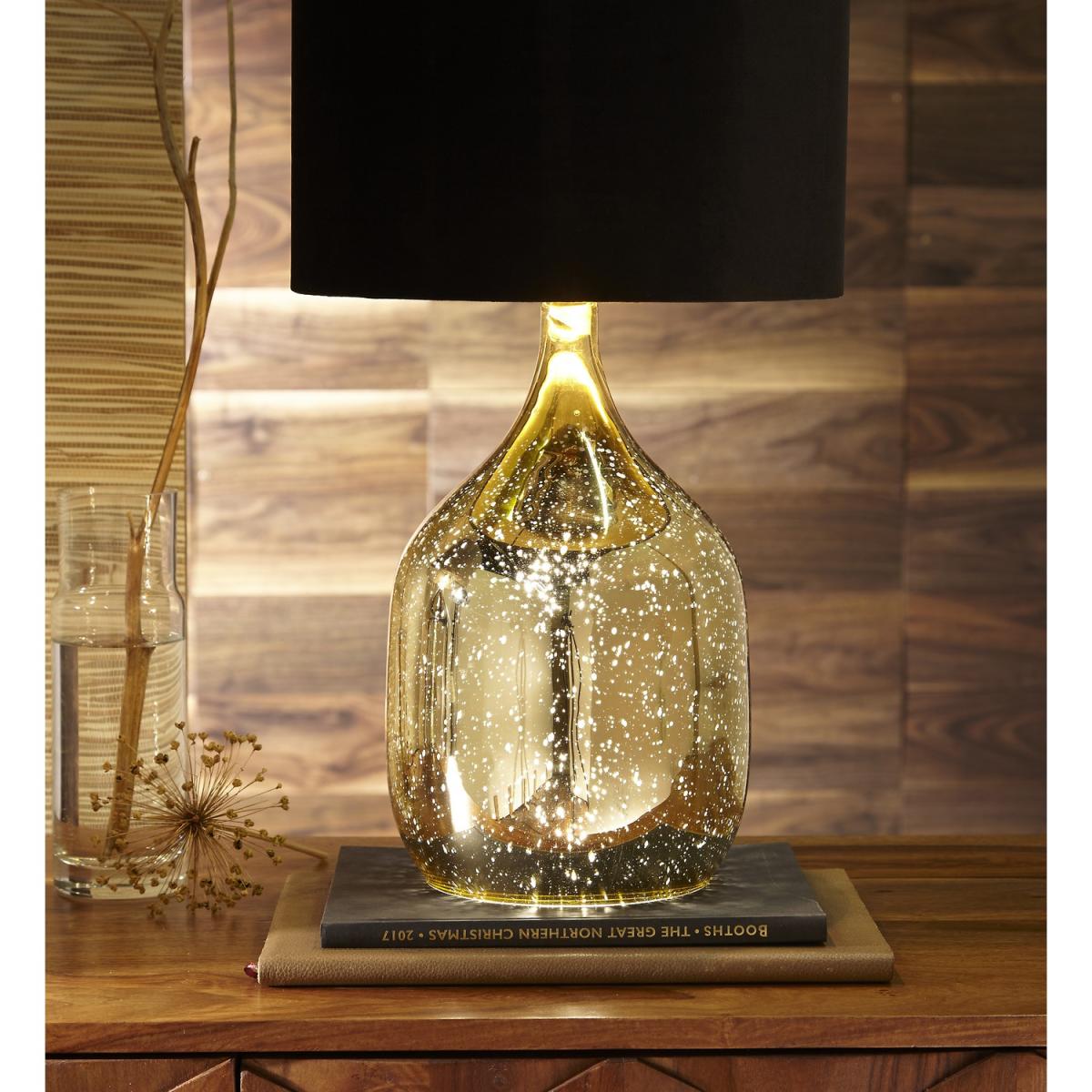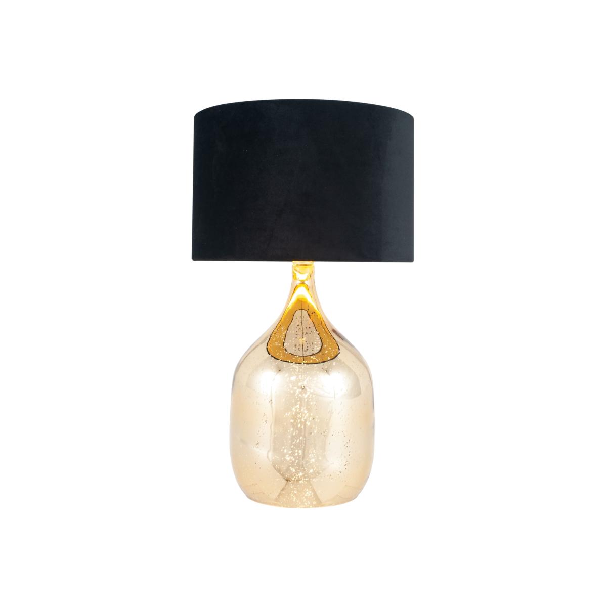 Light up your living room with this stunning lamp with a twist. The glass base is filled with flecks of gold that reflect the light beautifully, creating a warm glow. The lamp is dual lit, meaning both the shade and base have lighting elements. A black velvet shade gives this lamp a bold finish and brings a soft texture to the piece.