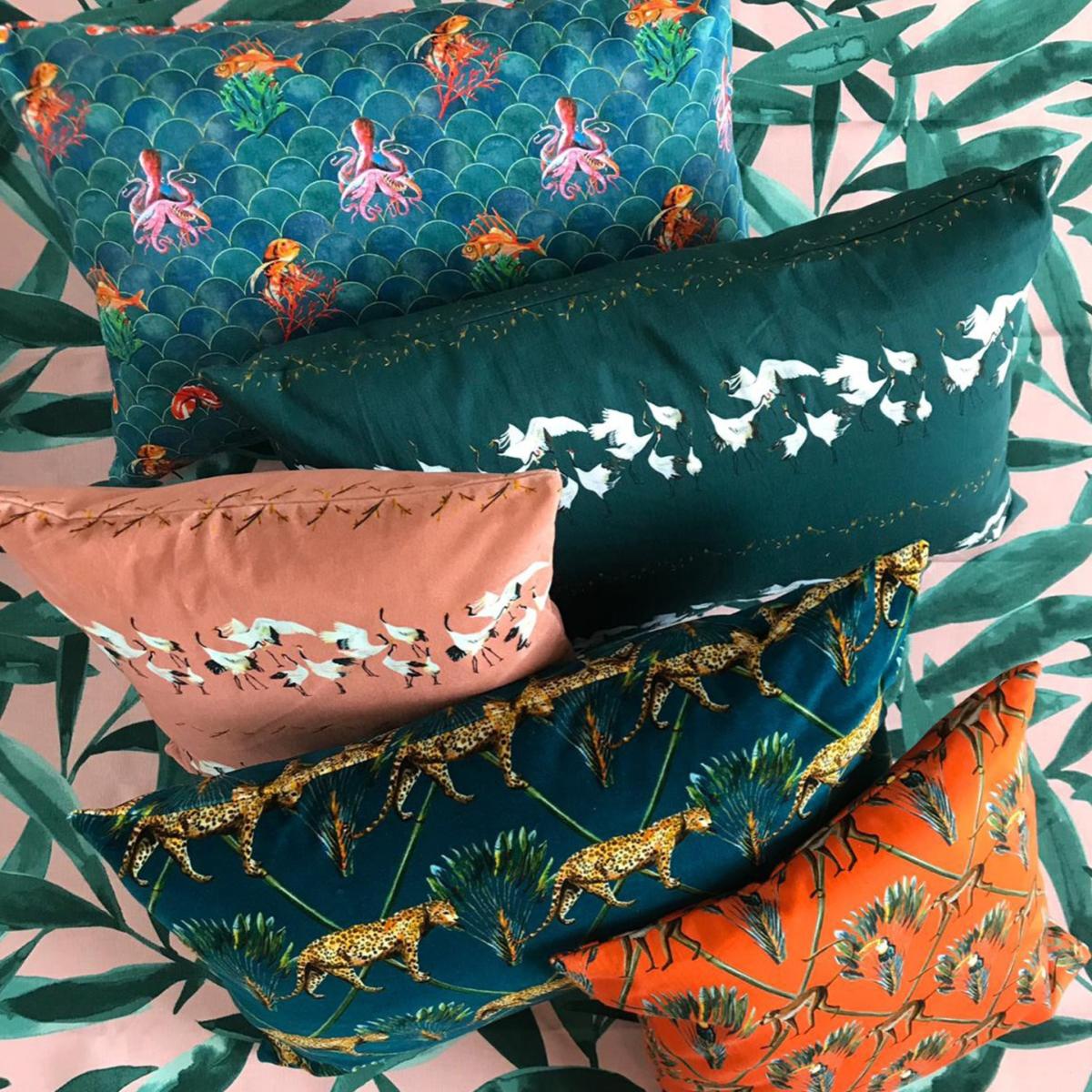 I love this cushion for its rich rose gold velvet texture combined with the playful Japanese cranes print-it's a great way to add a touch of elegance with a dash of whimsy. It works particularly well in interiors that mix luxe textures with colour, such as a contemporary or eclectic scheme. Styling tips include pairing it with neutral-toned throws and linens to let the cushion's colour and pattern stand out, or using it as a statement piece on a bed or sofa. It's versatile enough to bring personality to both understated and maximalist spaces while adding a subtle sense of sophistication.