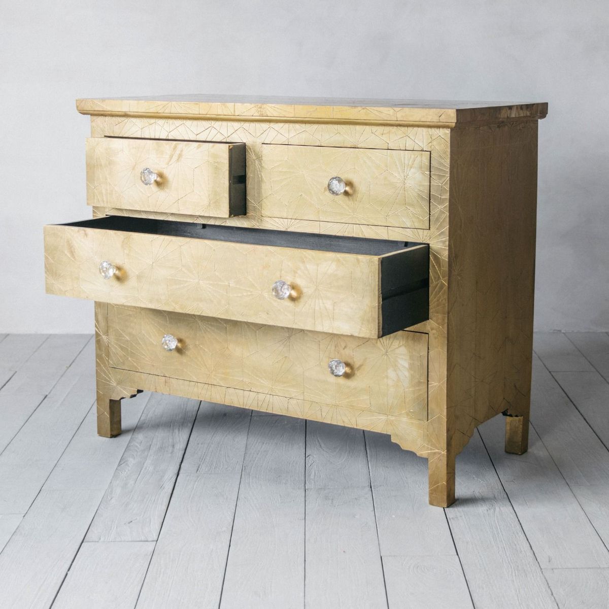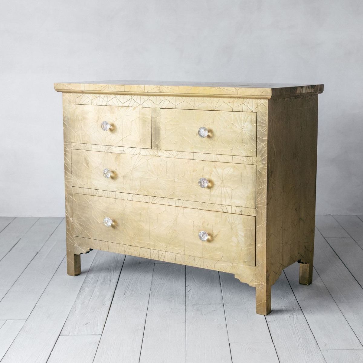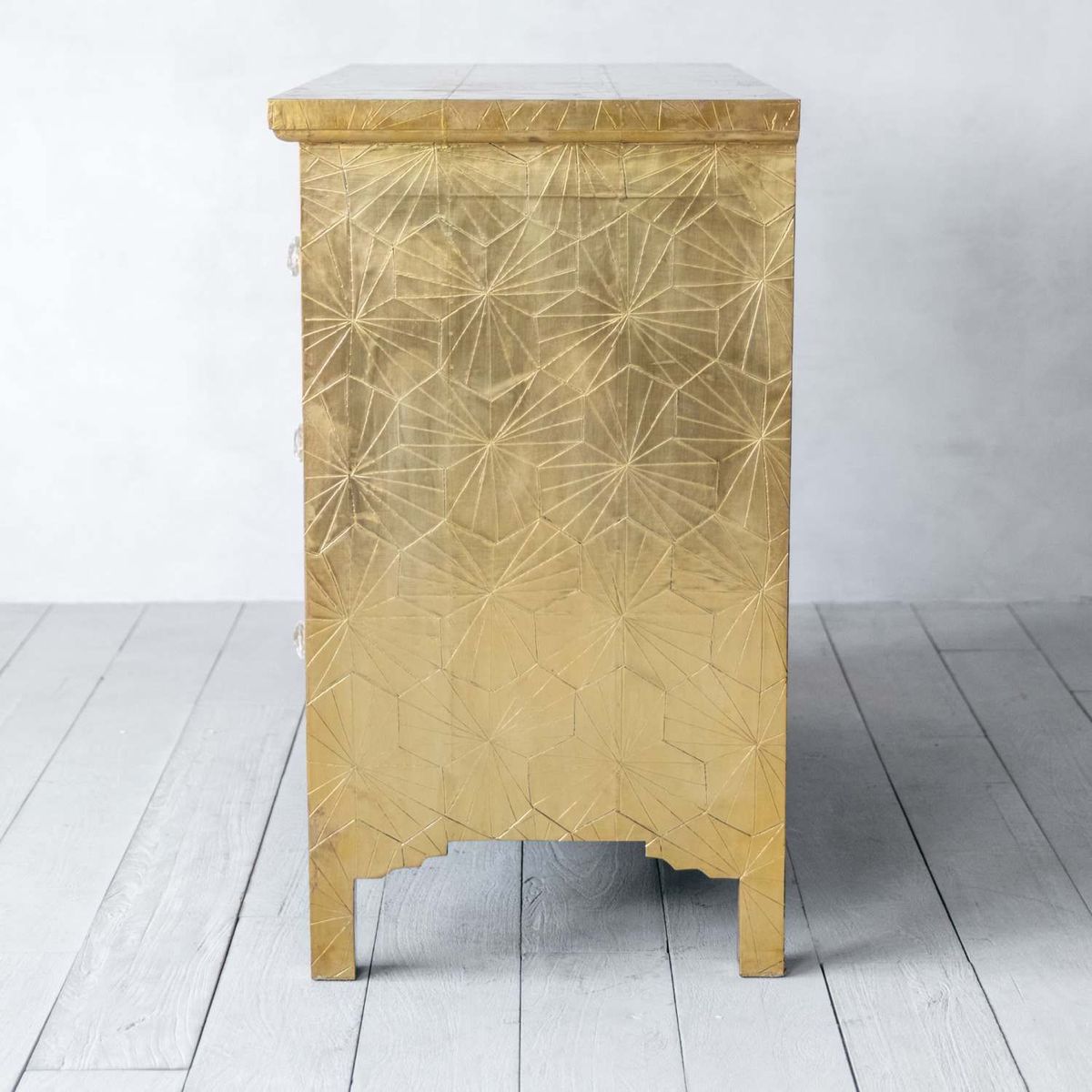 Handcrafted from brass metal pressed over a wooden frame, our Roselle chest of drawers is embossed with a striking geometric design with a slight antiquing, complete with glass drawer knobs. The beautiful finish on this chest will naturally mark and mottle, adding to its unique look.