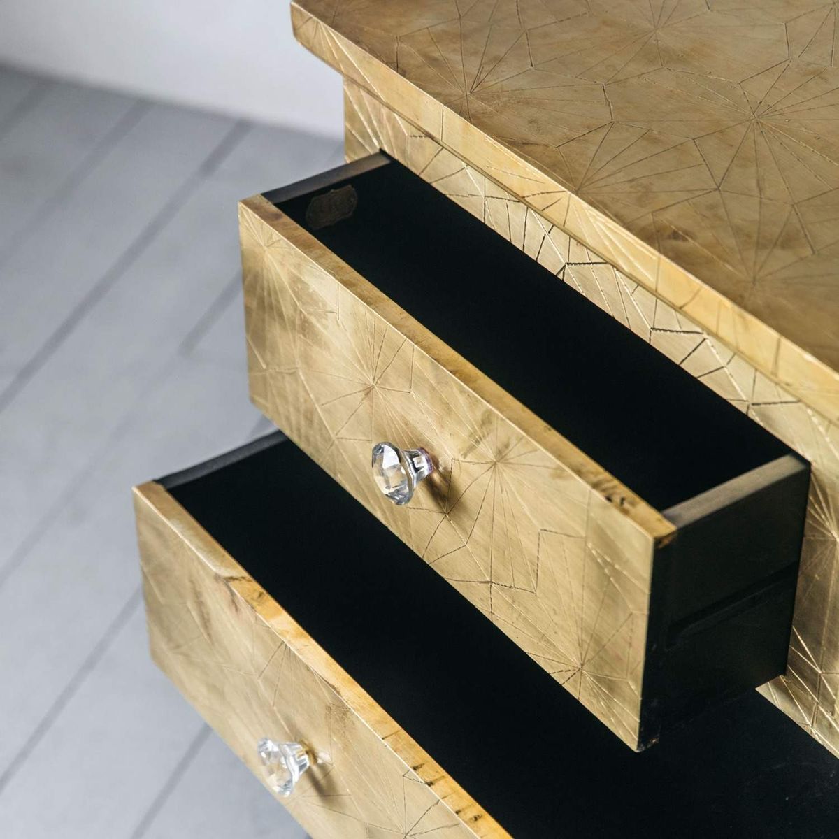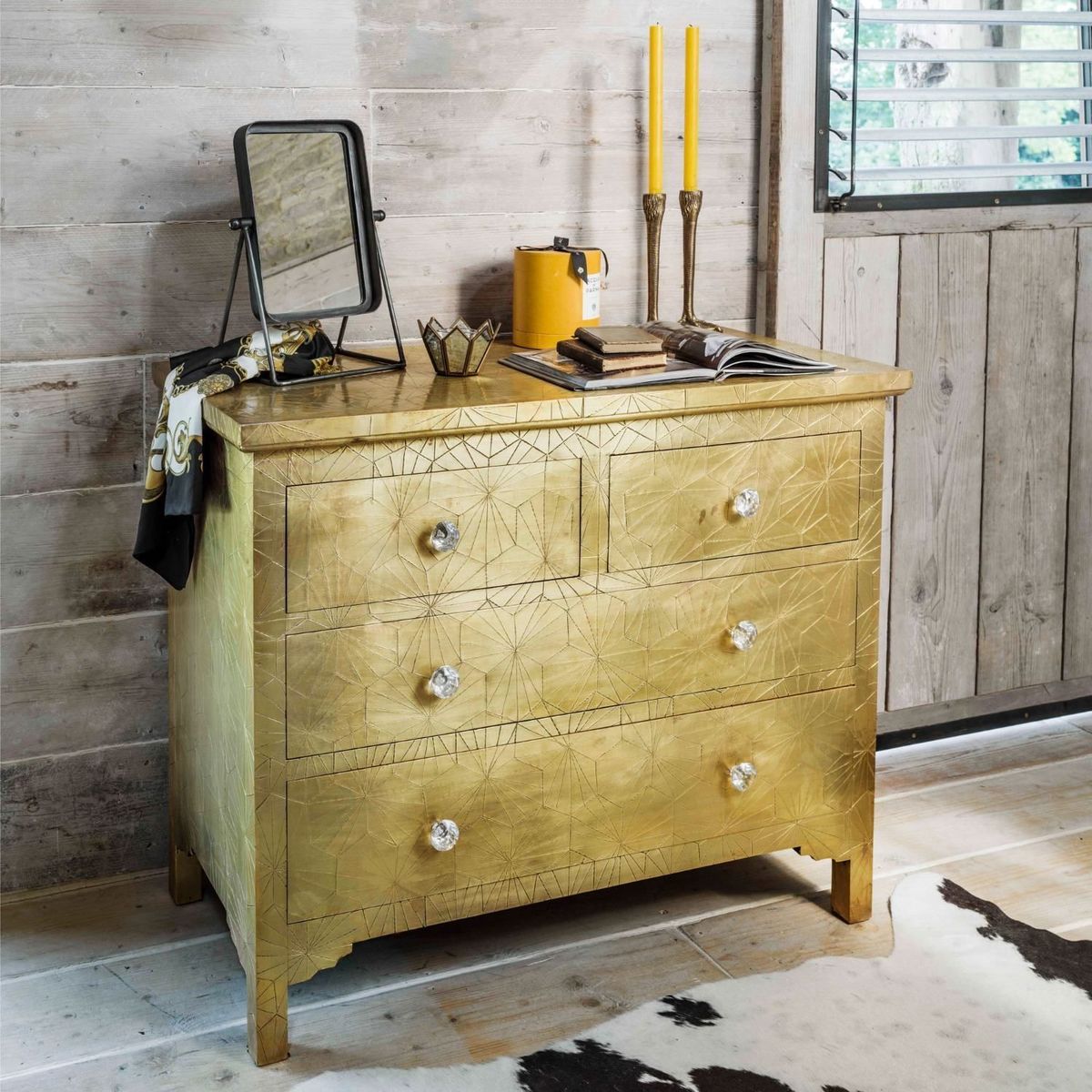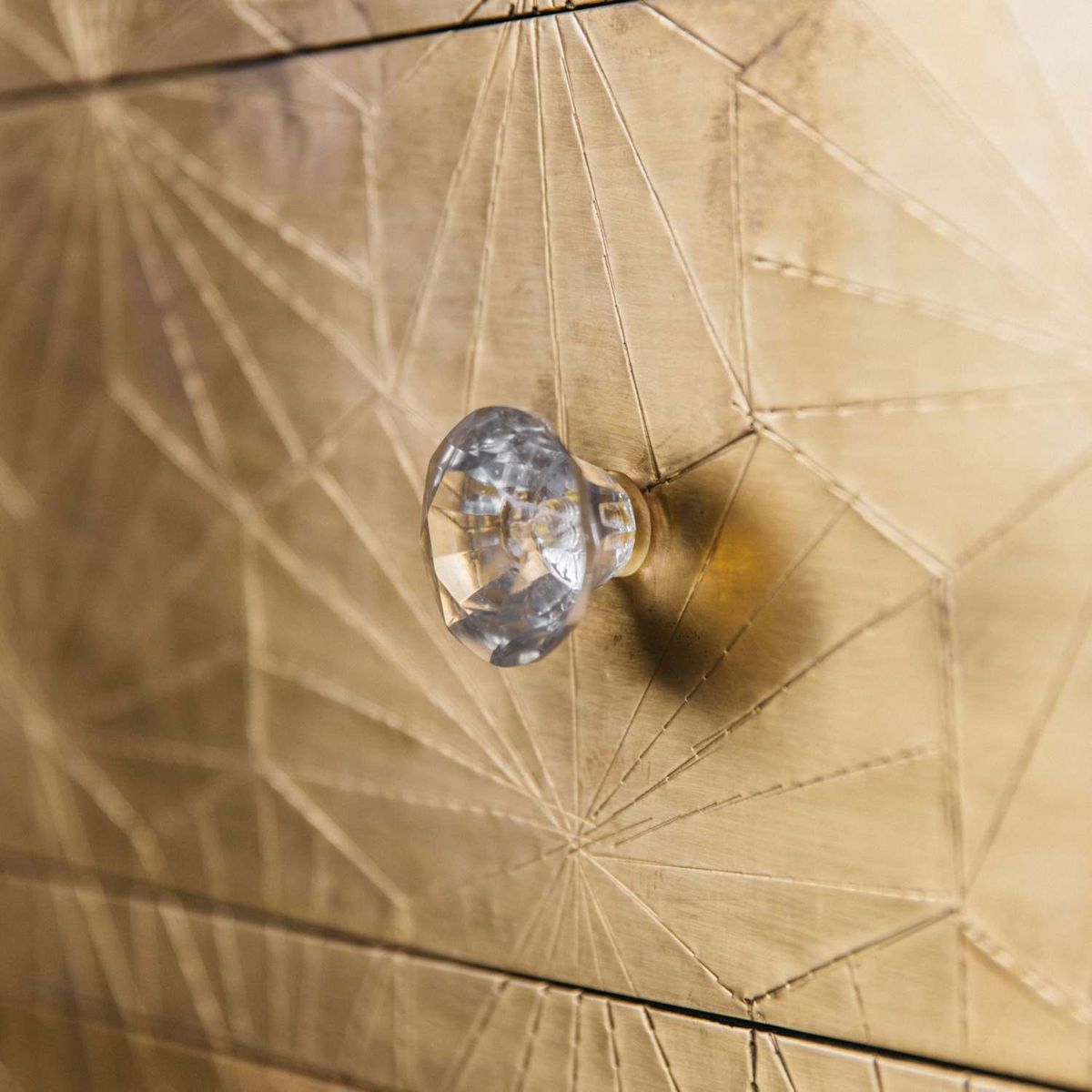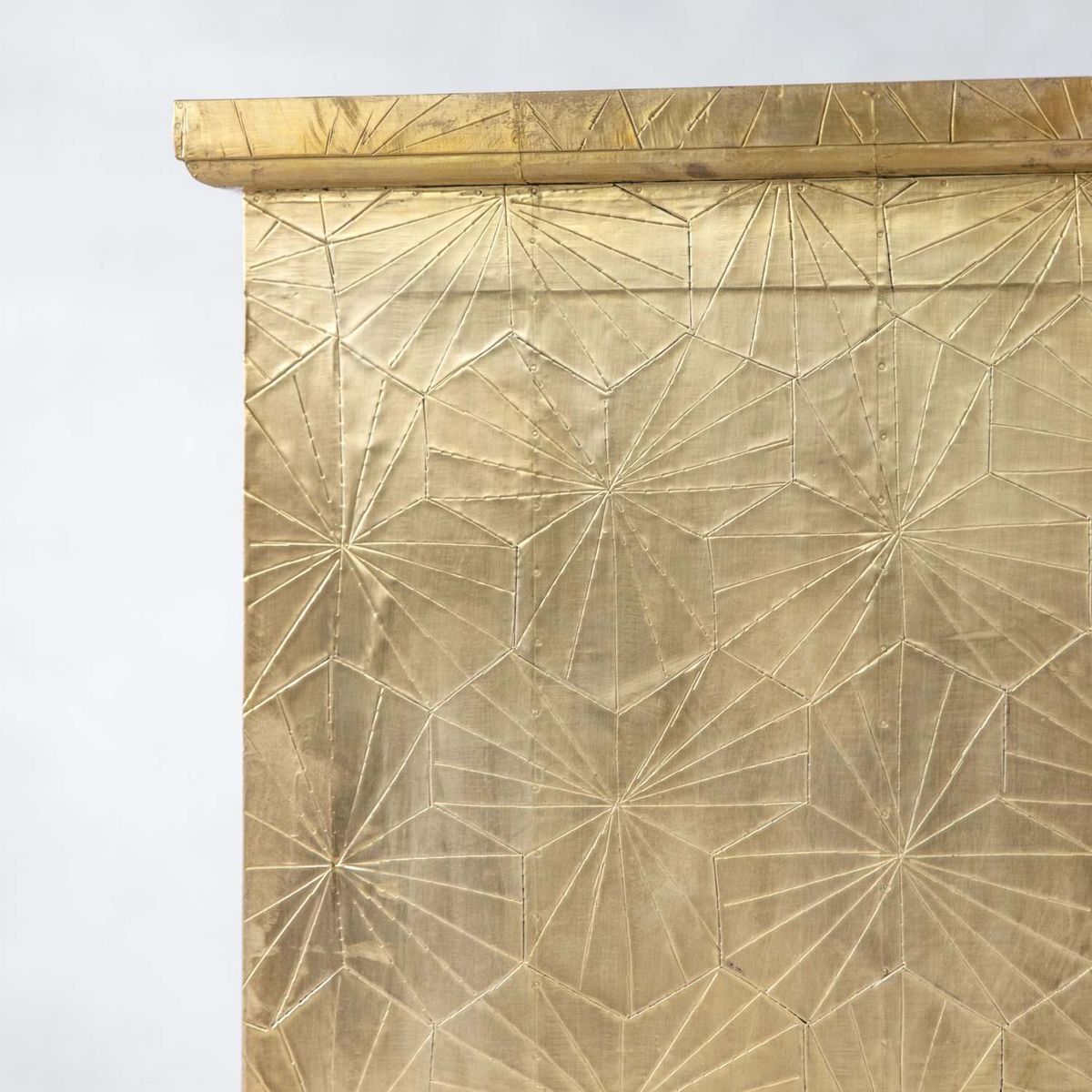 Handcrafted from brass metal pressed over a wooden frame, our Roselle chest of drawers is embossed with a striking geometric design with a slight antiquing, complete with glass drawer knobs. The beautiful finish on this chest will naturally mark and mottle, adding to its unique look.