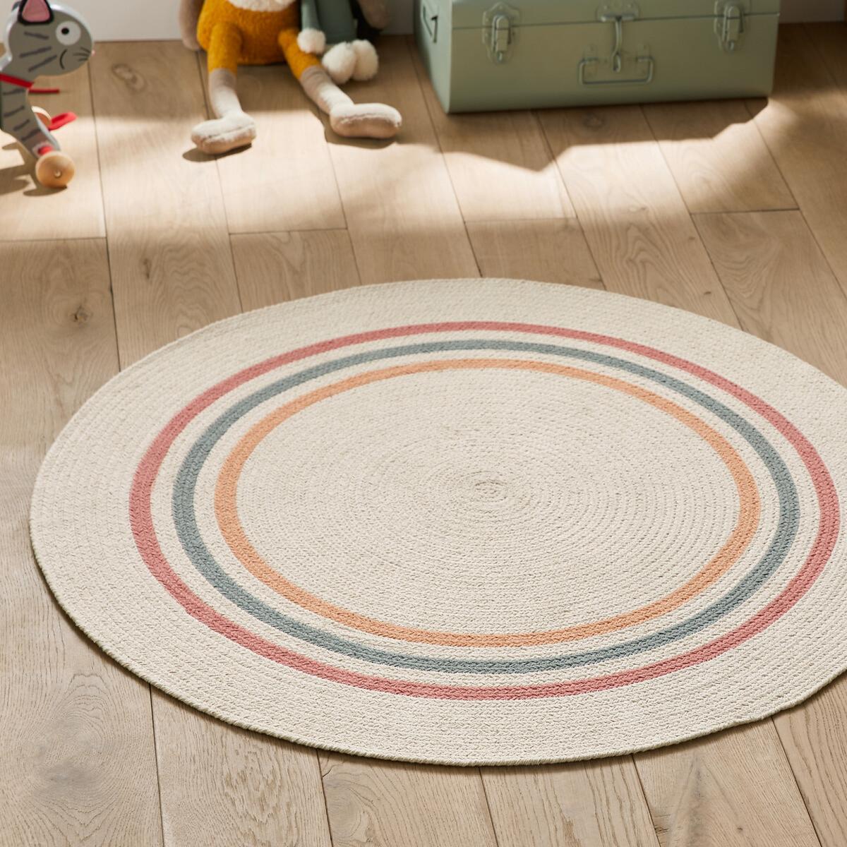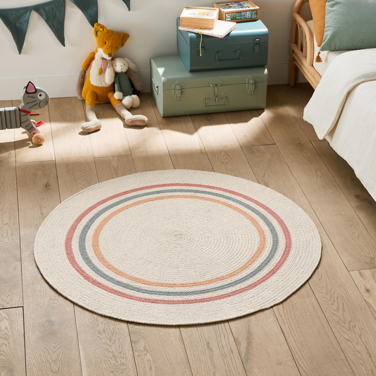I love this round kiddie rug for its cheerful, simple design and soft cotton texture - perfect for creating a cosy play area. Its neutral base with subtle coloured rings makes it versatile enough to slot into a variety of nursery or child’s bedroom styles, from Scandi minimal to more playful, colourful schemes. Practical styling tips include layering it with plush cushions or small bean bags for a relaxed seating spot, or placing it near a reading nook to define a dedicated cosy corner. Its easy-to-clean cotton material makes it an excellent choice for busy spaces, and because it’s round, it adds a nice visual contrast to square or rectangular furniture setups.