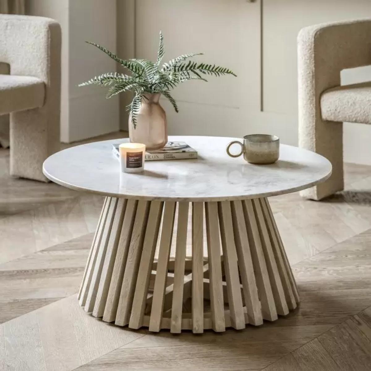 This lovely coffee table offers stylish contemporary design. The base is crafted from gently sloping slats of mango solid timbers with a white-washed, sand-blasted finish to create a striking design feature. This stunning base is paired with a beautiful white Indian marble top, creating a classy elegant piece of furniture. Matching items are available. Material:Marble 45% / Mango Wood 55%. Colour/Finish: Natural / White.