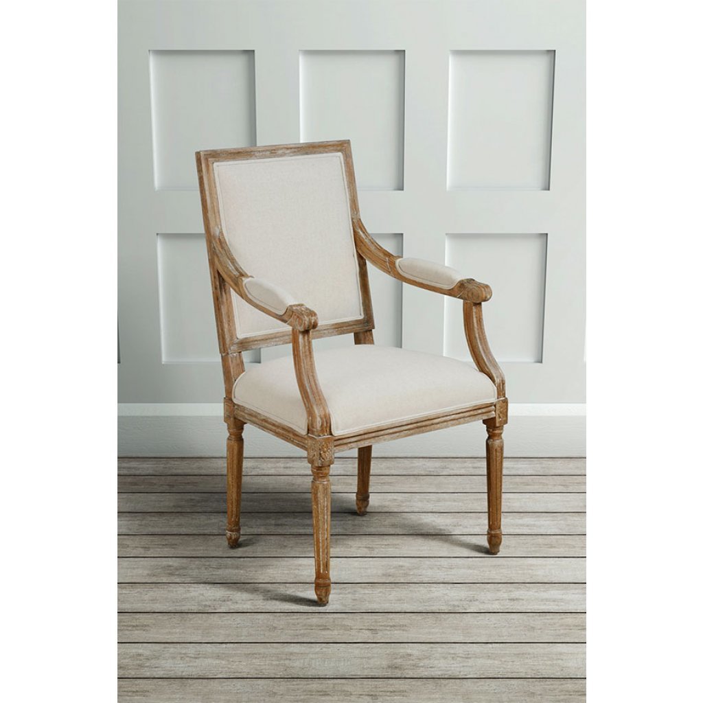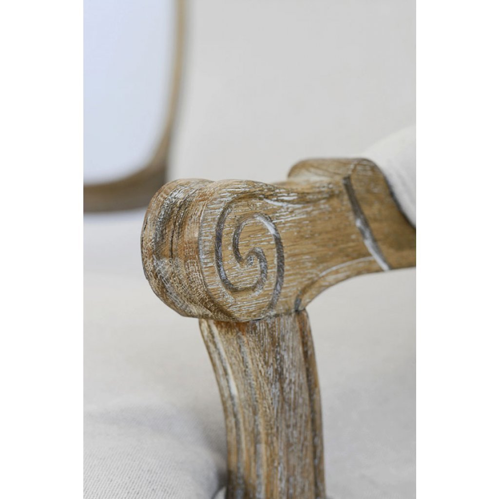 These beautiful chairs will add comfort and character to any interior - commercial or residential. Elegant and ornate, this skilfully crafted, solid oak frame has been subtly lime-washed for a chic, distressed look. Neutral oatmeal upholstery will coordinate with any colour scheme. Ideal as a statement, compact armchair, carver chair or dressing table chair.