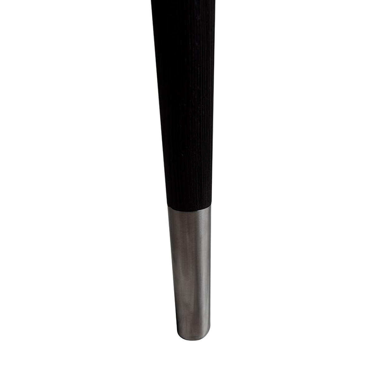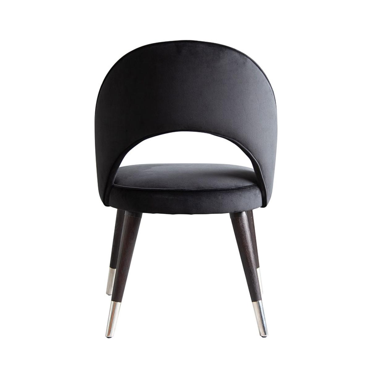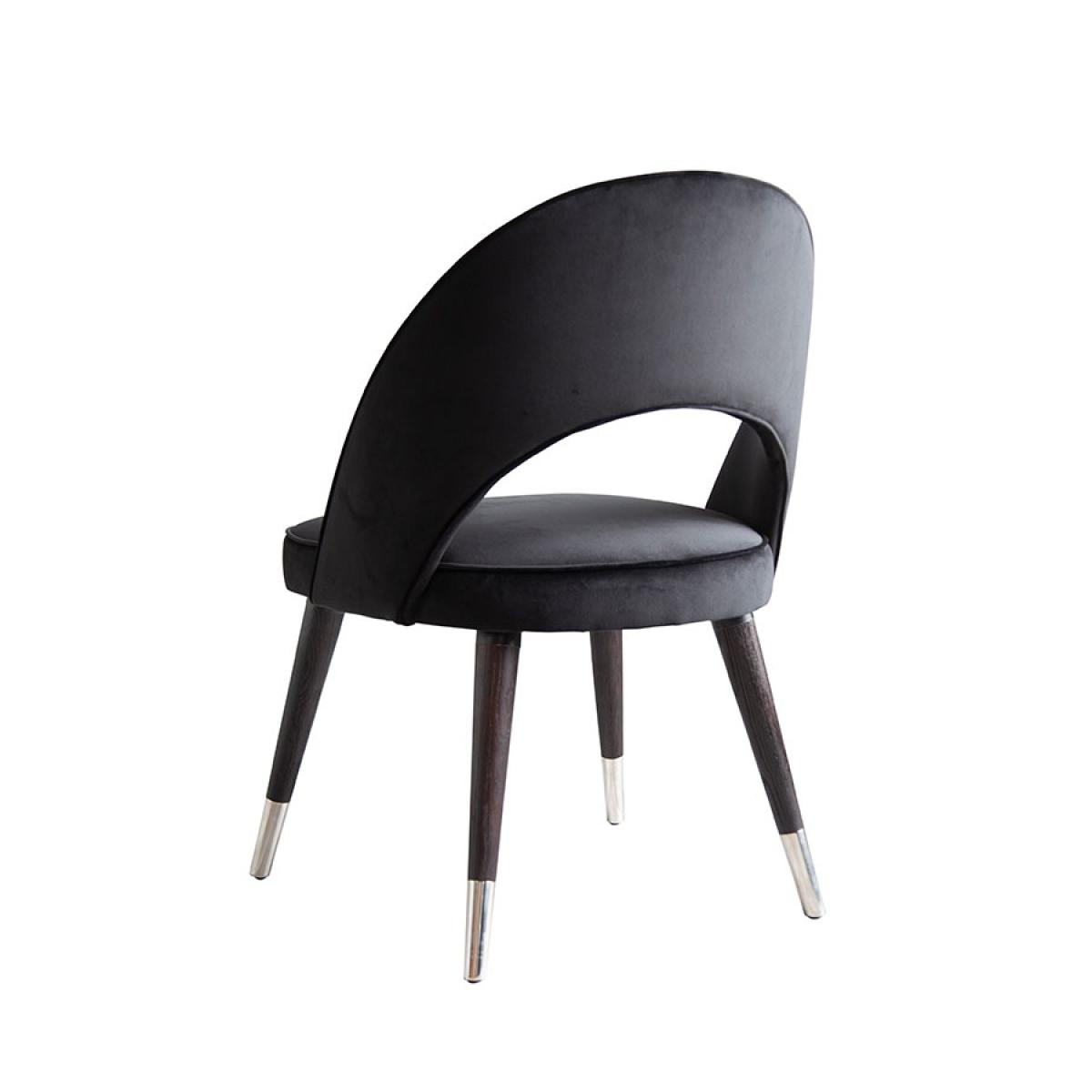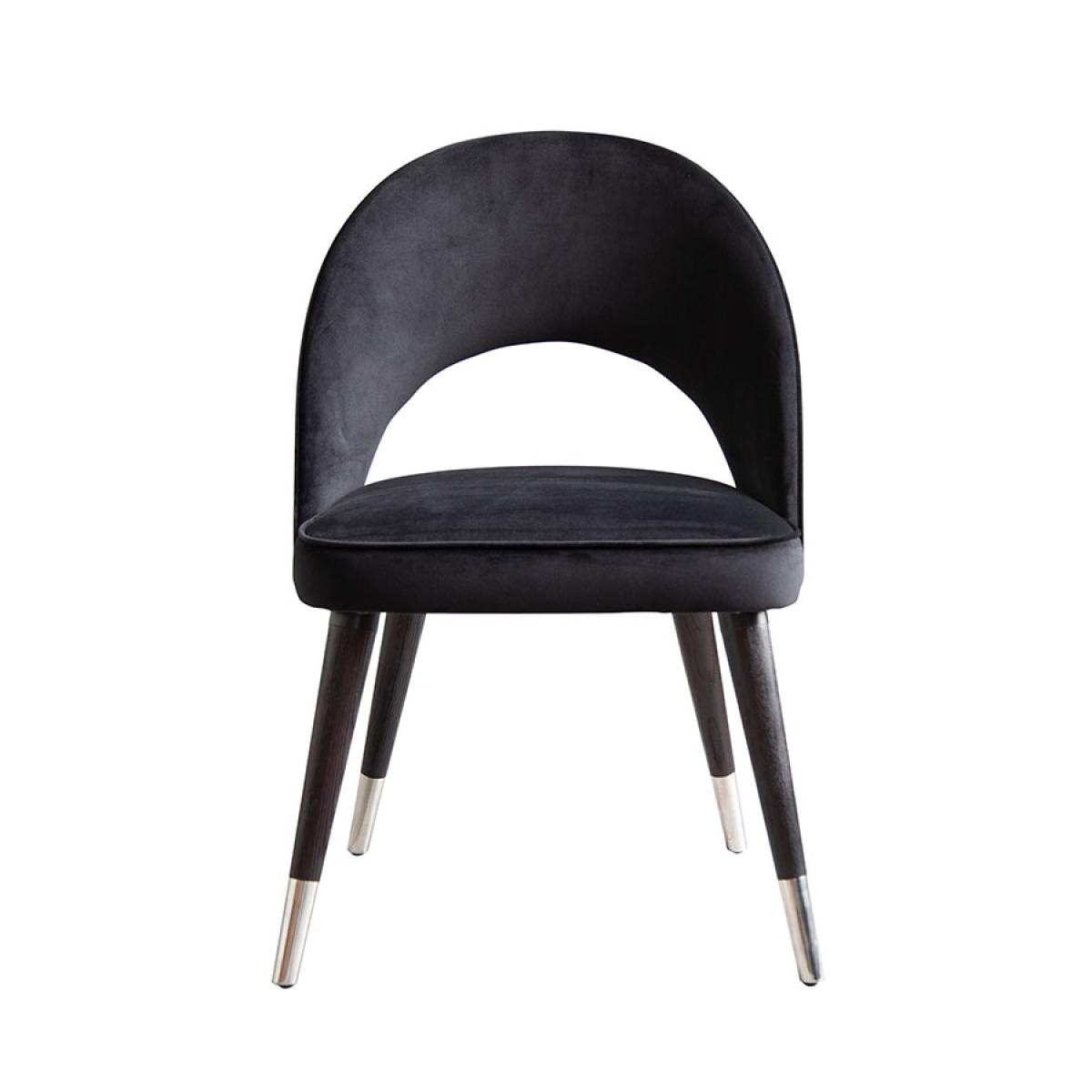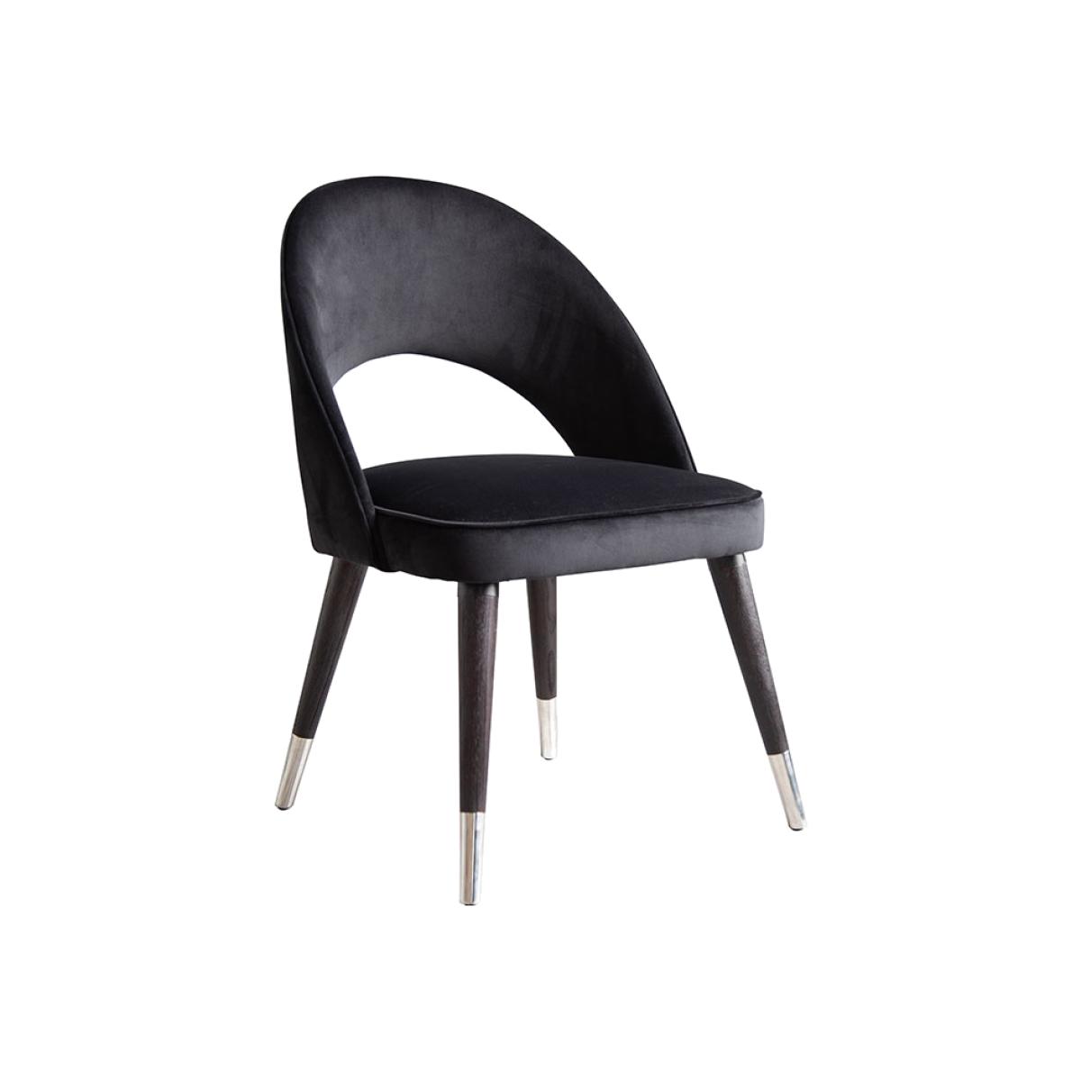 An extremely elegant dining chair inspired by 1960’s Italian interiors. Solid ash legs with very dark brown matt finish. Handsome and practical chrome foot caps with plastic glides to underside. Velvet upholstery fabric. Partial assembly required.