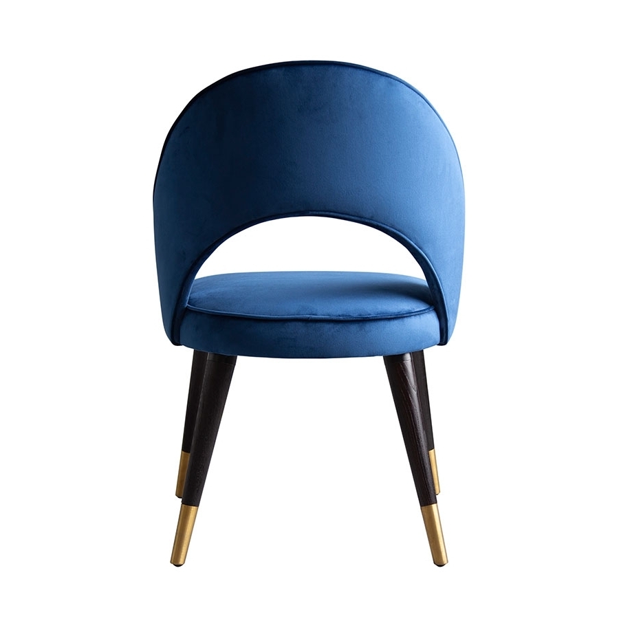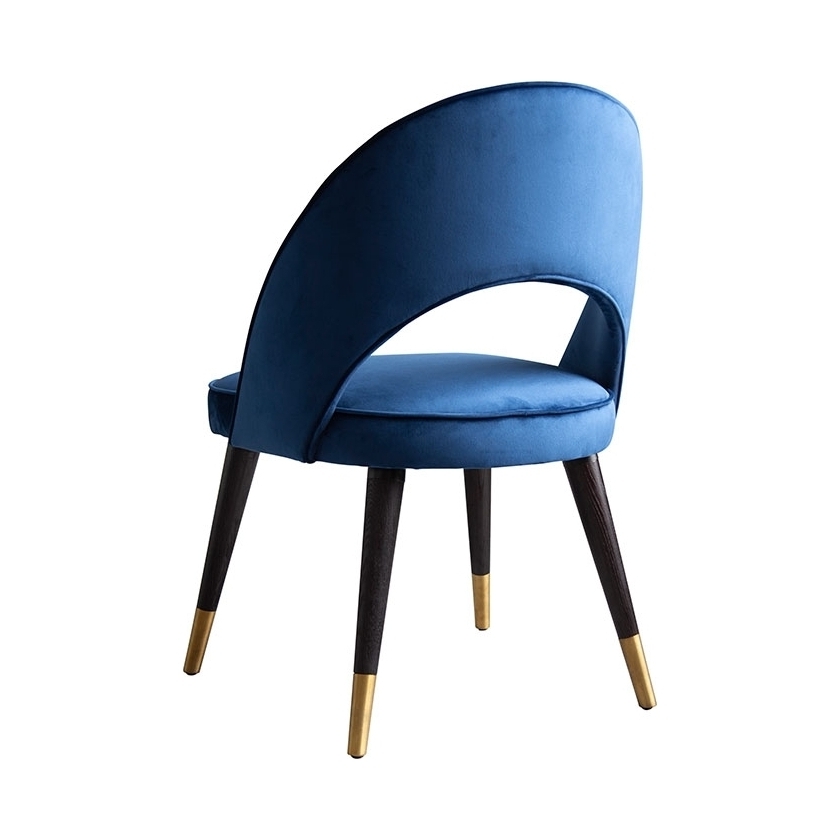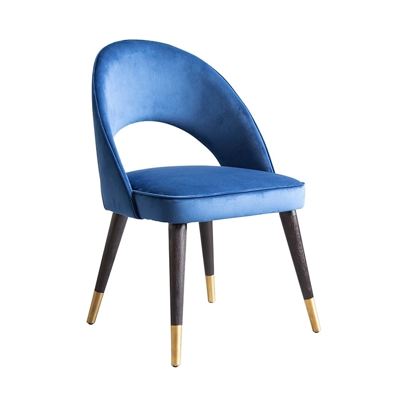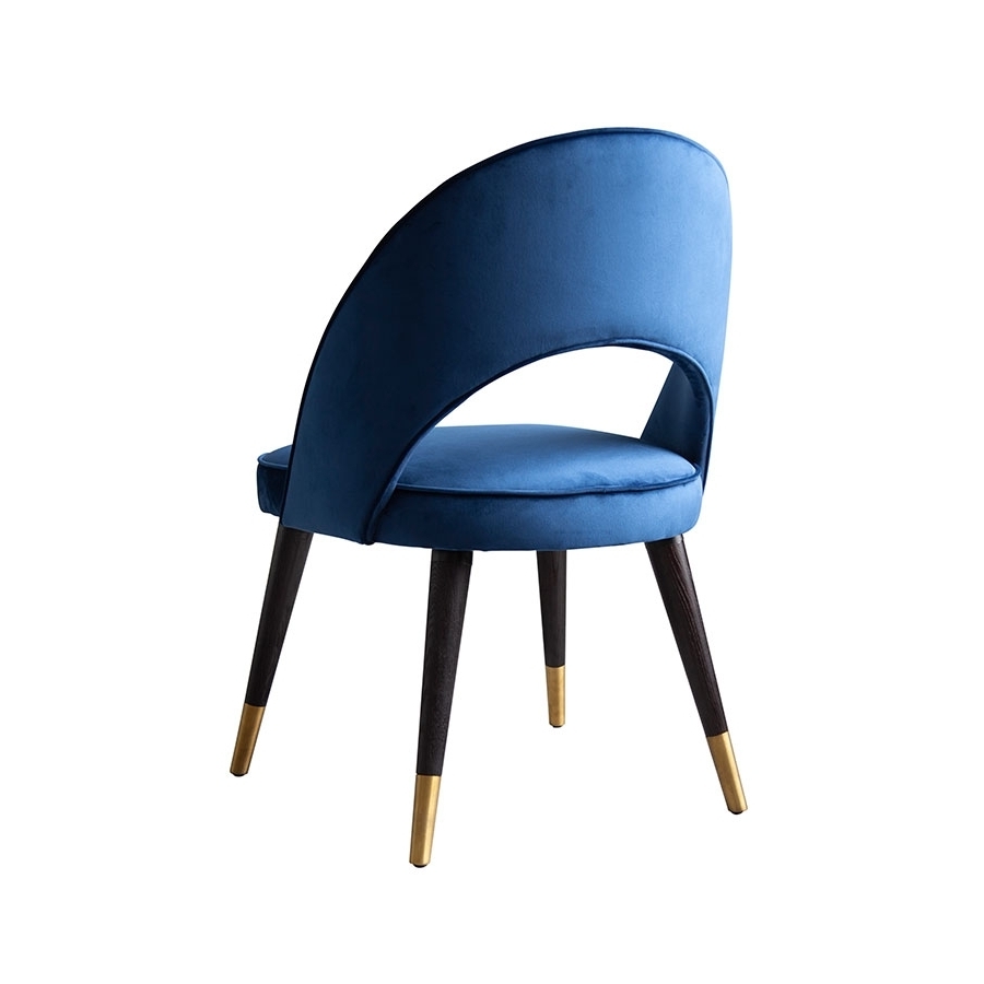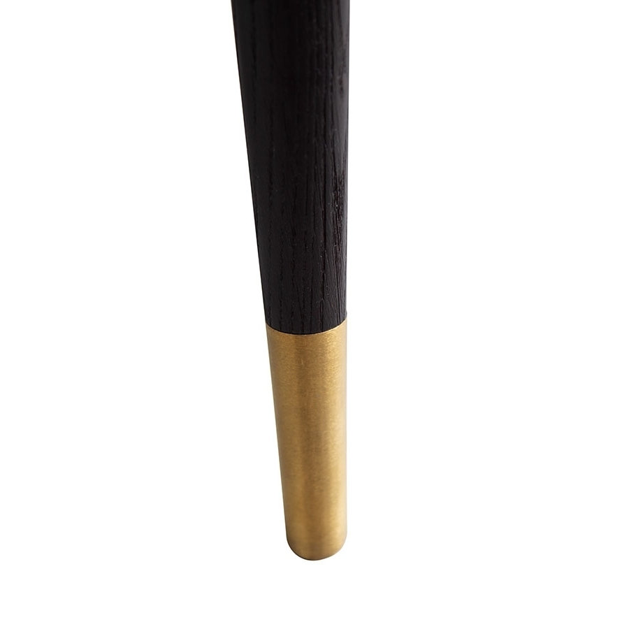 An extremely elegant dining chair inspired by 1960's Italian interiors Solid ash legs with very dark brown matt finish Handsome and practical brushed brass foot caps with plastic glides to underside Velvet upholstery fabric Partial assembly required