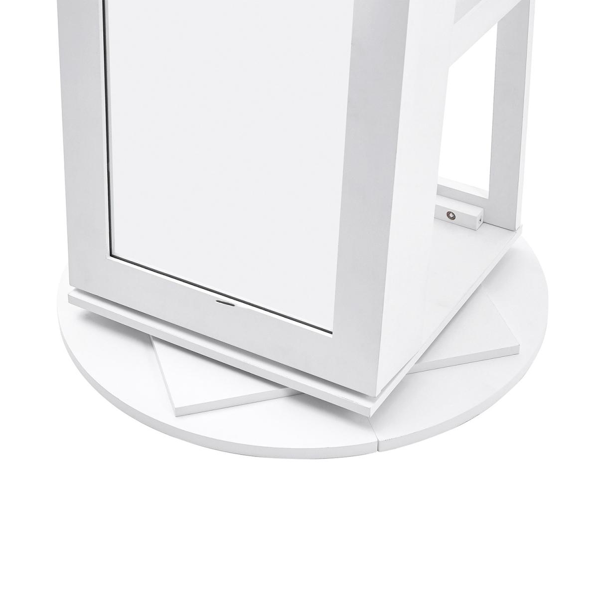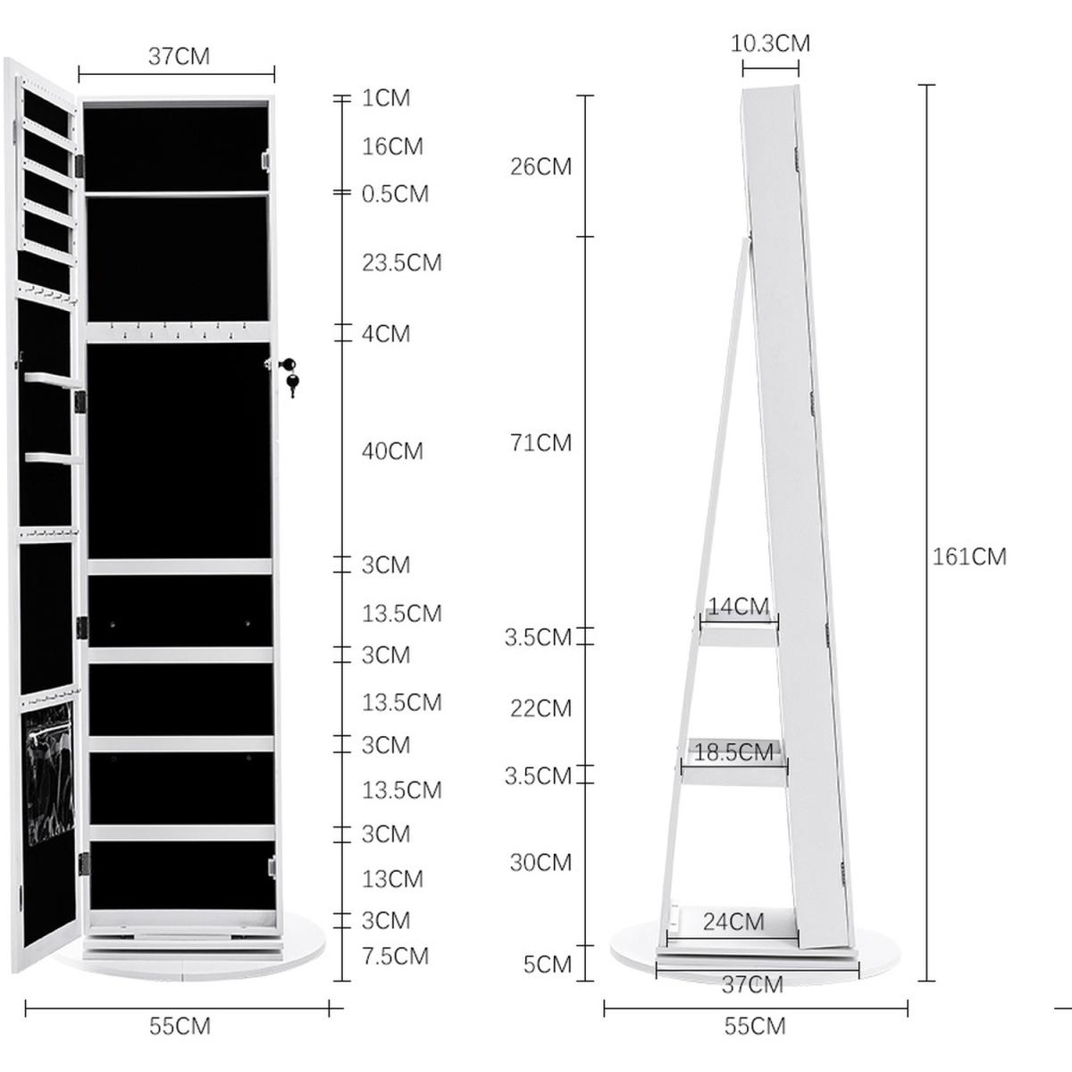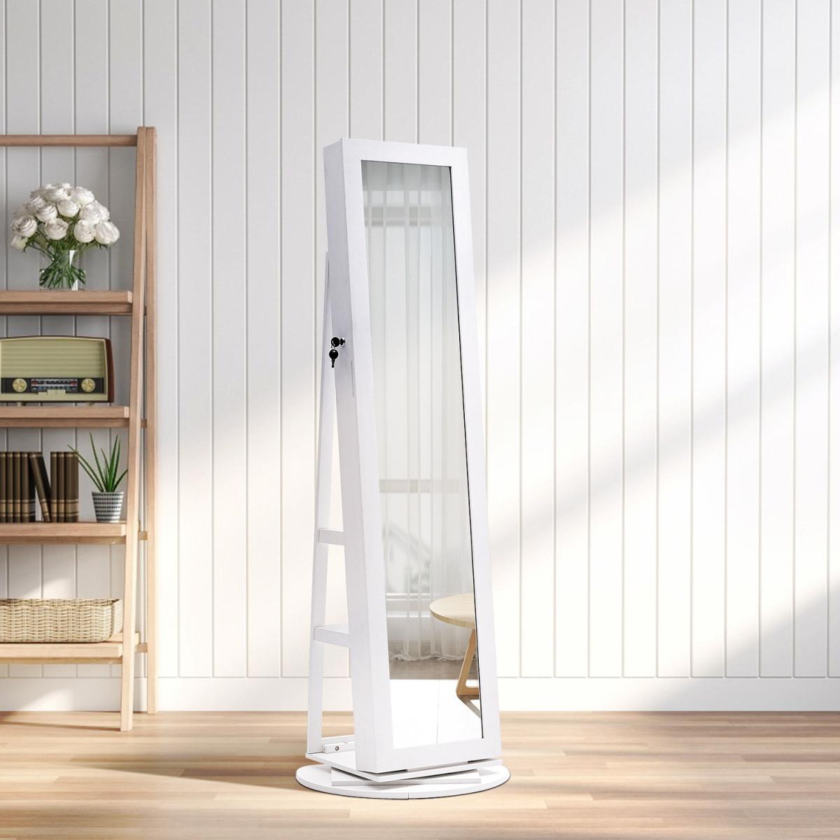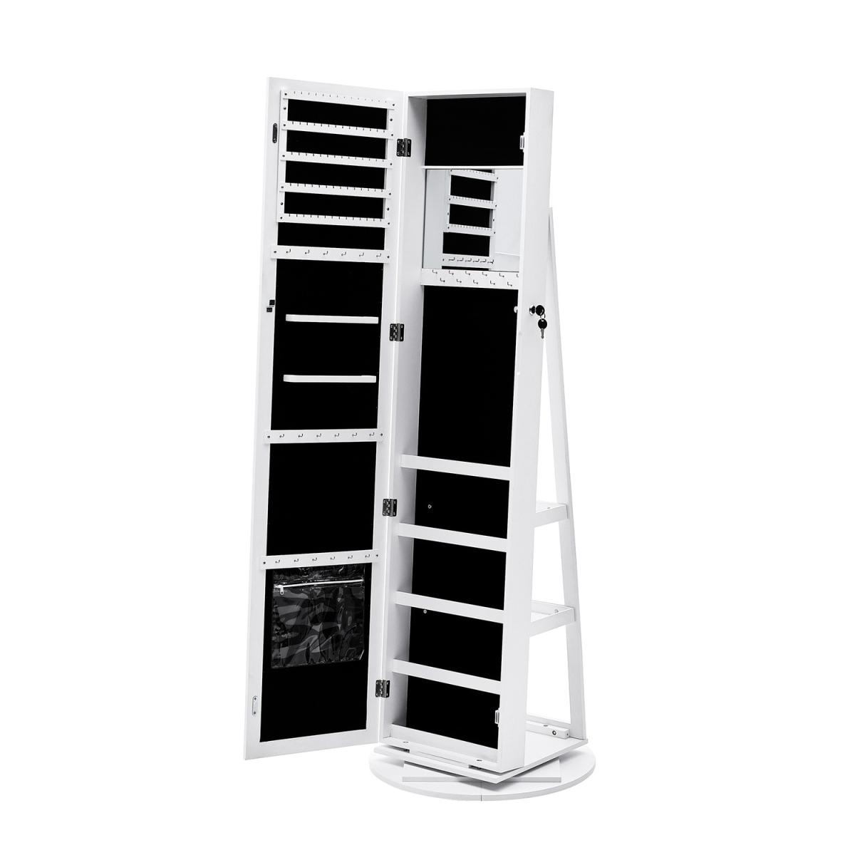 Keep all your jewellery organised and easily accessible with this storage mirror armoire. It looks like a delicate dressing mirror from the outside, while you open the cabinet, revealing black velvet lining, hooks, shelves and small storage drawers that can house your earings, bracelets, necklaces and rings. The cabinet door is built with a lock and 2 keys are included, help to securely store jewelry. Side compartments include multiple hooks which can help to keep your necklaces from getting tangled. The full-length mirror gives you a bright view, while the inside mirror makes it easier to dress yourself or aid in putting on earrings and necklaces. 360 revolving angle not only help find your essentials easily, but also give you a proper position to look at yourself in the mirror. The stable square base enhances stability to avoid tipping. The 3-layer shelf on the back of the jewelry cabinet can keep the jewelry cabinet well balanced while placing items. This jewellery cabinet is a fabulous addition to any dressing room or bedroom, and a beautiful addition to any style surrounding.