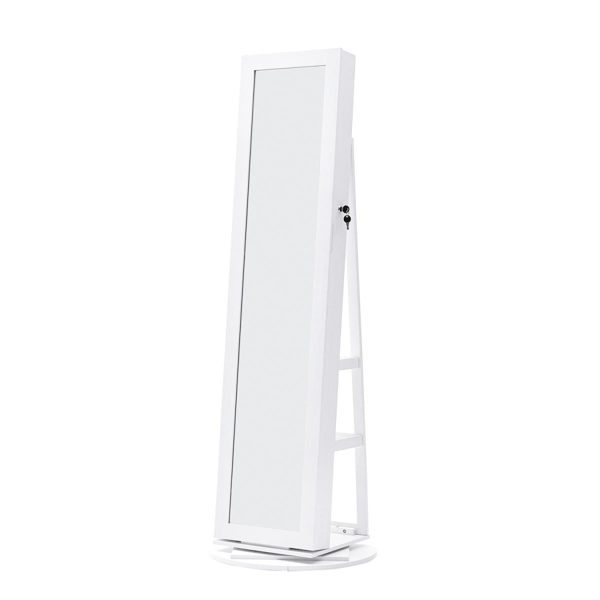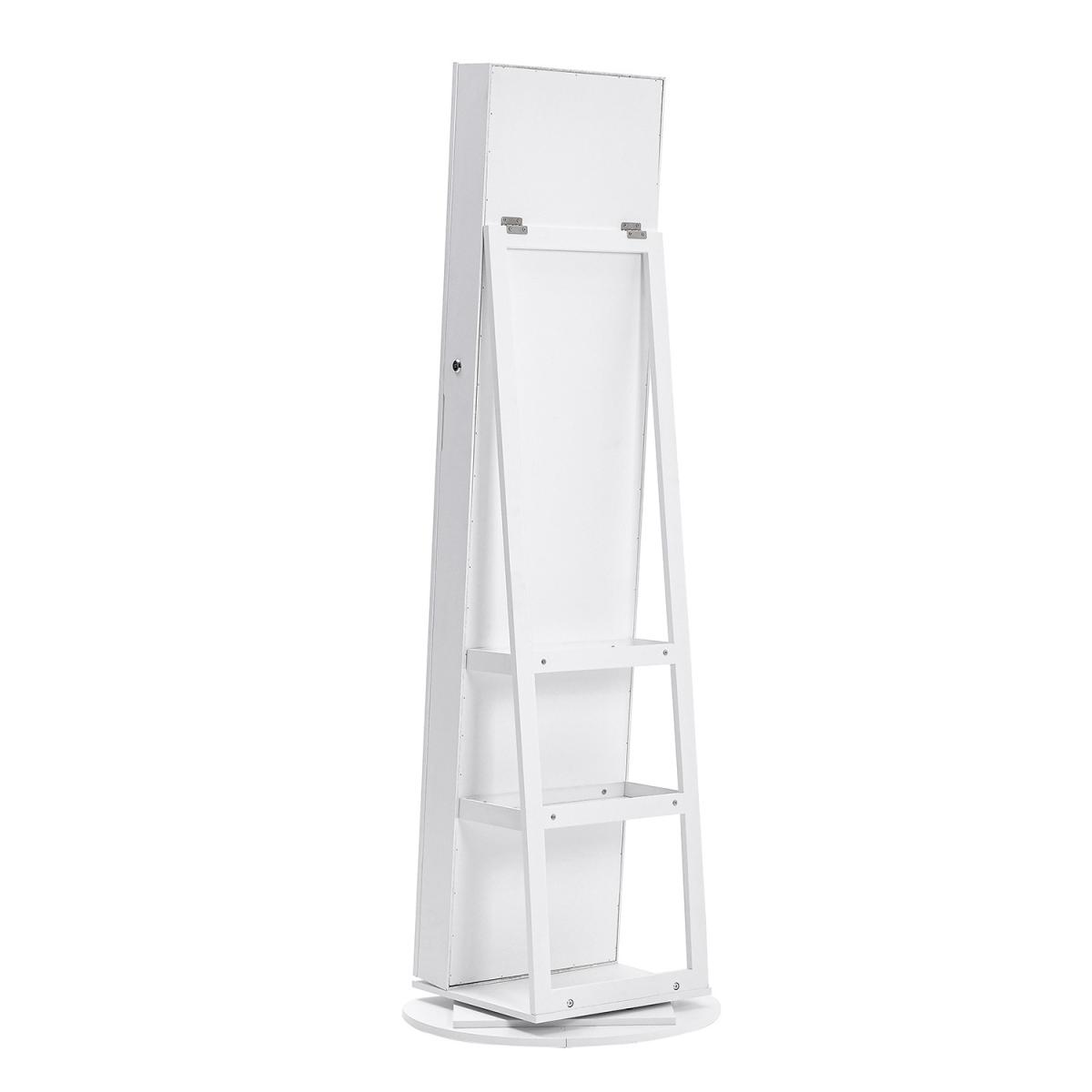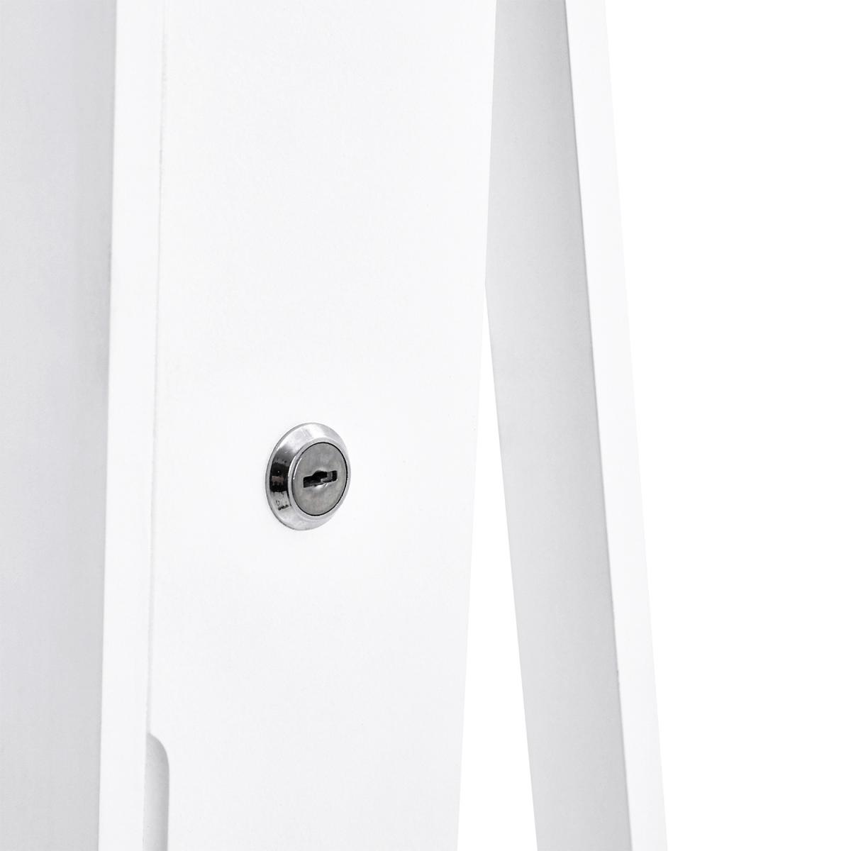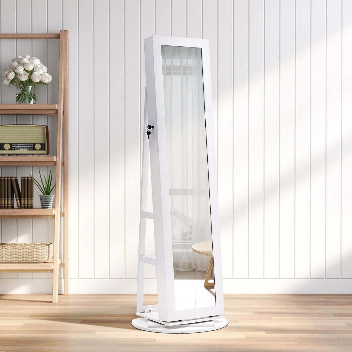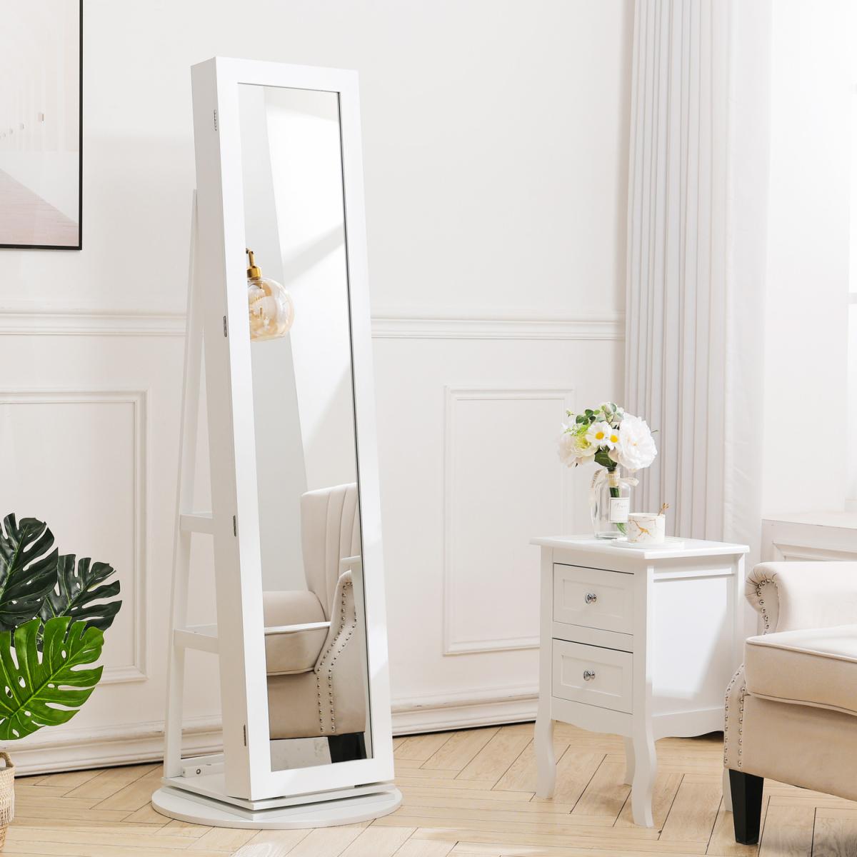 Keep all your jewellery organised and easily accessible with this storage mirror armoire. It looks like a delicate dressing mirror from the outside, while you open the cabinet, revealing black velvet lining, hooks, shelves and small storage drawers that can house your earings, bracelets, necklaces and rings. The cabinet door is built with a lock and 2 keys are included, help to securely store jewelry. Side compartments include multiple hooks which can help to keep your necklaces from getting tangled. The full-length mirror gives you a bright view, while the inside mirror makes it easier to dress yourself or aid in putting on earrings and necklaces. 360 revolving angle not only help find your essentials easily, but also give you a proper position to look at yourself in the mirror. The stable square base enhances stability to avoid tipping. The 3-layer shelf on the back of the jewelry cabinet can keep the jewelry cabinet well balanced while placing items. This jewellery cabinet is a fabulous addition to any dressing room or bedroom, and a beautiful addition to any style surrounding.