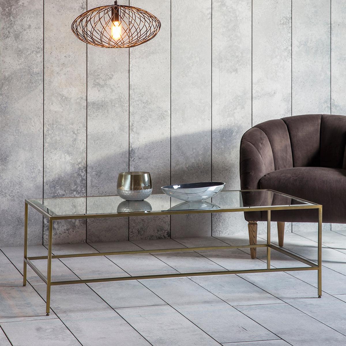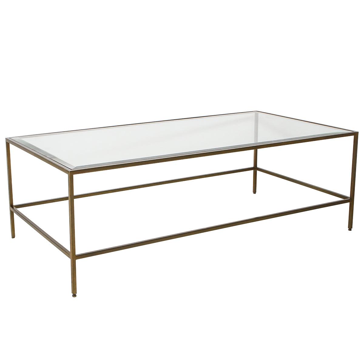 With a sleek design this coffee table is sure to suit any sophisticate interior, featuring an antique metal frame in a bronze finish with an inlaid bevelled glass top.