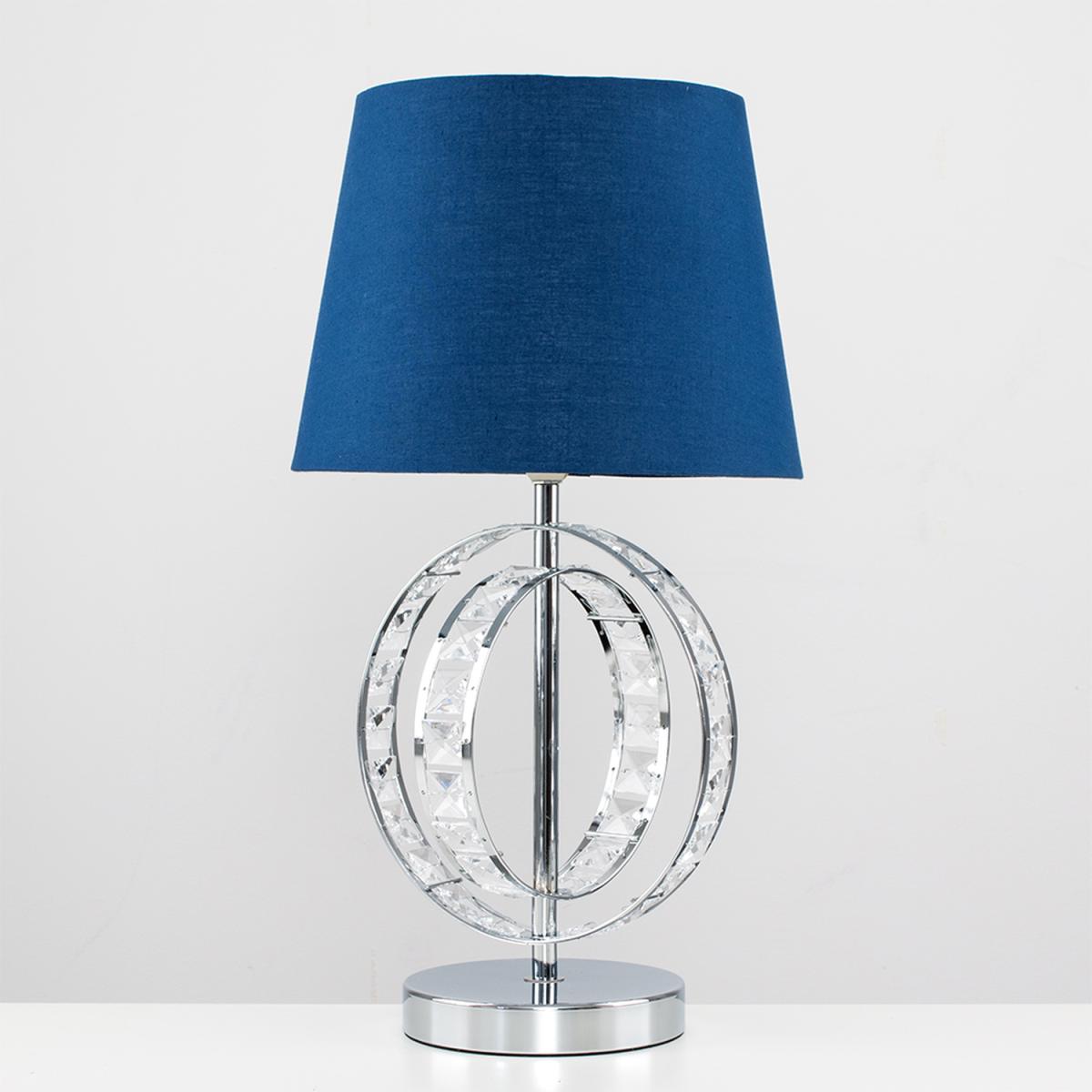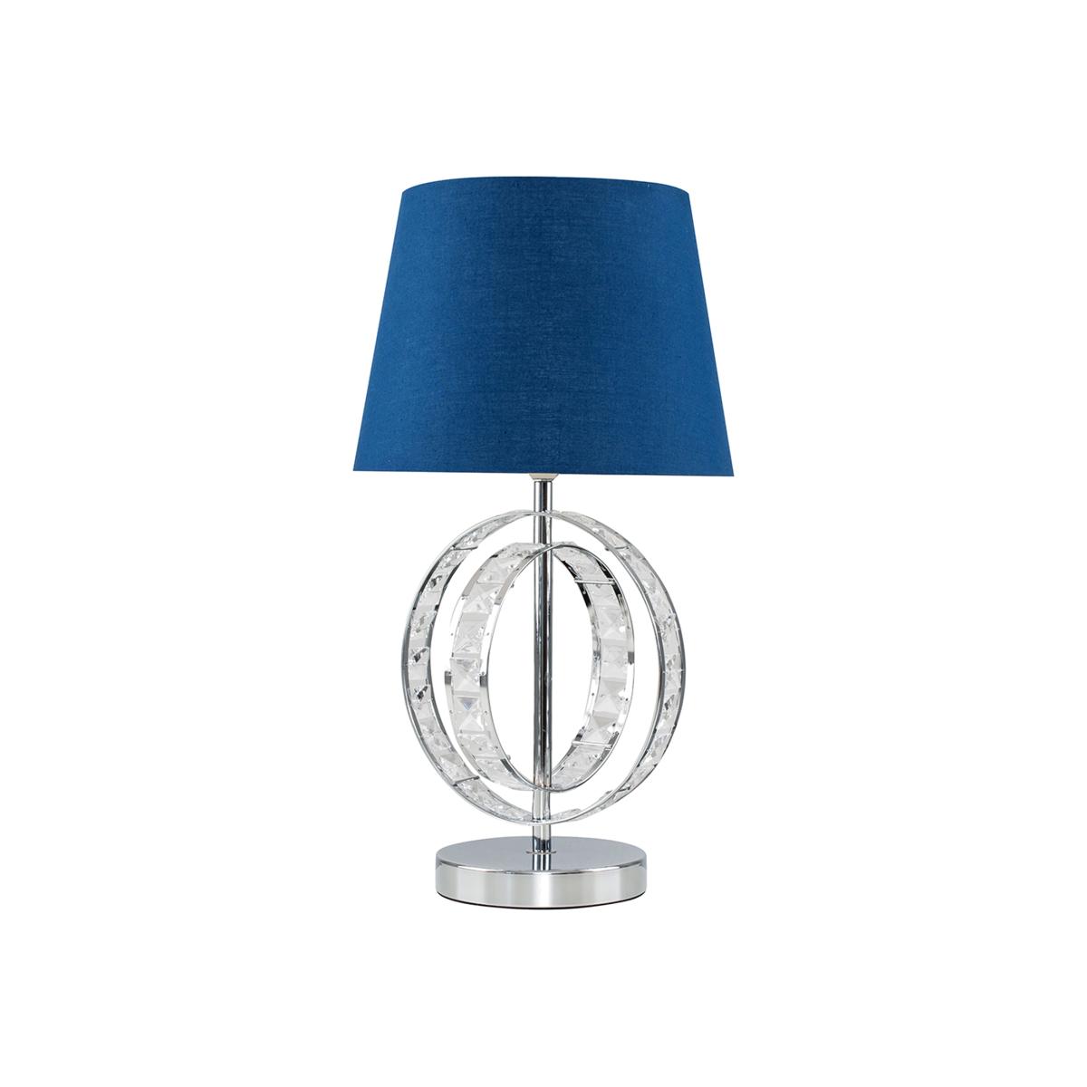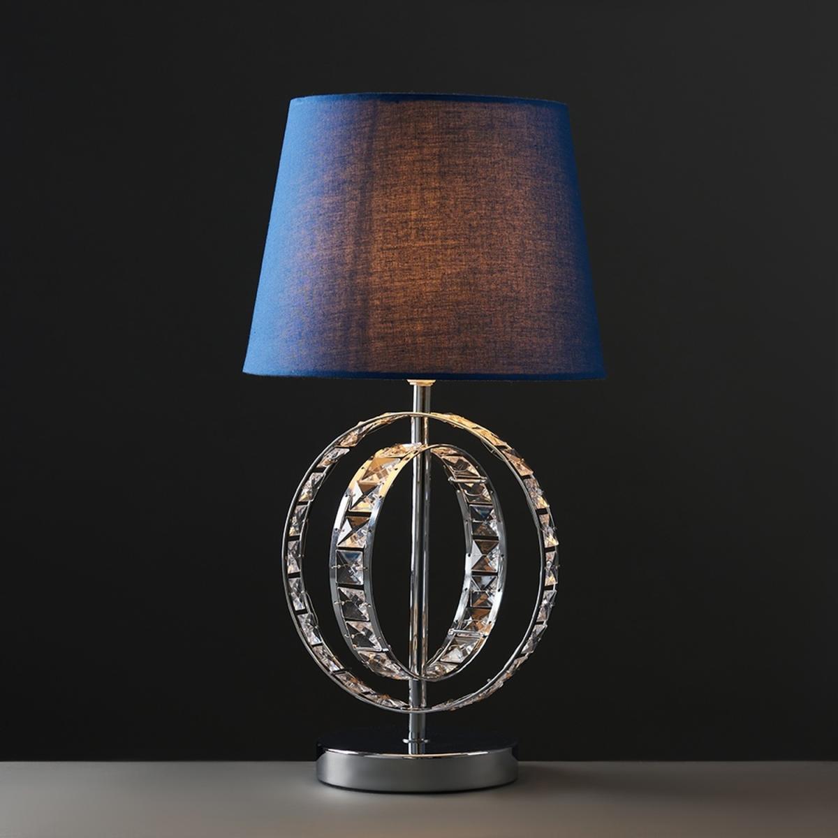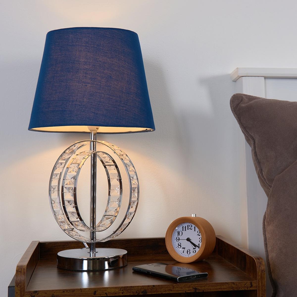 Modern metal touch table lamp in a polished chrome finish, featuring a beautiful acrylic jewel effect intertwined double hoop design. Lamp comes complete with a navy blue fabric tapered shaped light shade. This light is a great focal point - the right fitting can make a real style statement and complete your living space look. Simply touch the metal base to turn the lamp on - no more trying to find the switch at night. The light can be set to 4 stages, off, a low level light for mood lighting, a medium level light for general lighting and a high level light which is the brightest setting to create an intense pool of light. Table lamps are a great way to bring additional lighting to a room or you can use them reduce your main light output, and create a more relaxing moodatmosphere. Please Note These lamps require dimmable bulbs. Not suitable for standard LED or energy saving bulbs. Please note this shade is flat packed and requires self assembly.
