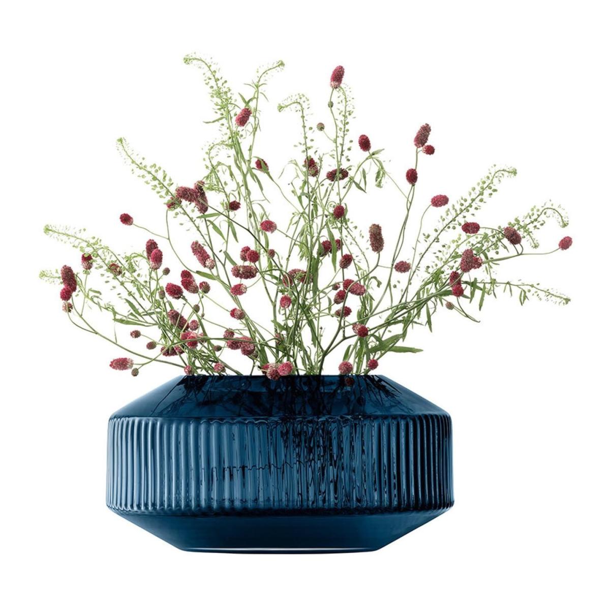 Make a striking statement with this stunning, mouth-blown vase expertly crafted from a choice of clear or sapphire blue glass. This beautiful wide vase makes the most of its angles and the band of corrugated texture takes inspiration from contemporary architecture. Please note that due to its handmade nature, the size of each piece may vary slightly.