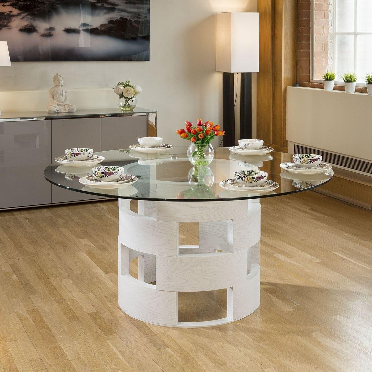 Round 1.6 Glass Top White Oak Dining Table 6 White Extra Padded Chairs