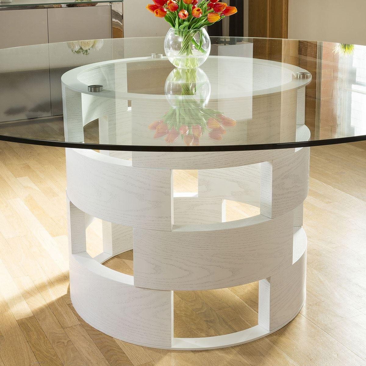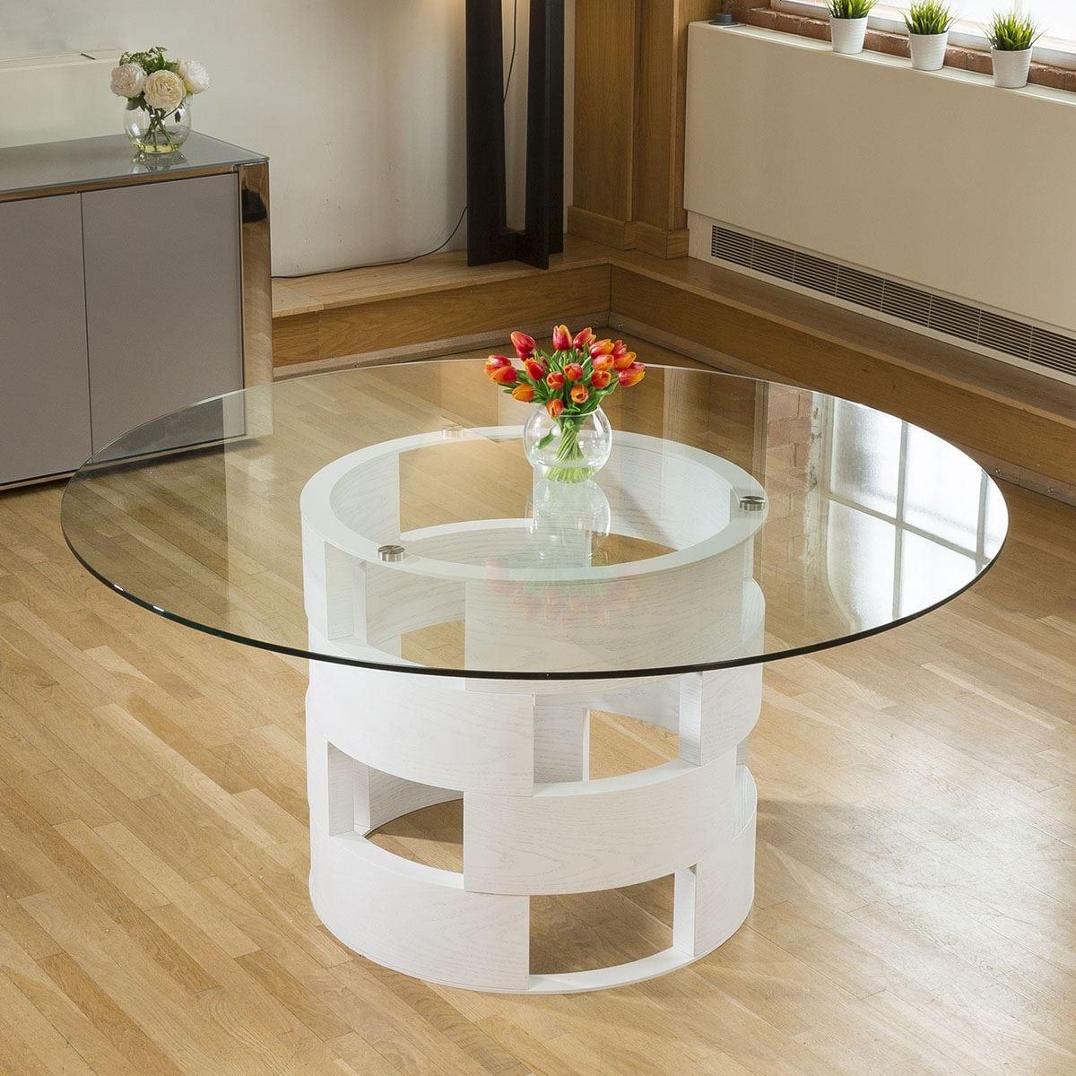 Quatropi Designer Large Clear Glass Topped Round Dining Table & 6 Extra Padded White Faux Leather Chairs. Special features include 10mm tempered glass top. Beautifully crafted and will comfortably seat up to 8 - extra chairs available upon request. These luxurious high end cantilever chairs have a stainless steel base. Assembly and removal of packaging service available at an extra charge - please call for quote.