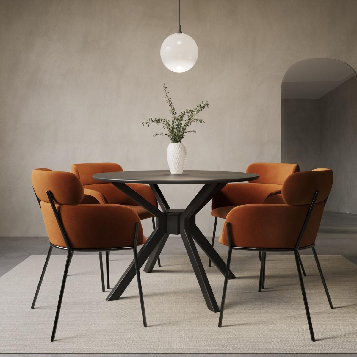 The Karie & Isla dining set is perfect for smaller spaces, offering comfortable dining for up to four people without overwhelming your room. The black round pedestal table features clean lines and timeless simplicity, while the burnt orange velvet chairs add a pop of colour and warmth. The Isla chairs are upholstered in recycled velvet made from plastic bottles, offering a luxurious feel with an eco-conscious edge. With curved backs, armrests and plush padding, the chairs are built for long meals and laid-back entertaining. Solid wood construction and sturdy metal frames ensure this set stands up to everyday use, making it a practical and stylish choice for modern dining. Whether you’re hosting dinner, gathering with friends, or simply enjoying your morning coffee, the Karie round dining table and Isla velvet chairs deliver the perfect blend of style, comfort and sustainability. The compact yet striking table creates a sociable, space-saving setting, while the plush, recycled velvet chairs add a refined pop of colour and a soft, supportive sit. Together, they form a thoughtfully designed set that enhances everyday living and makes a lasting impression in any modern home.